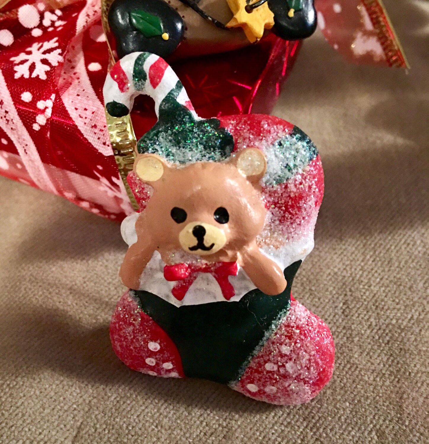 Vintage resin sparkly bear in a stocking Christmas Pin -comes gift bagged & ribboned