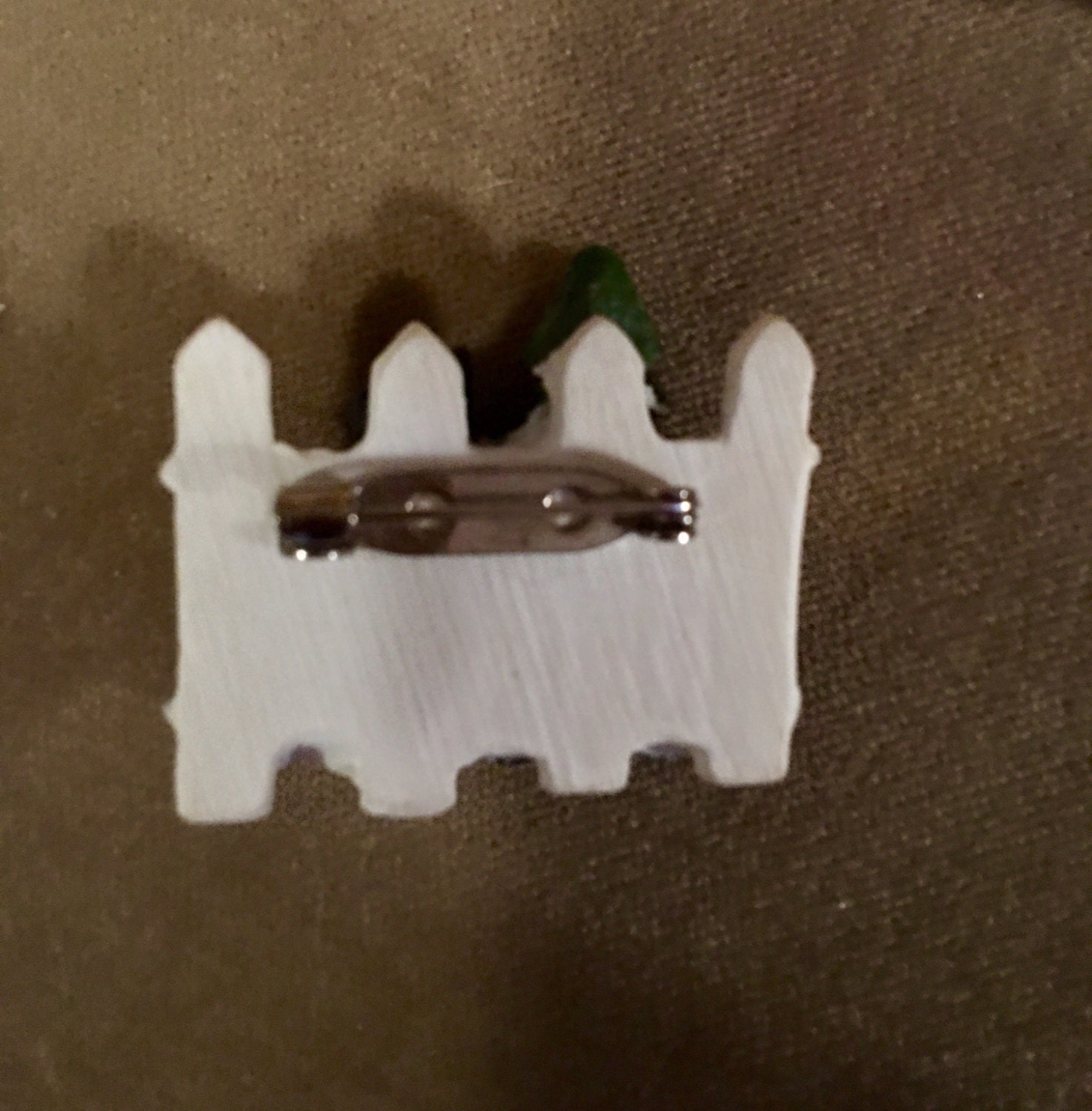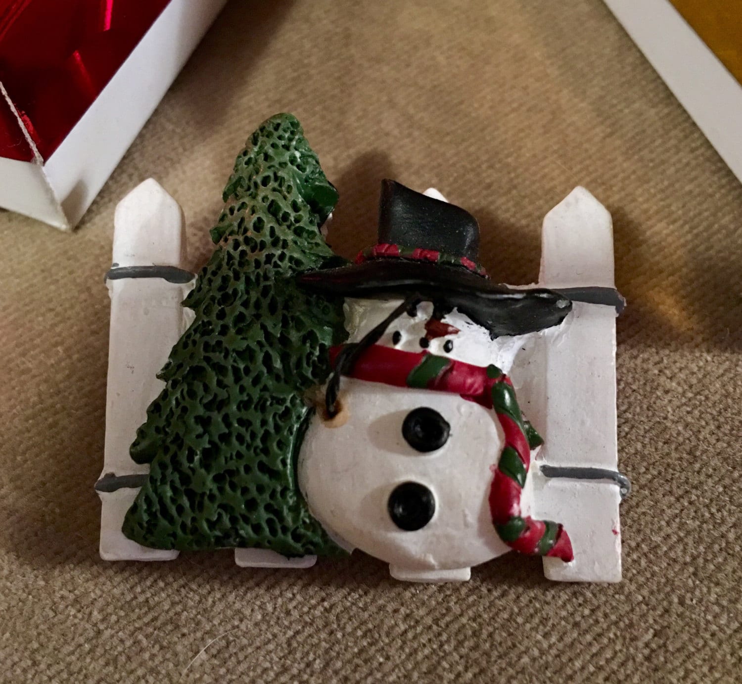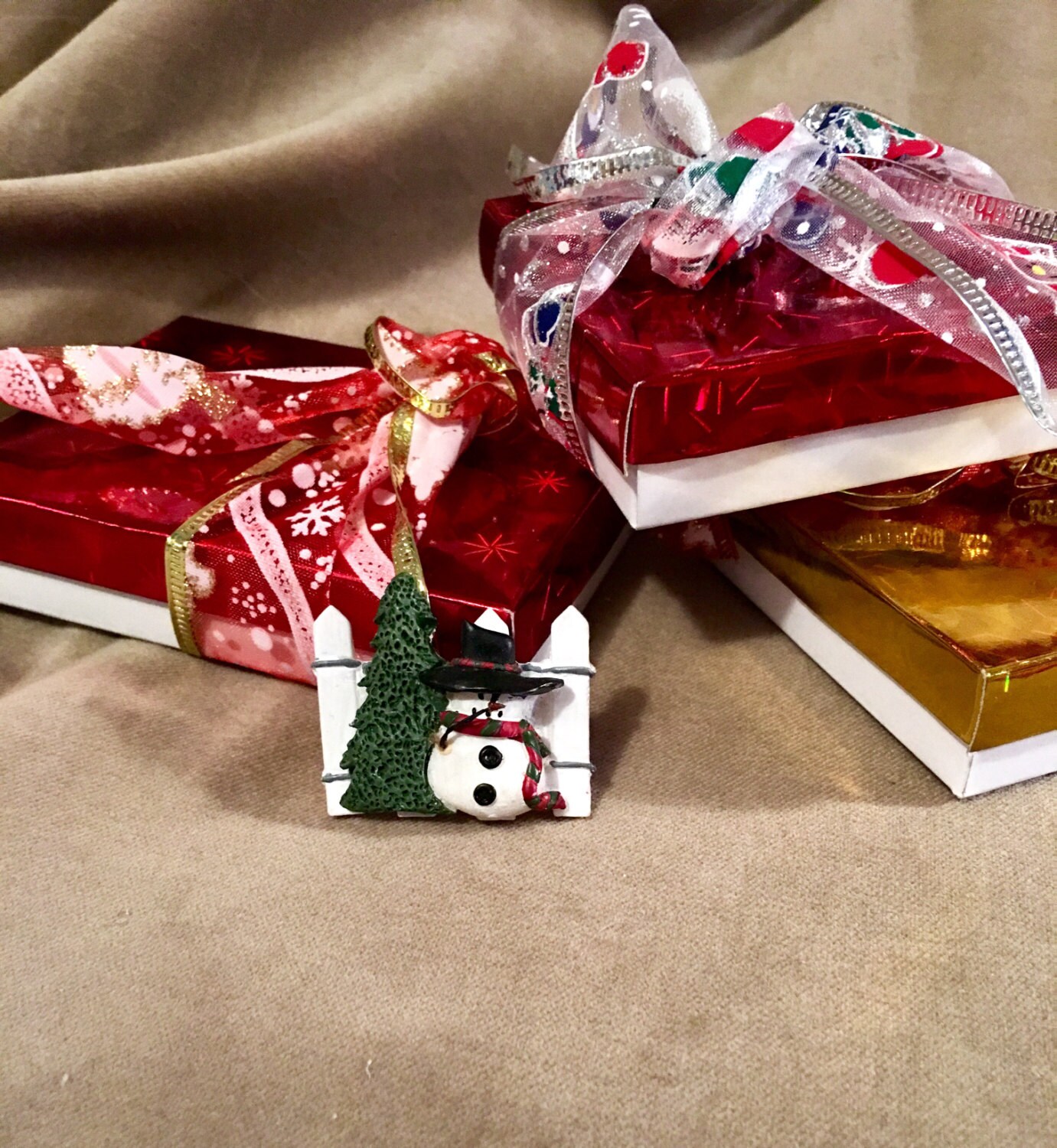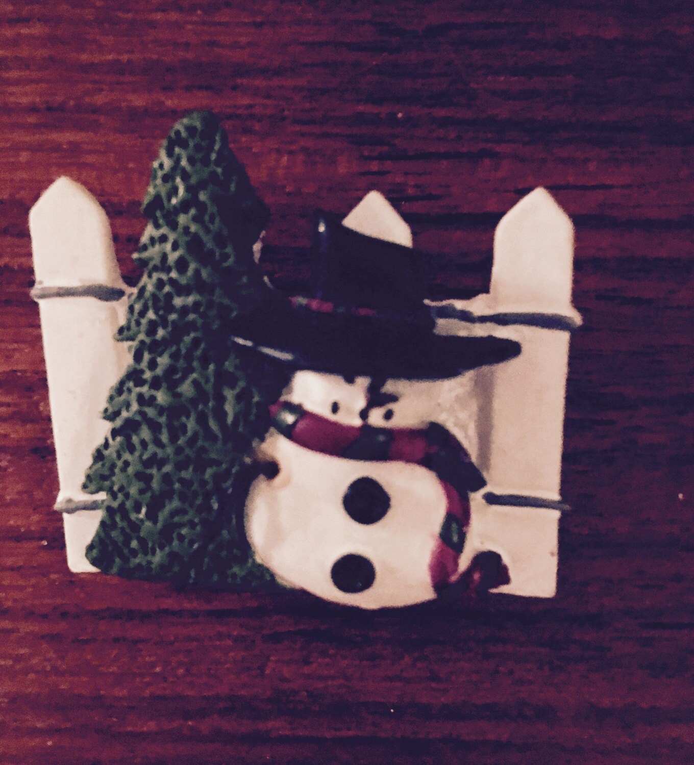 Festive Vintage Christmas snowman w/ picket fence & tree holiday pin brooch comes giftboxed and ribboned