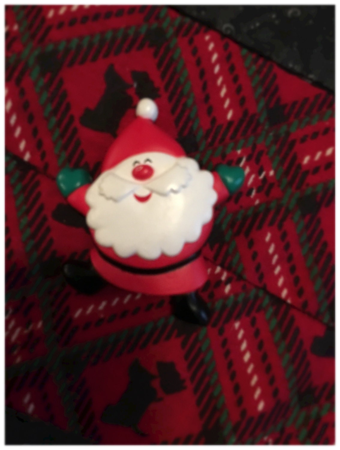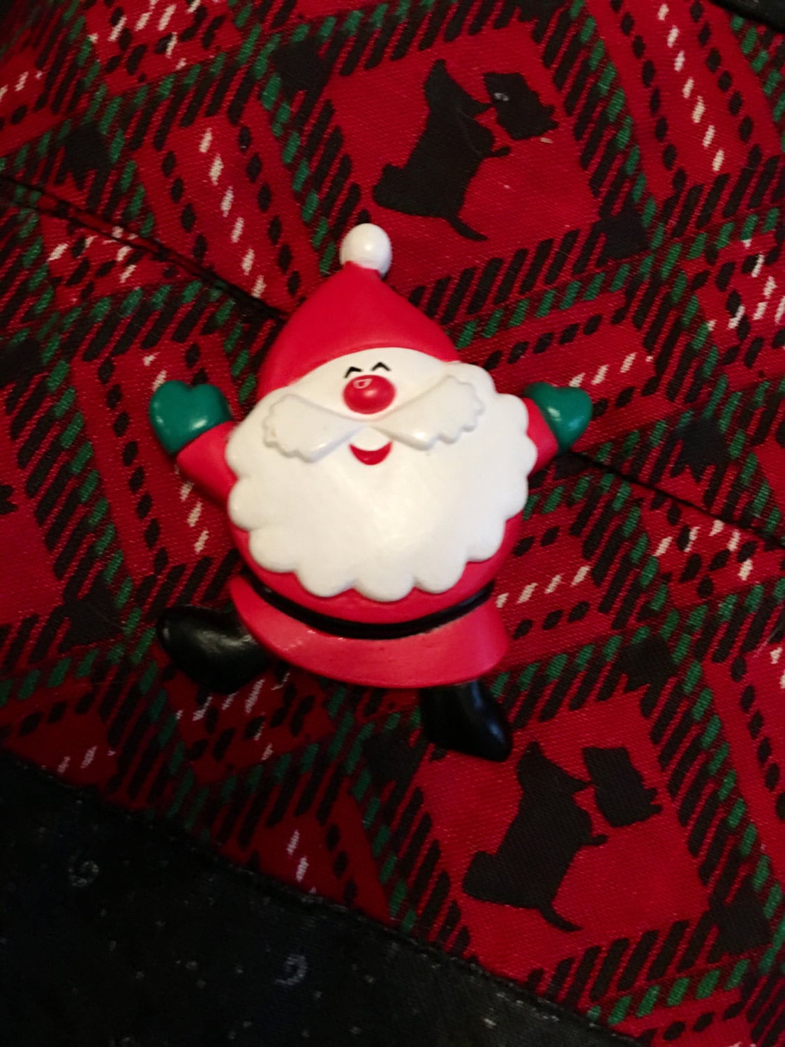 This is a nice vintage 70's hallmark cards Santa melamine Christmas pin. There's a tiny little scuff on his nose ( it happened easily: b) surely a sign of good times he's had!