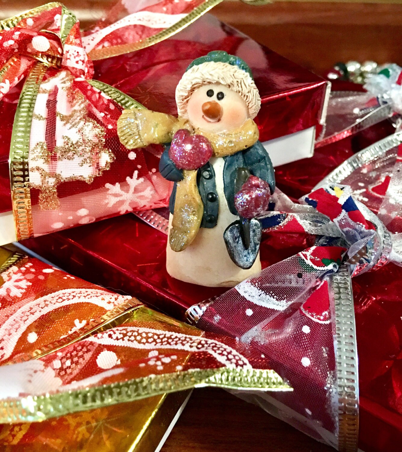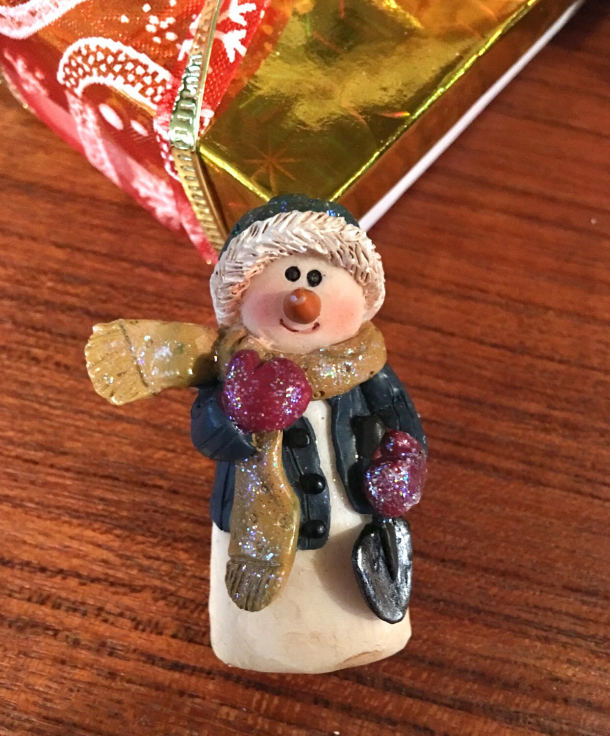 Vintage resin sparkly Christmas snowman holding a snow shovel comes giftboxed & ribboned