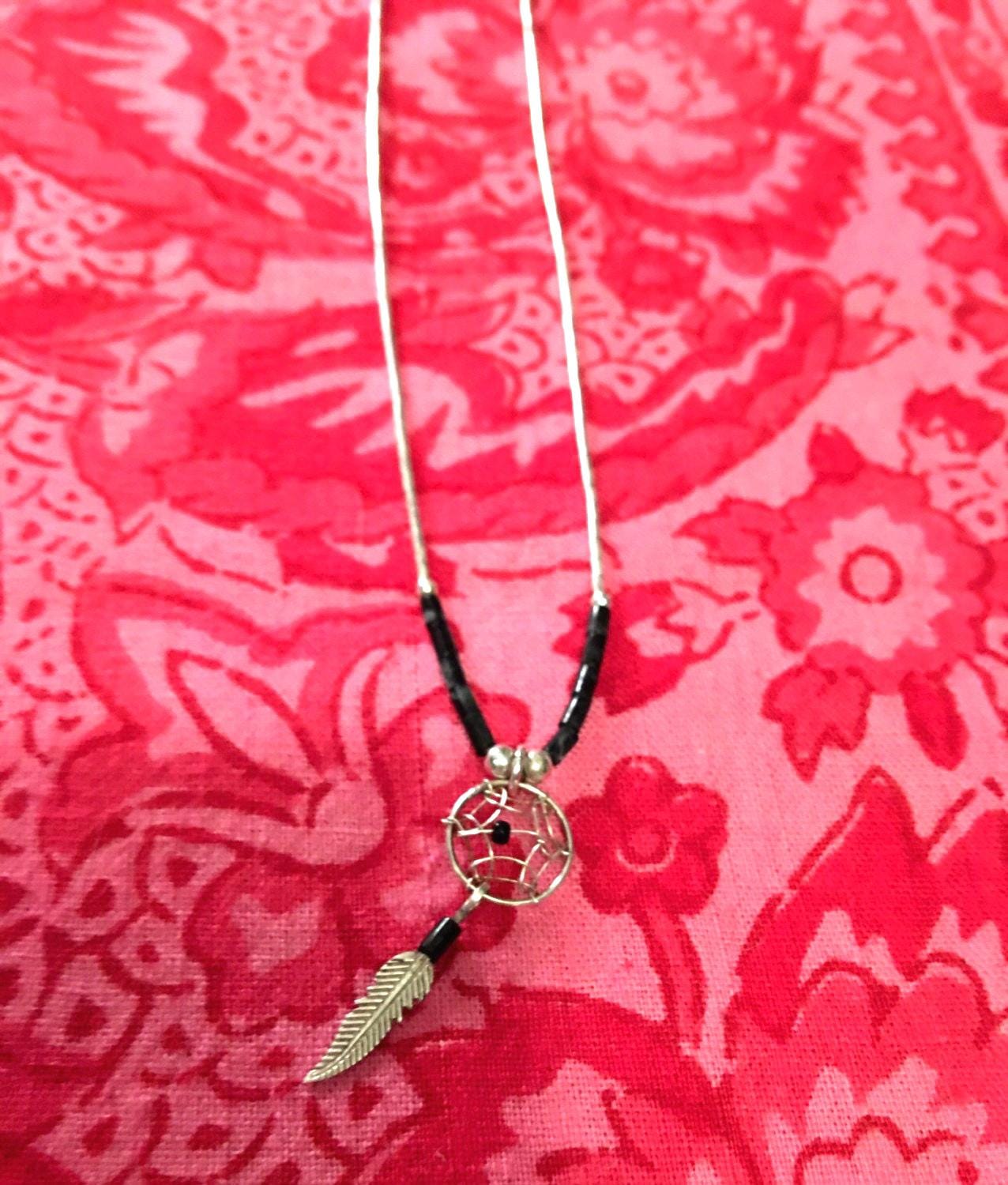 Delicate vintage Southwestern dreamcatcher necklace with liquid silver & black stone beads & nice screwback closure.