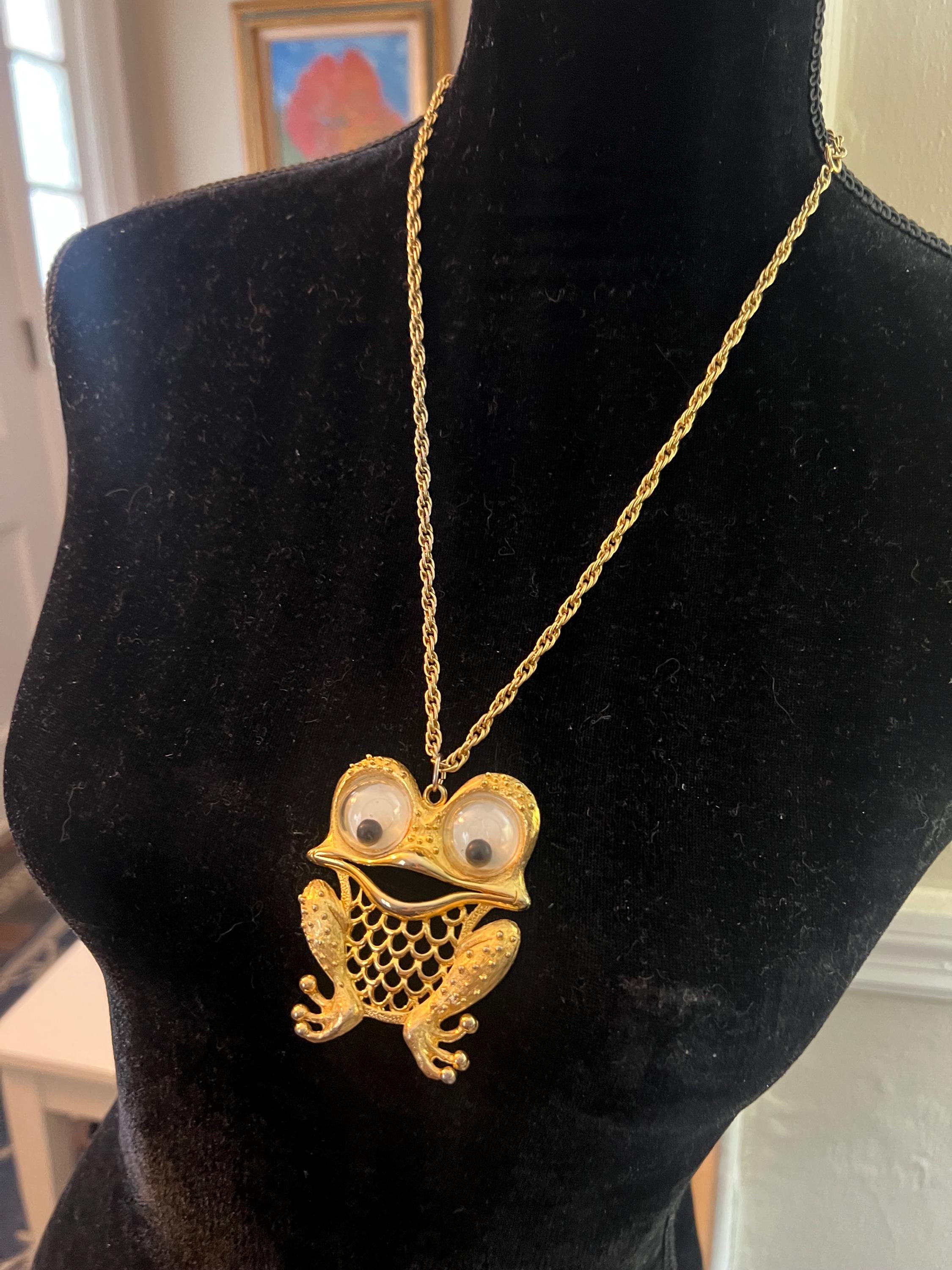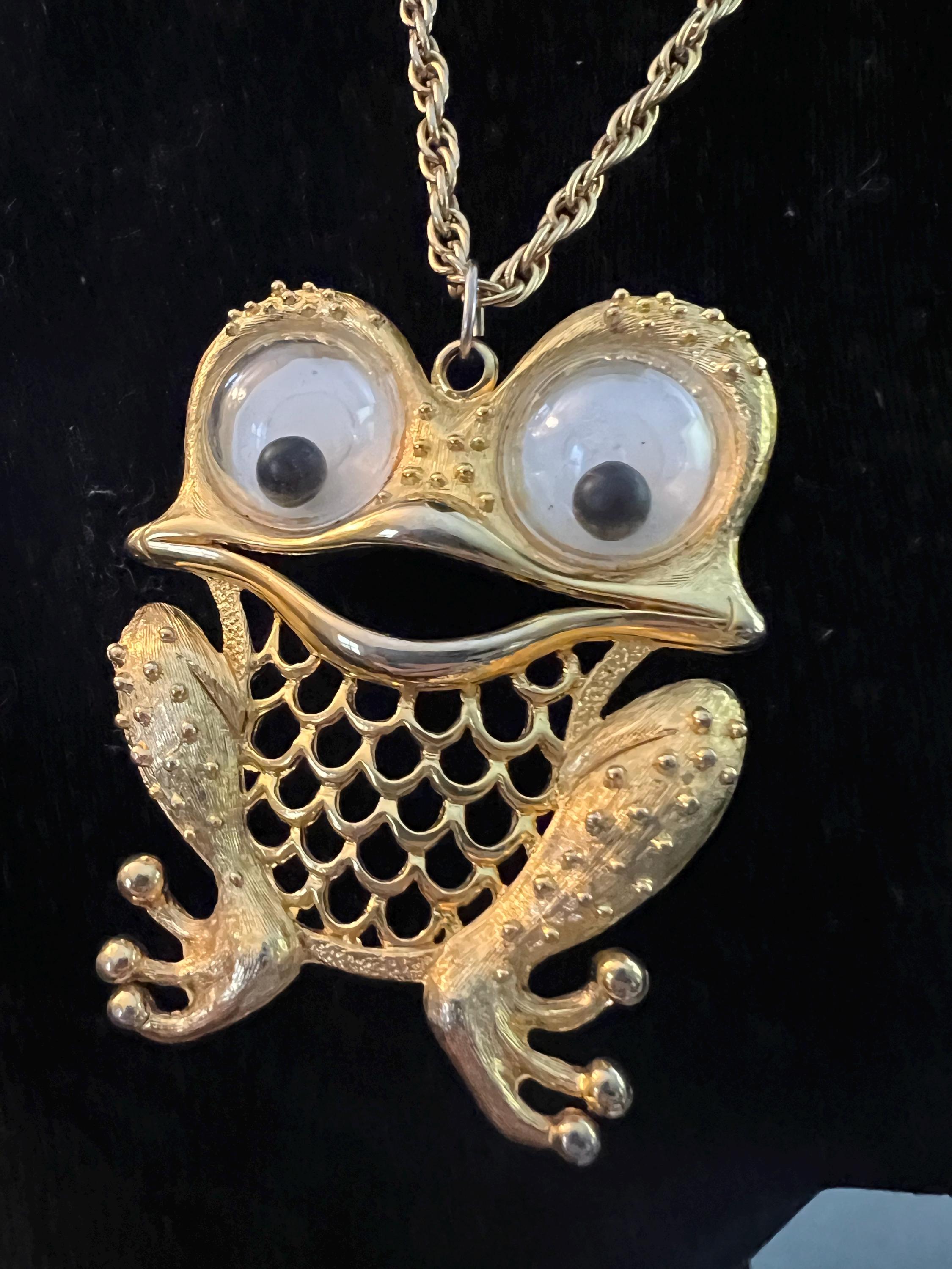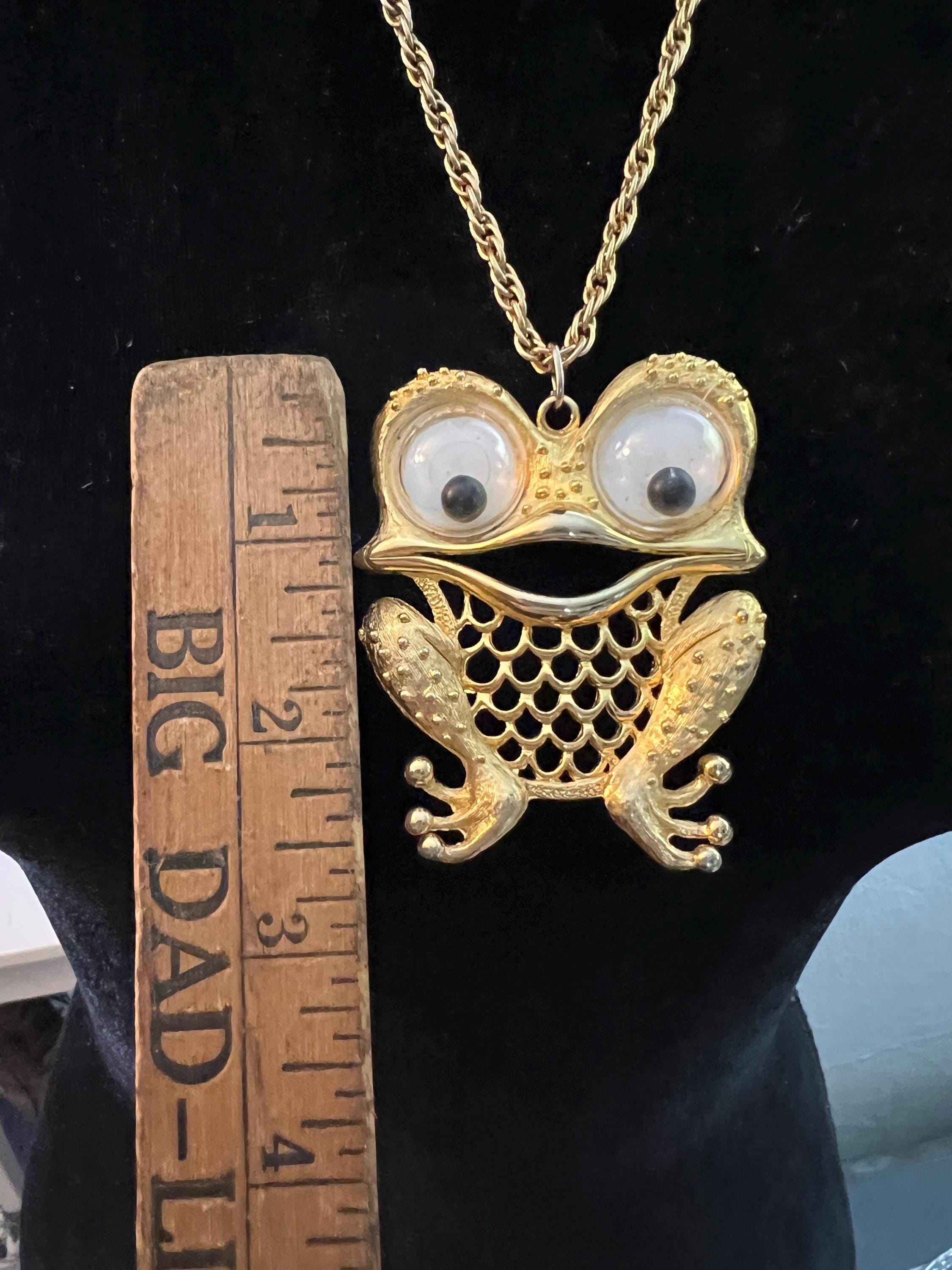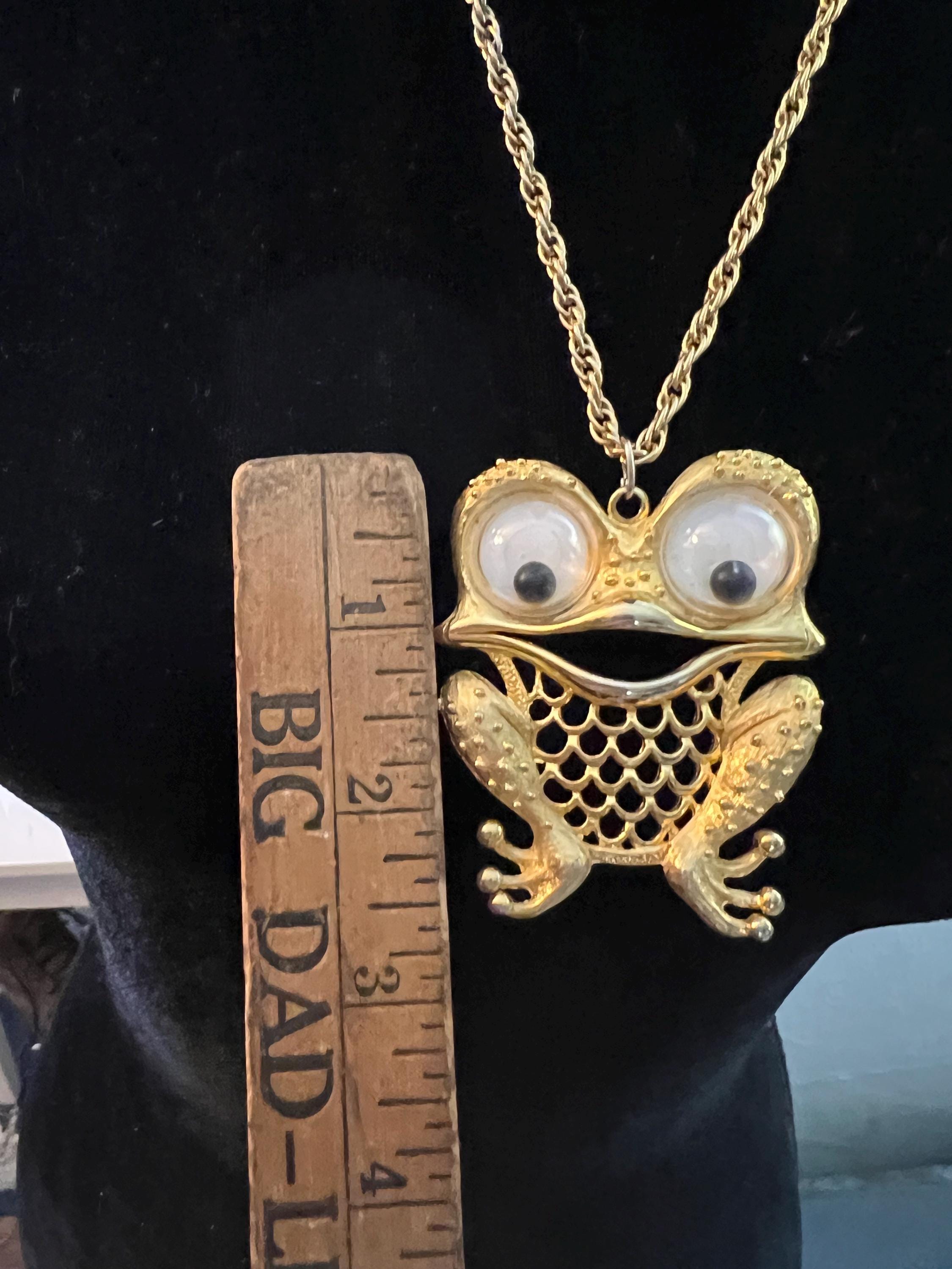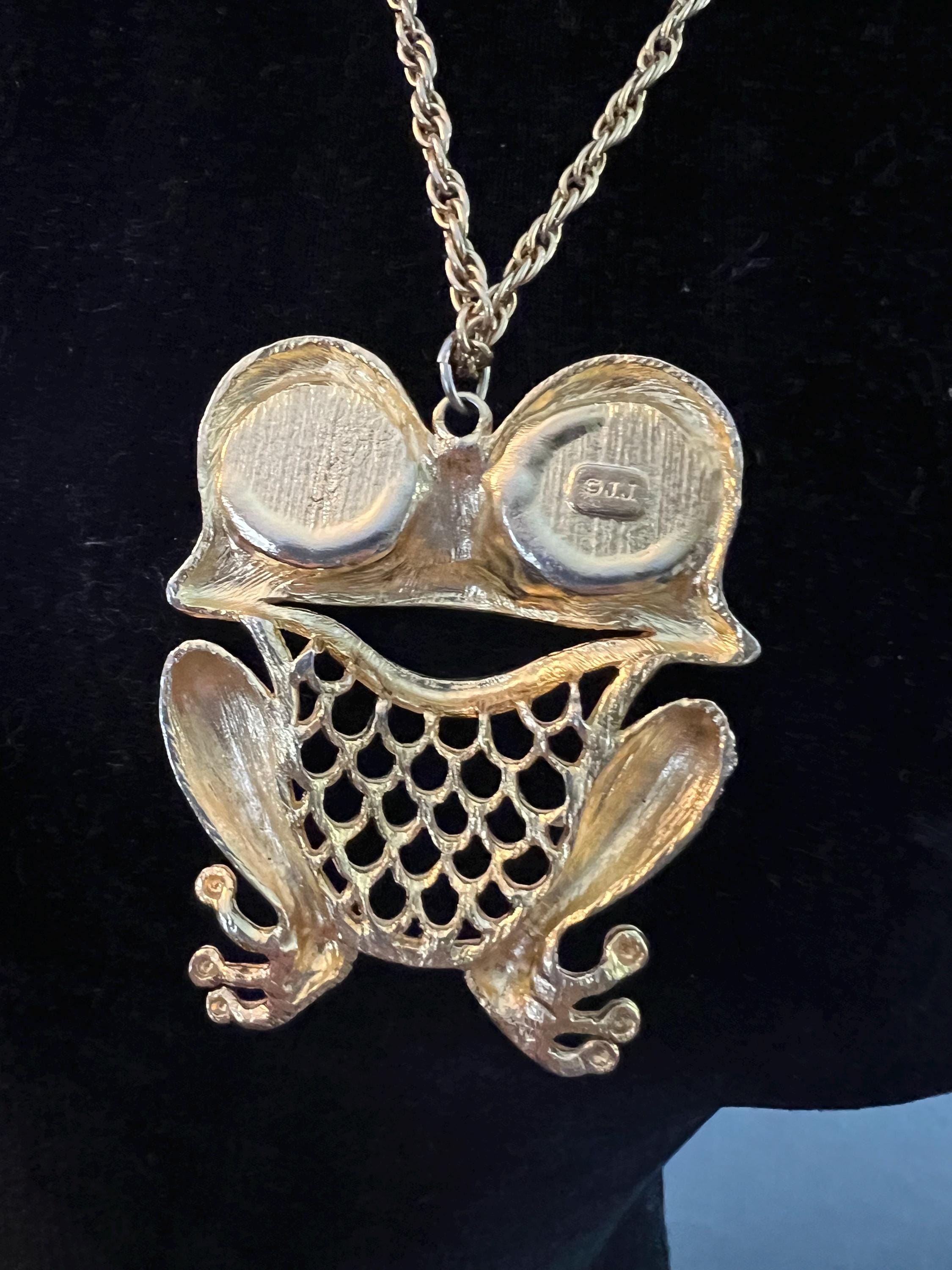 Vintage JJ Googly Eye Frog Pendant Necklace: Kitsch Glamour Jewelry
