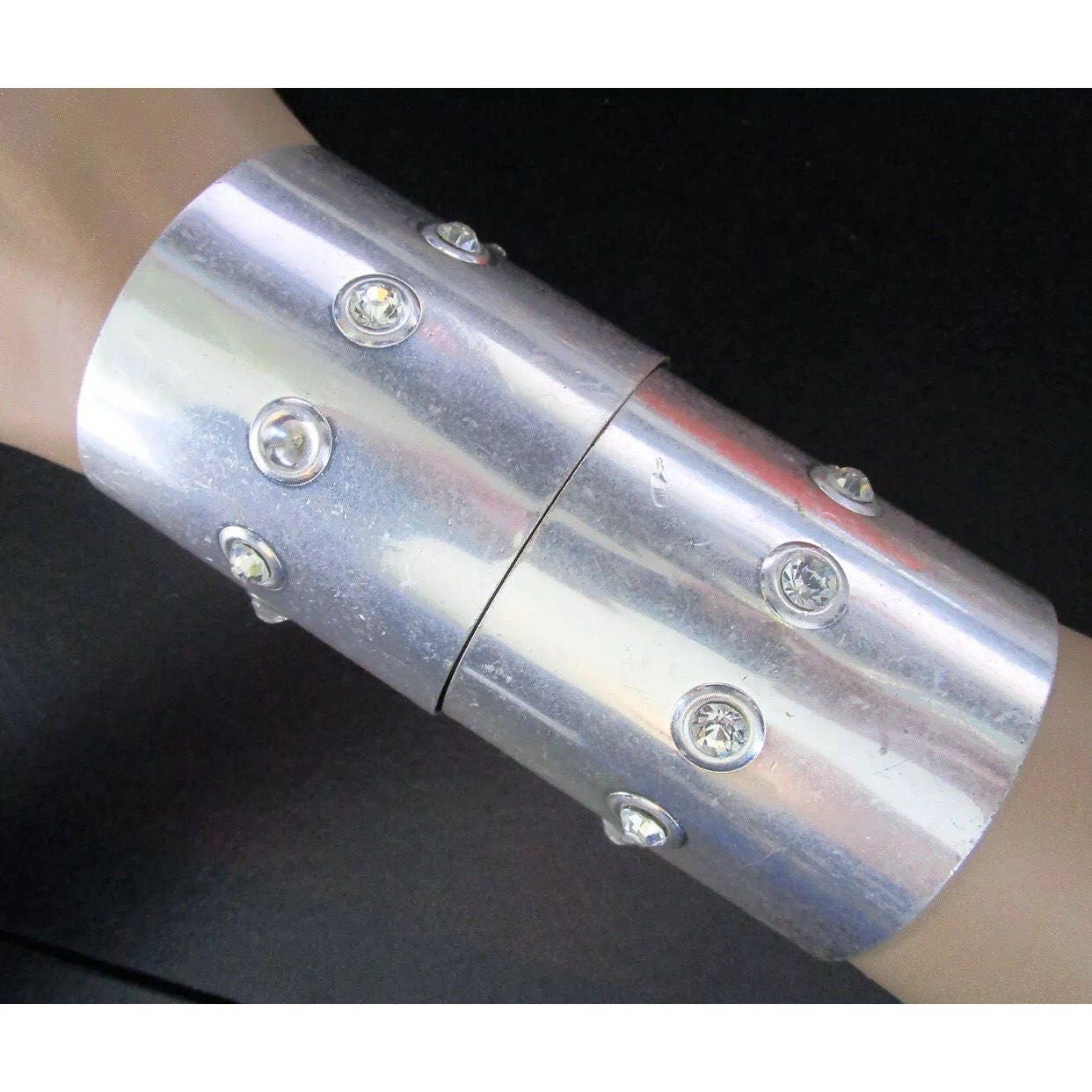 A Futuristic Gothic Modernist Set of Silvertone Chrome Cuffs with Large Rhinestone Studs, 90s Glam Rave Jewelry,Unisex Cuff Bracelets