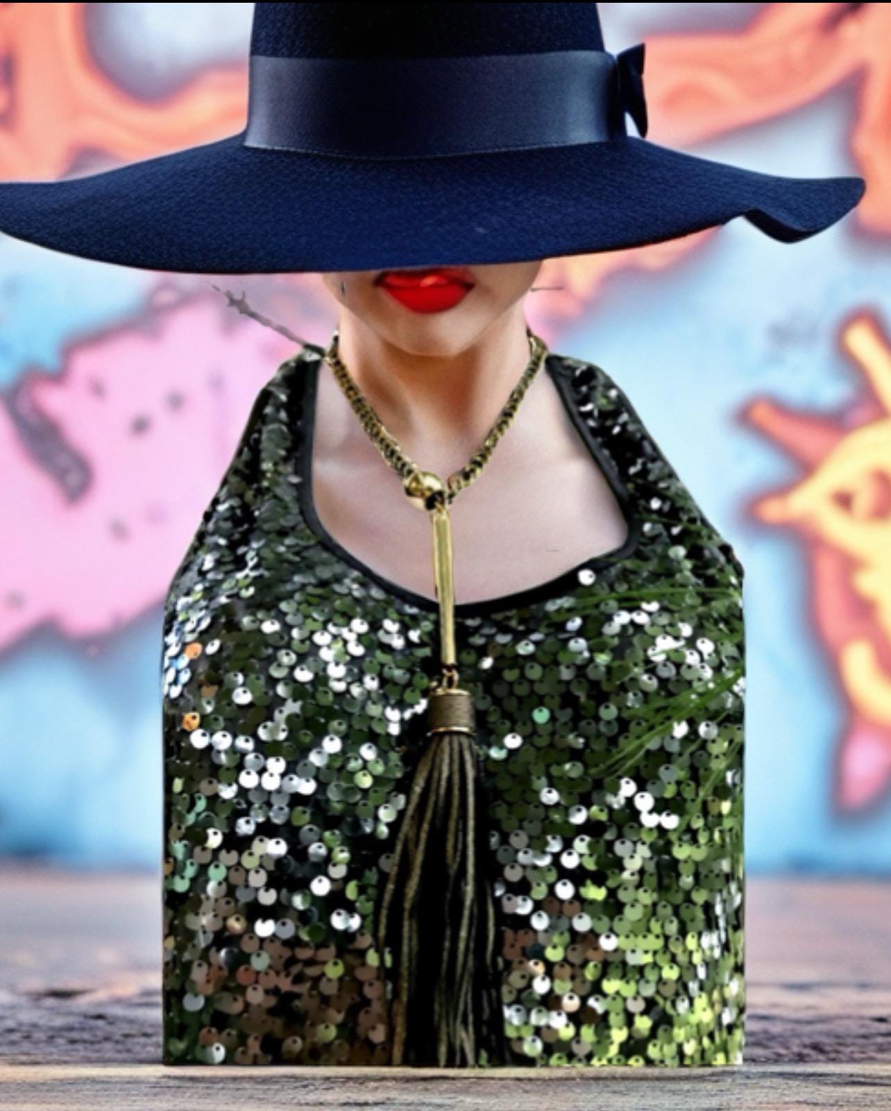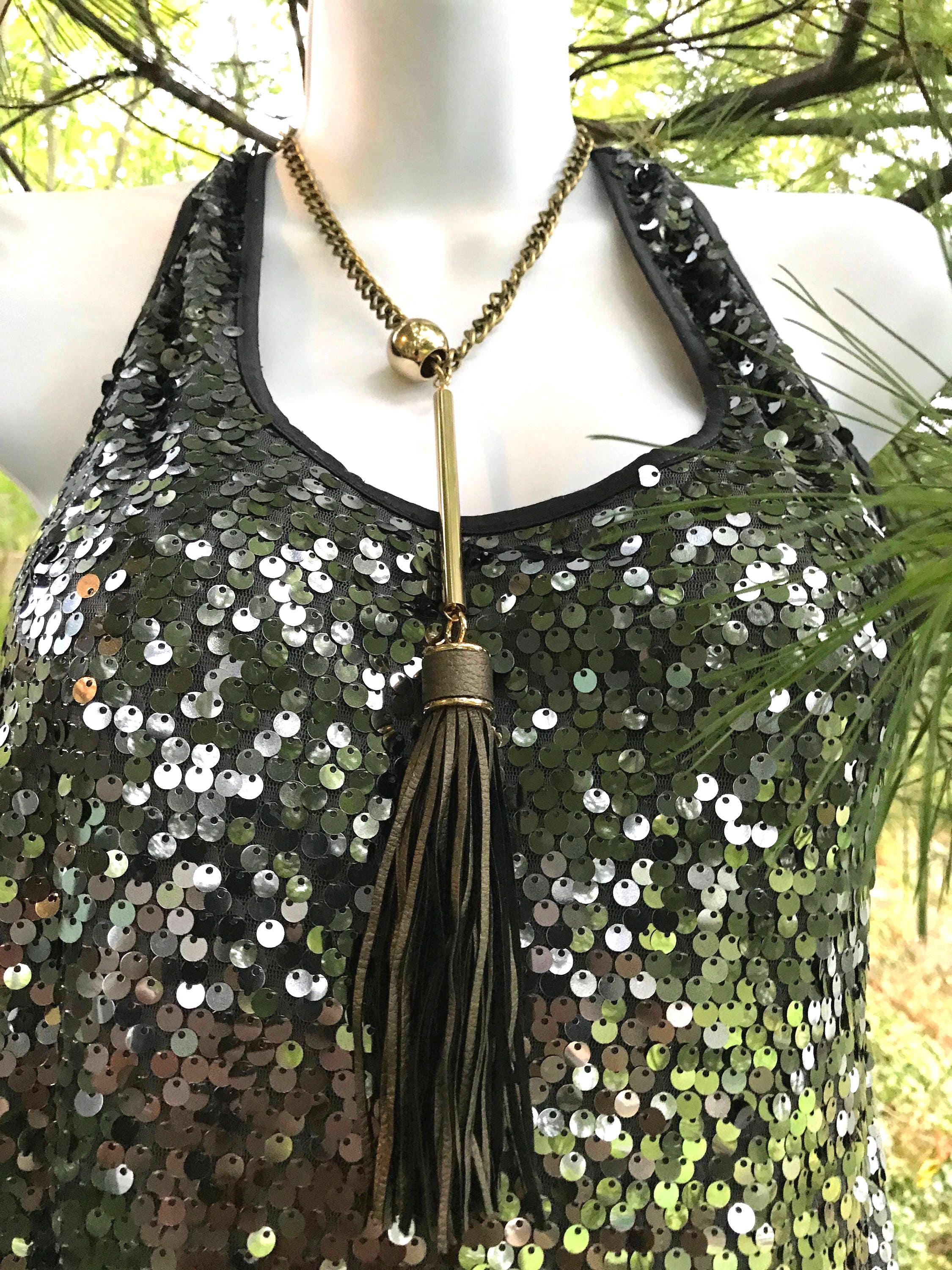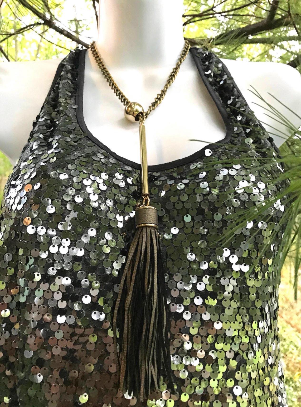 This beautiful necklace has an antiqued gold tone chain with a shiny golden ball and bar holding a metallic leather like tassel.The ball is removable. It is 20" long and can be worn shorter with a lobster claw clasp. Unusual fun piece!