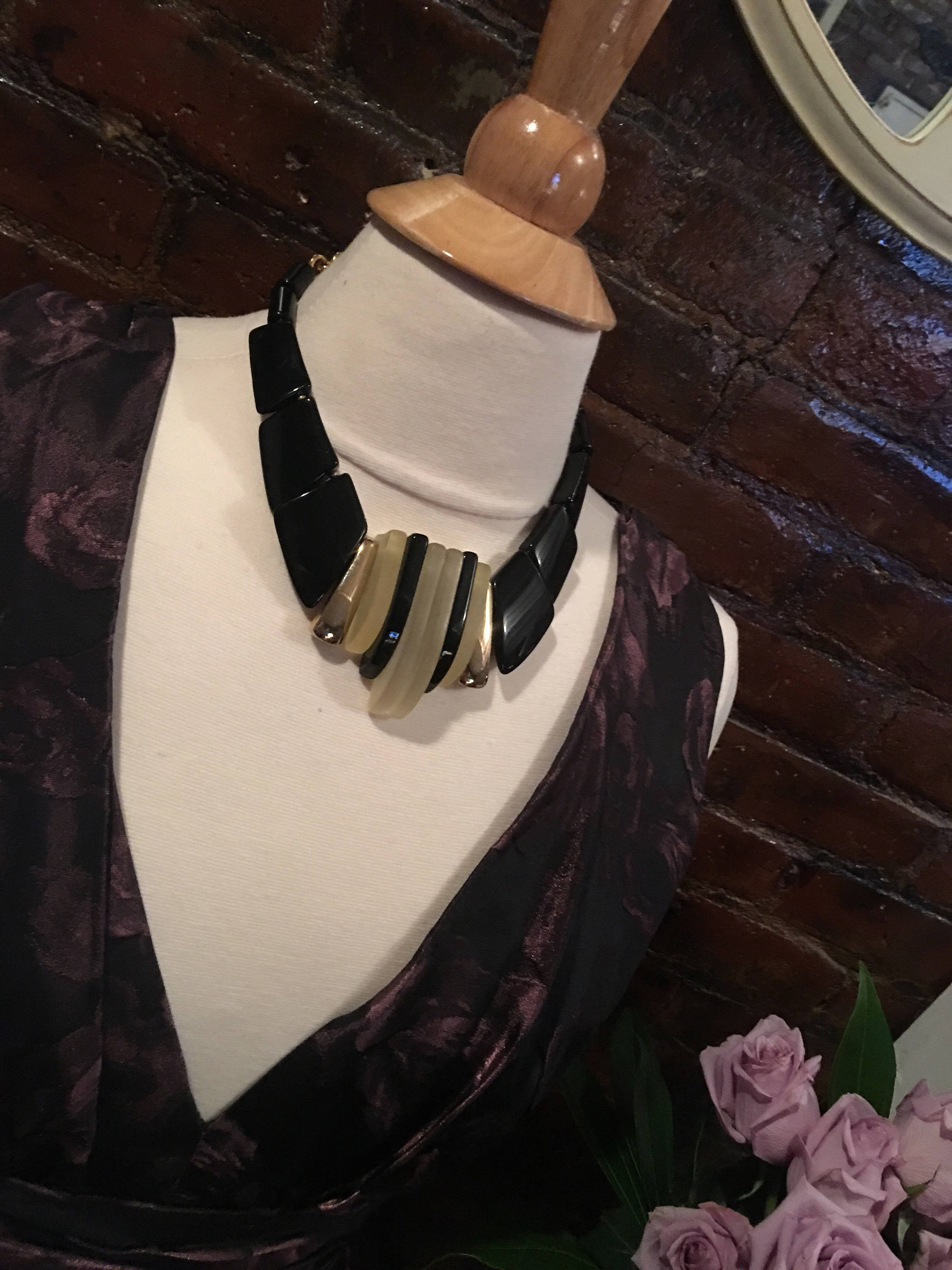 So 80's Big Bold Bling Deco Statement Necklace in Black Goldtone & Frosted Lucite Signed Park Lane
