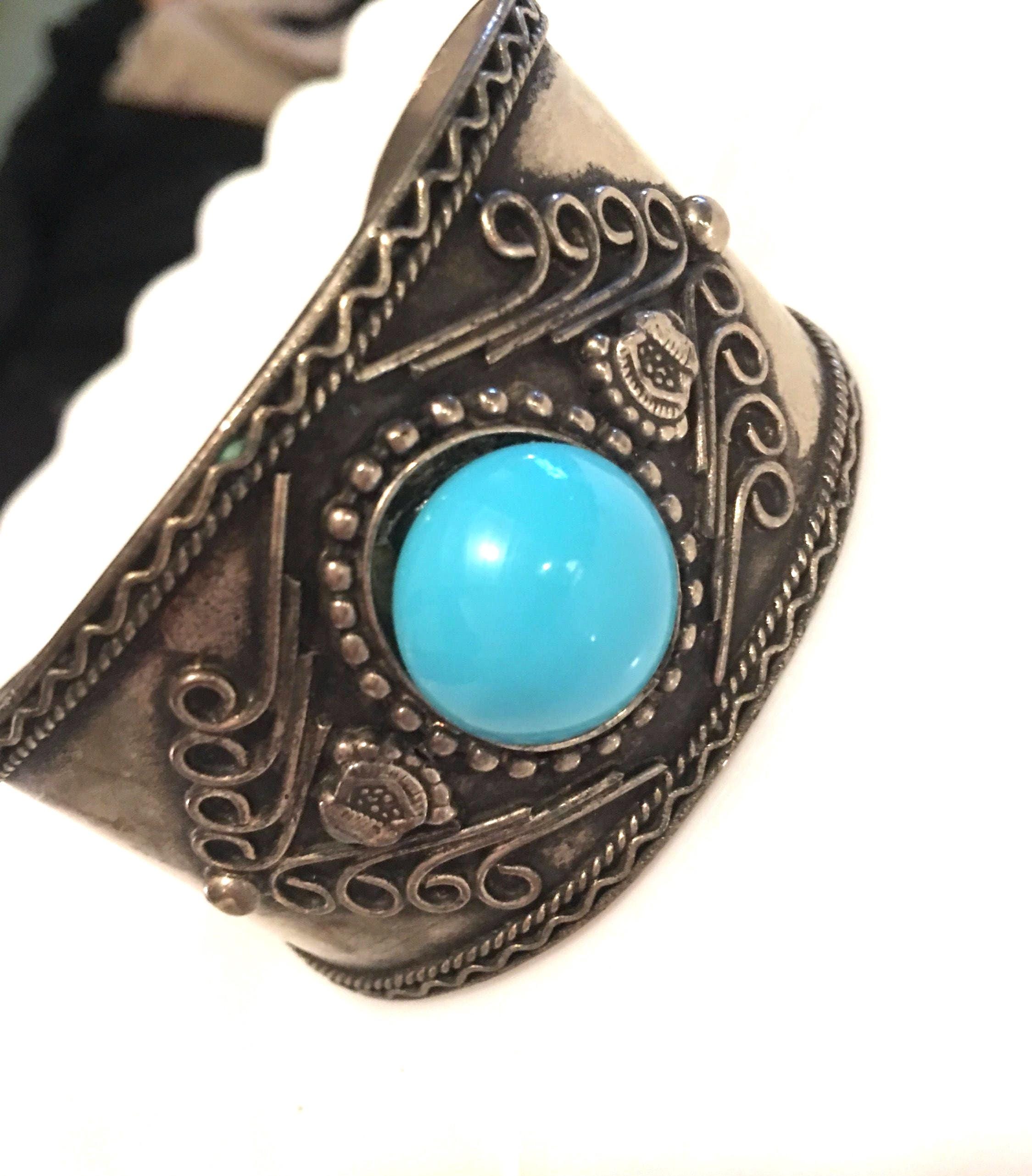 Big Boho Vintage Southwestern Tribal Boho Cowgirl Faux Turquoise Antiqued Silvertone Cuff Bracelet