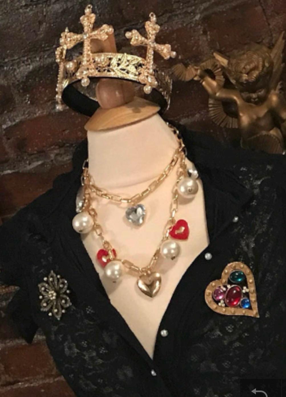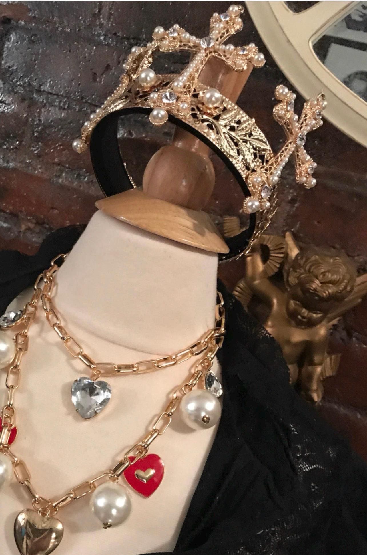 This amazing piece is a headband with golden leaves and crosses overed in sparkling ice rhinesotnes and faux pearls. Amazing designer unsigned piece!