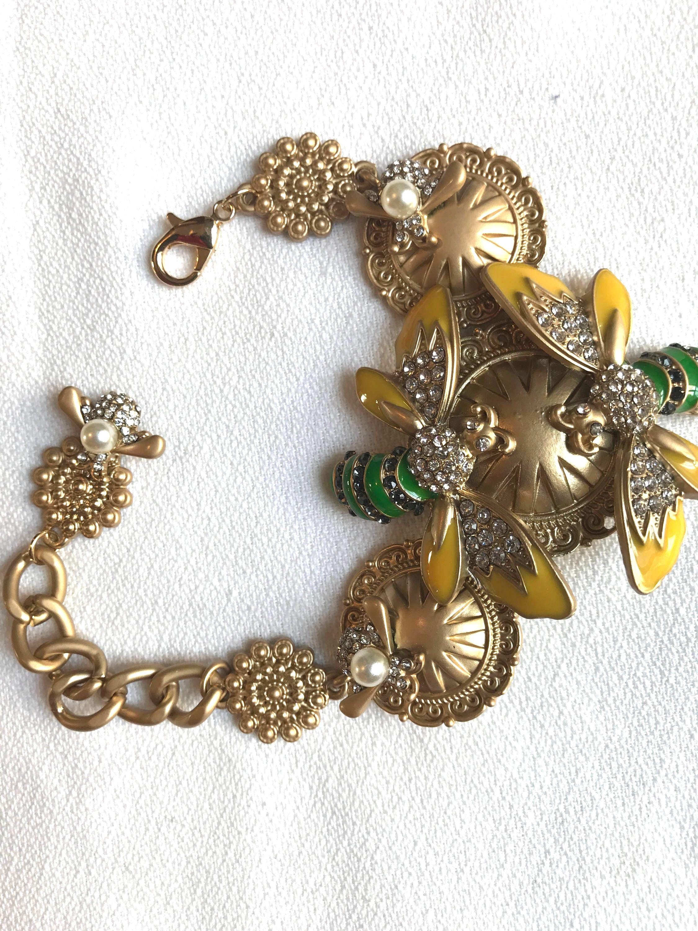 Trendy Enamel Bees on Matte Goldtone Medallions Runway Bling Staement Bracelet , early 2000s glam