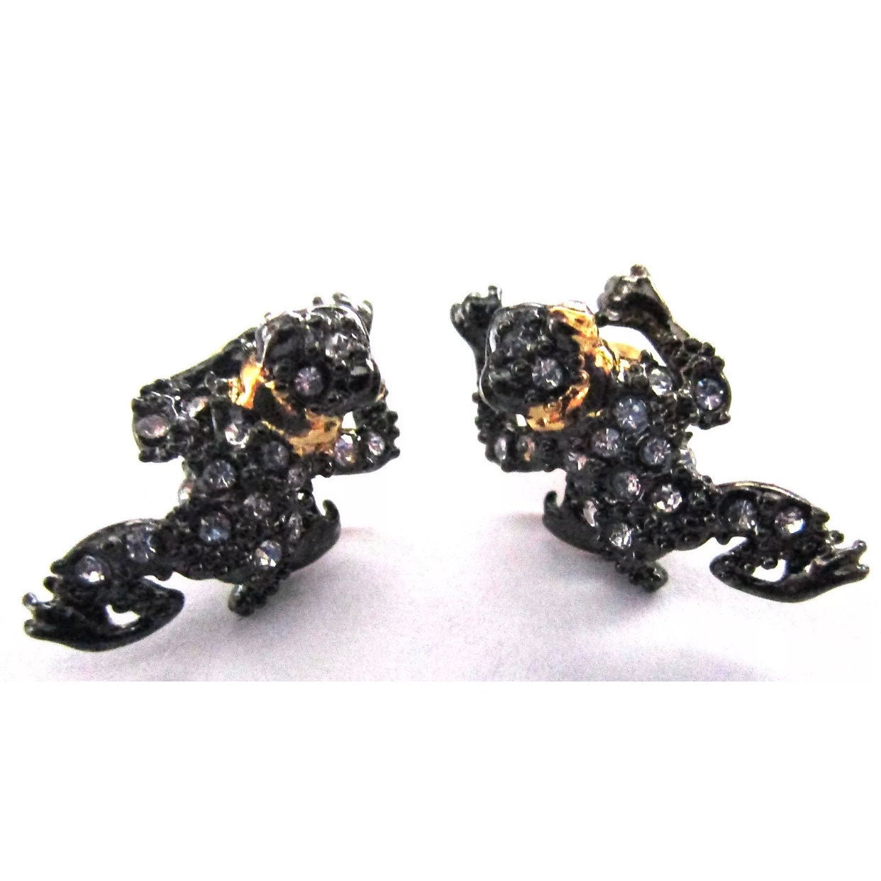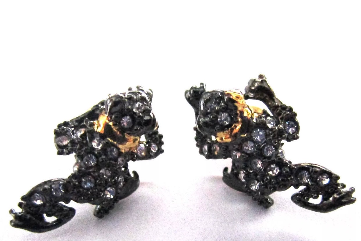 ALEXIS BITTAR Crystal Encrusted Frog Earrings -These beautiful pierced earrings are gun metal and goldtone with inset crystals. They are signed. I have a beautiful matching FROG statement choker from this collection as well. Very nice special and unique pieces! Beautiful limited production designer fashion jewelry. These little post frogs earrings are sensational! Never worn only used on fashion shoots a couple of times. I personally purchased these prices along with the larger dangles (since sold) for my styling kit and my designer jewelry collection. Wow! time flies it is already vintage!