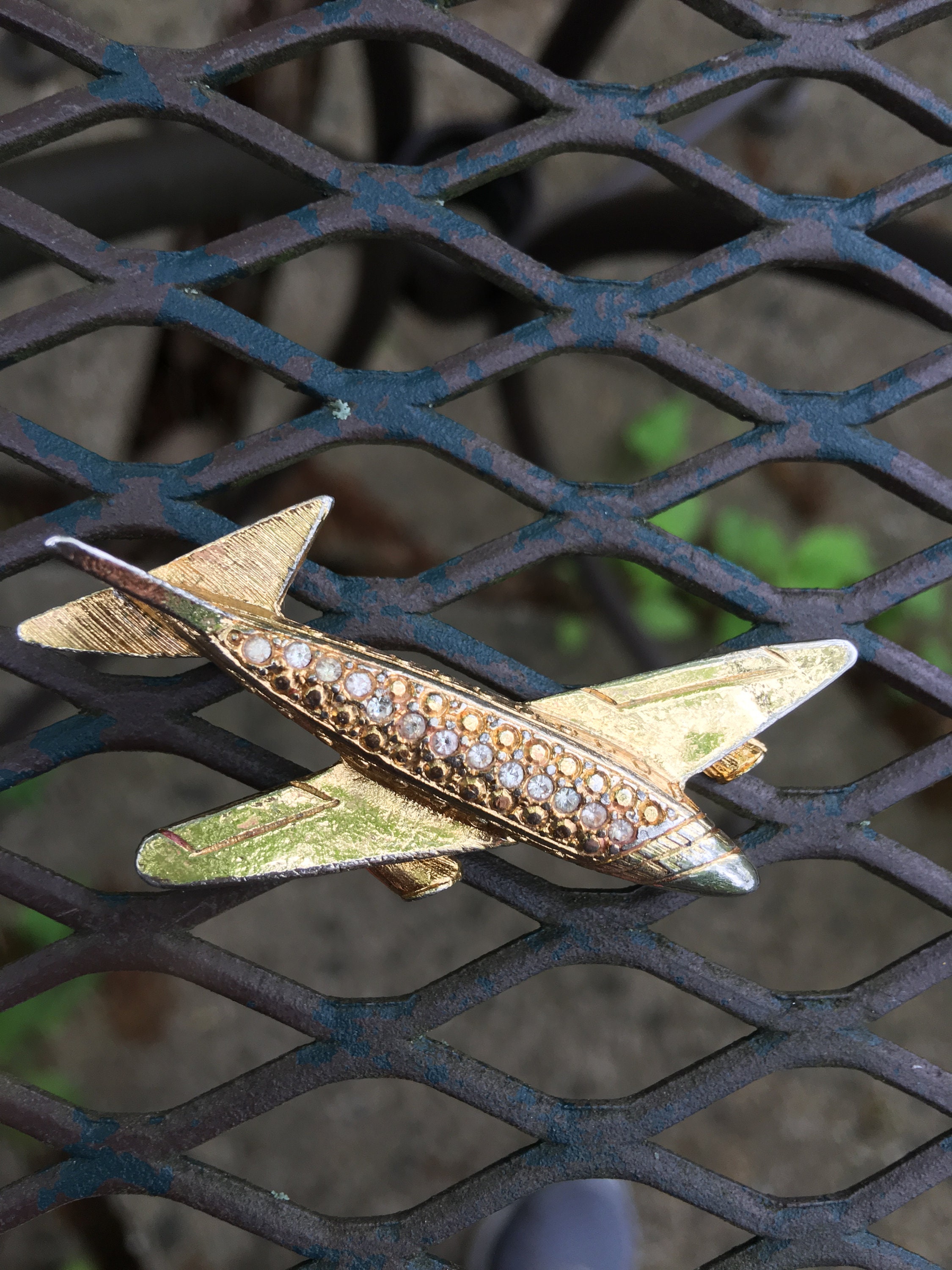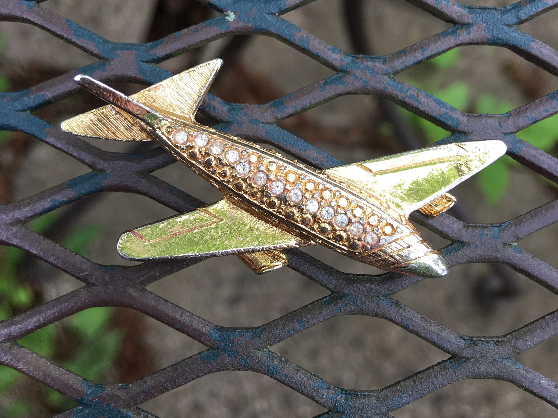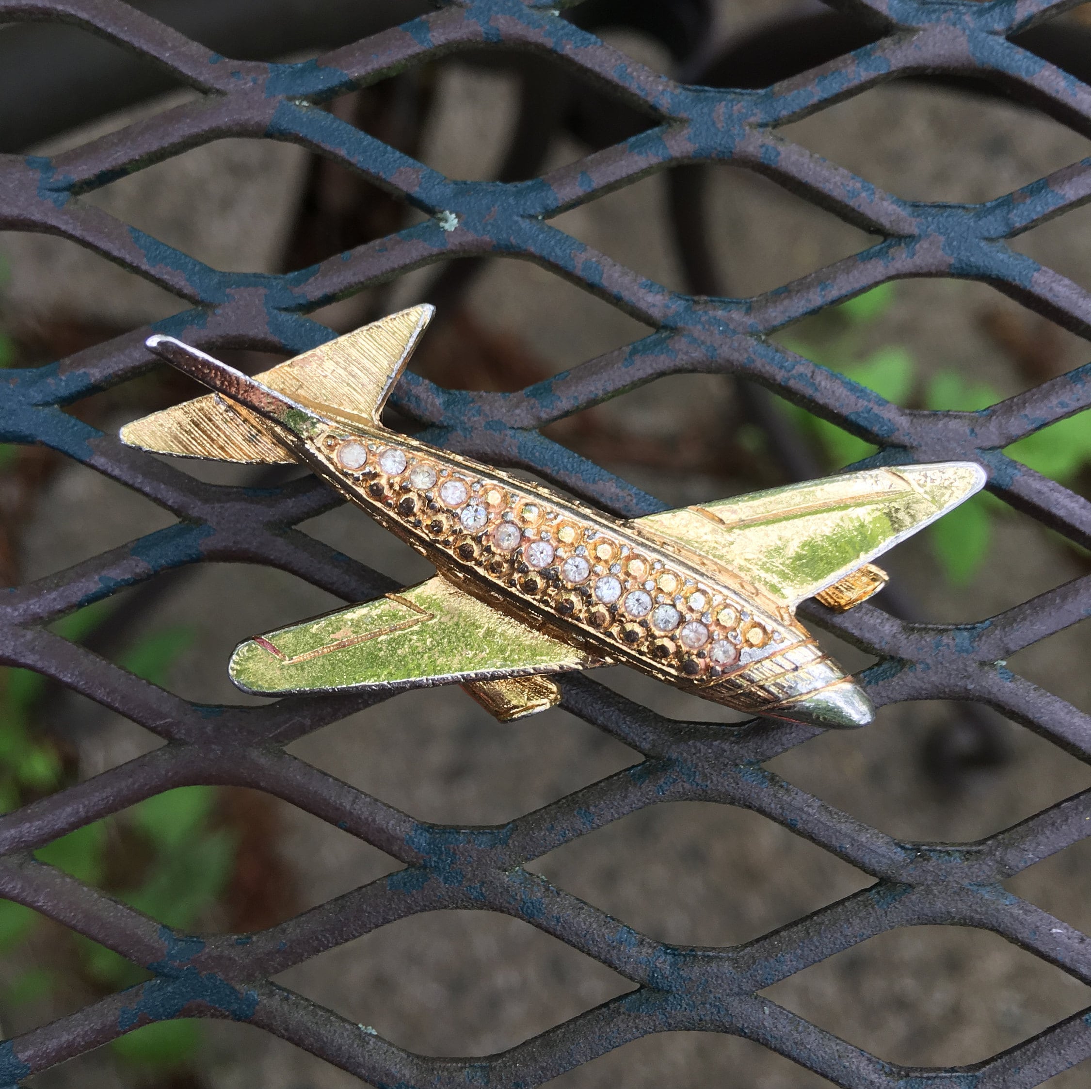 Vintage Goldtone & Rhinestone Jetsetter Airplane Pin