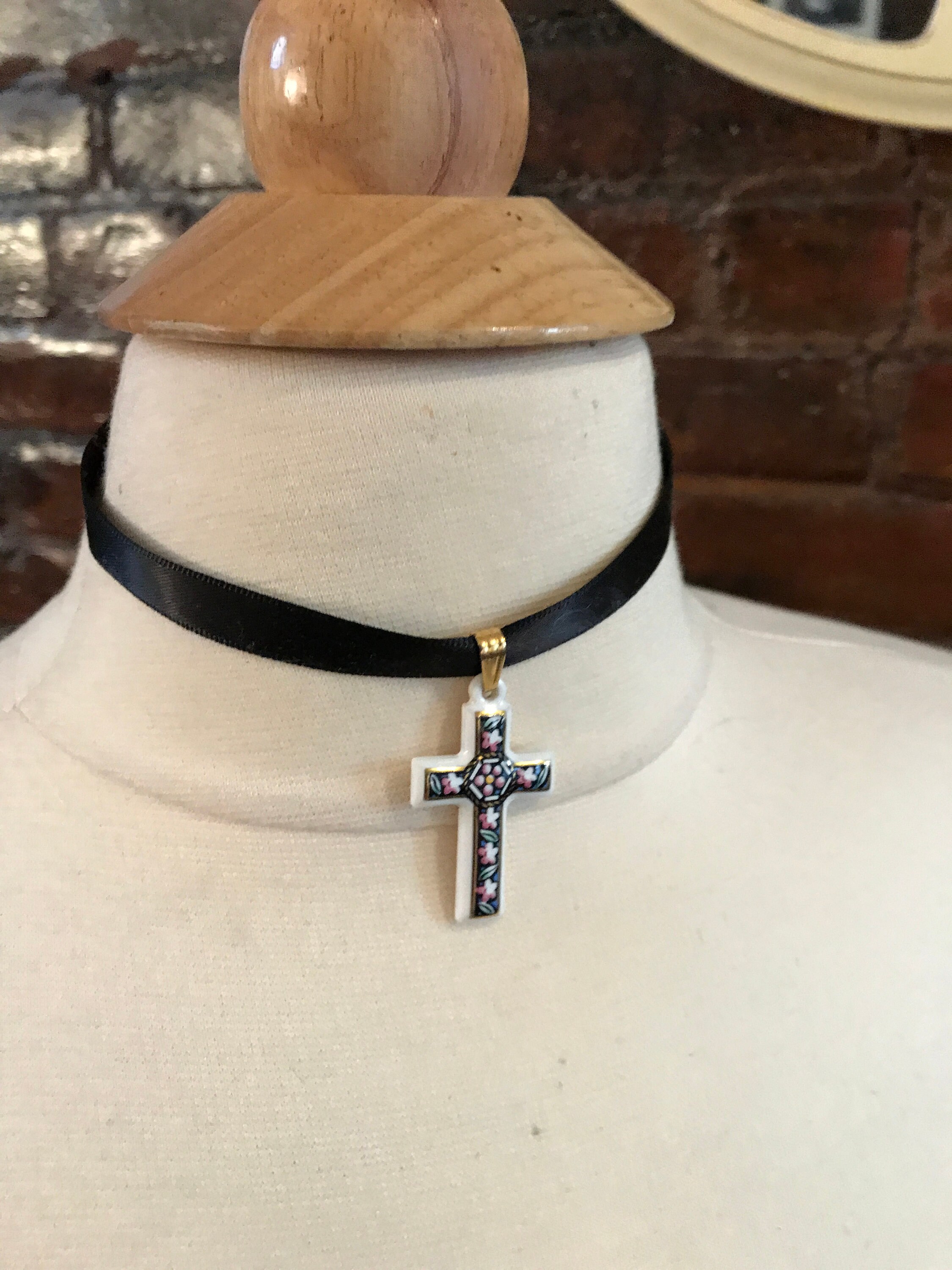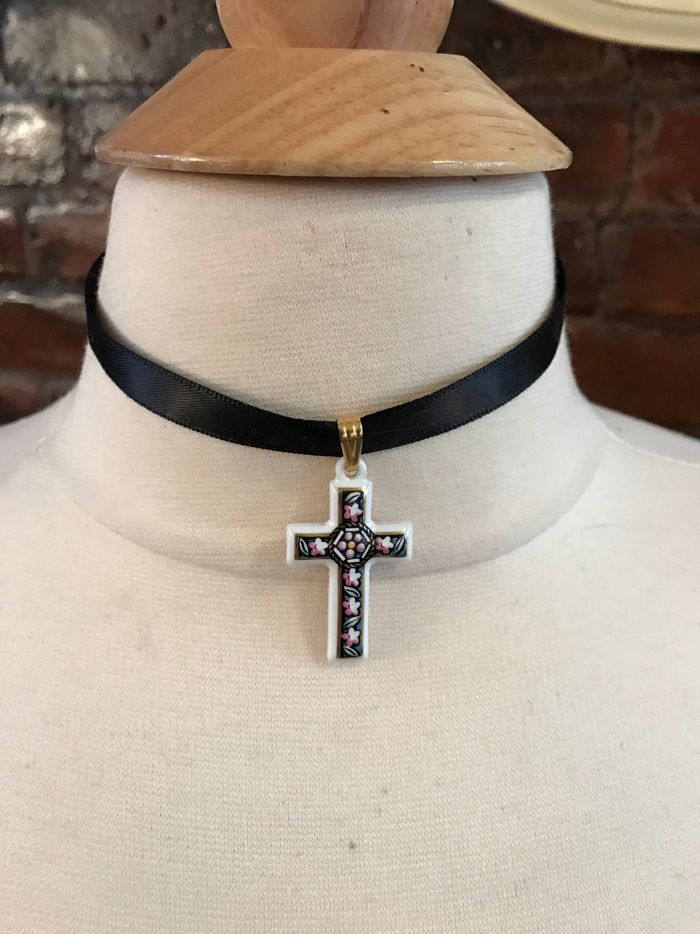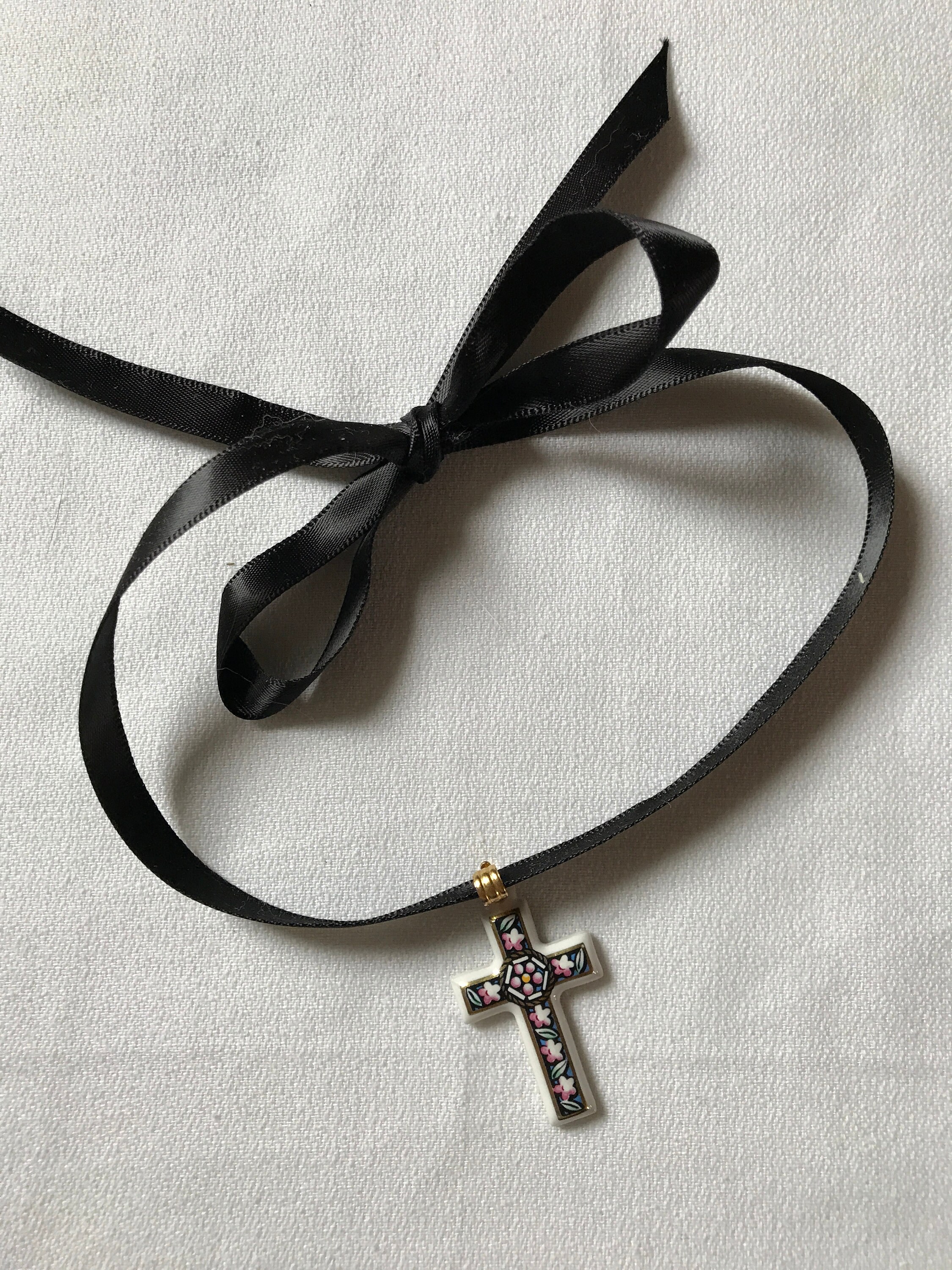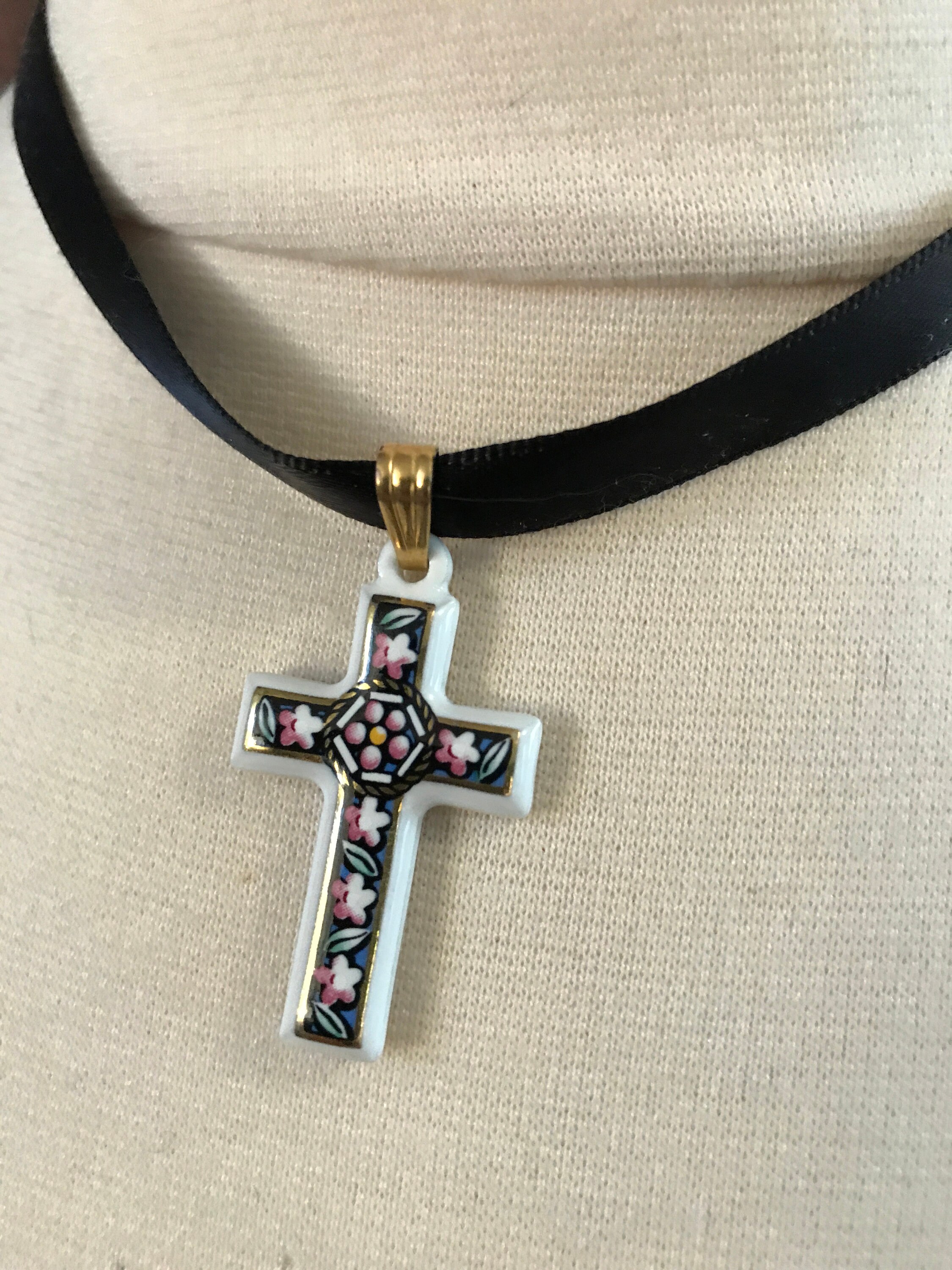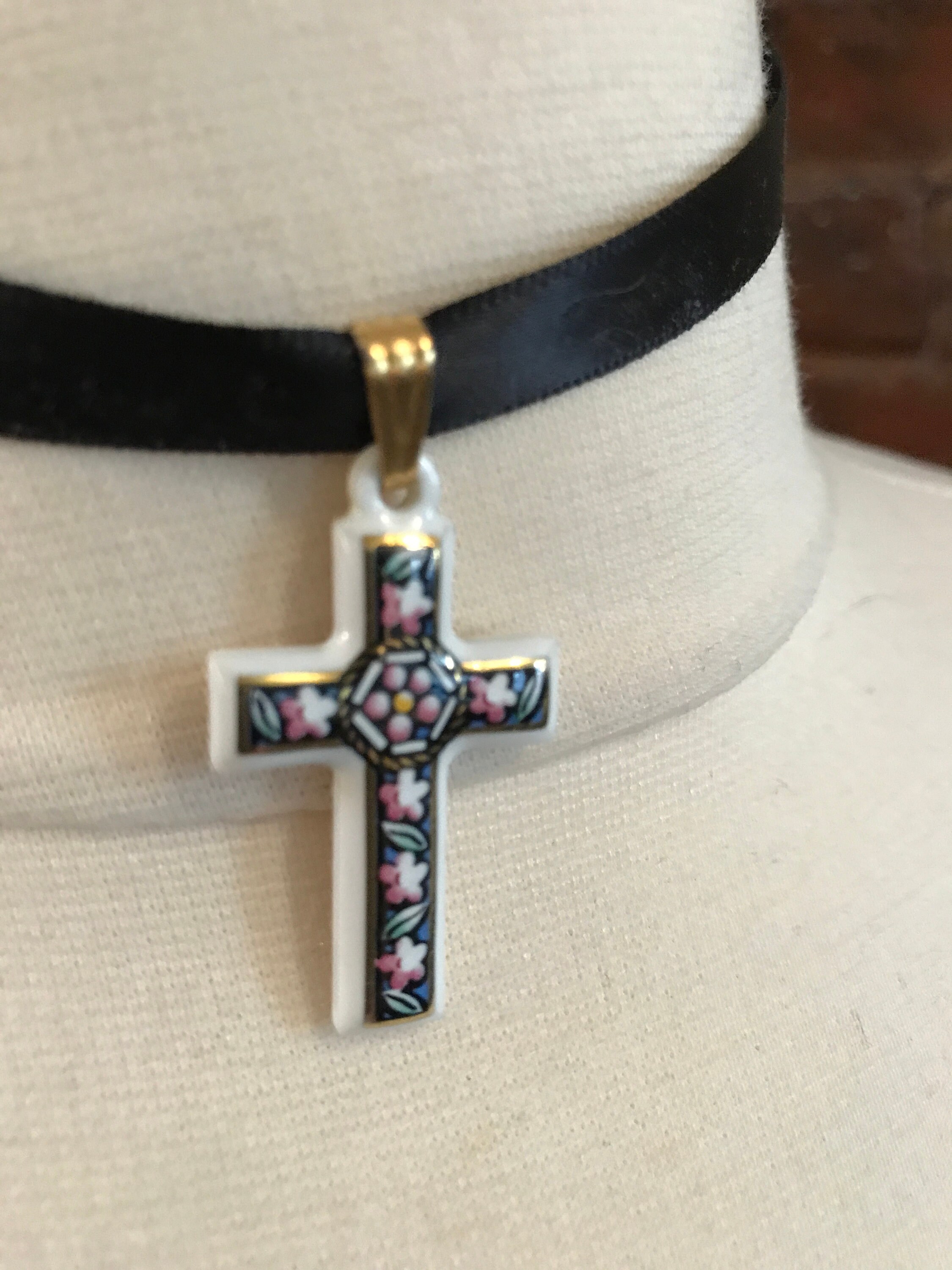 Pretty white Porcelain Cross Pendant with Pink Flowers on Black & Gold Trim