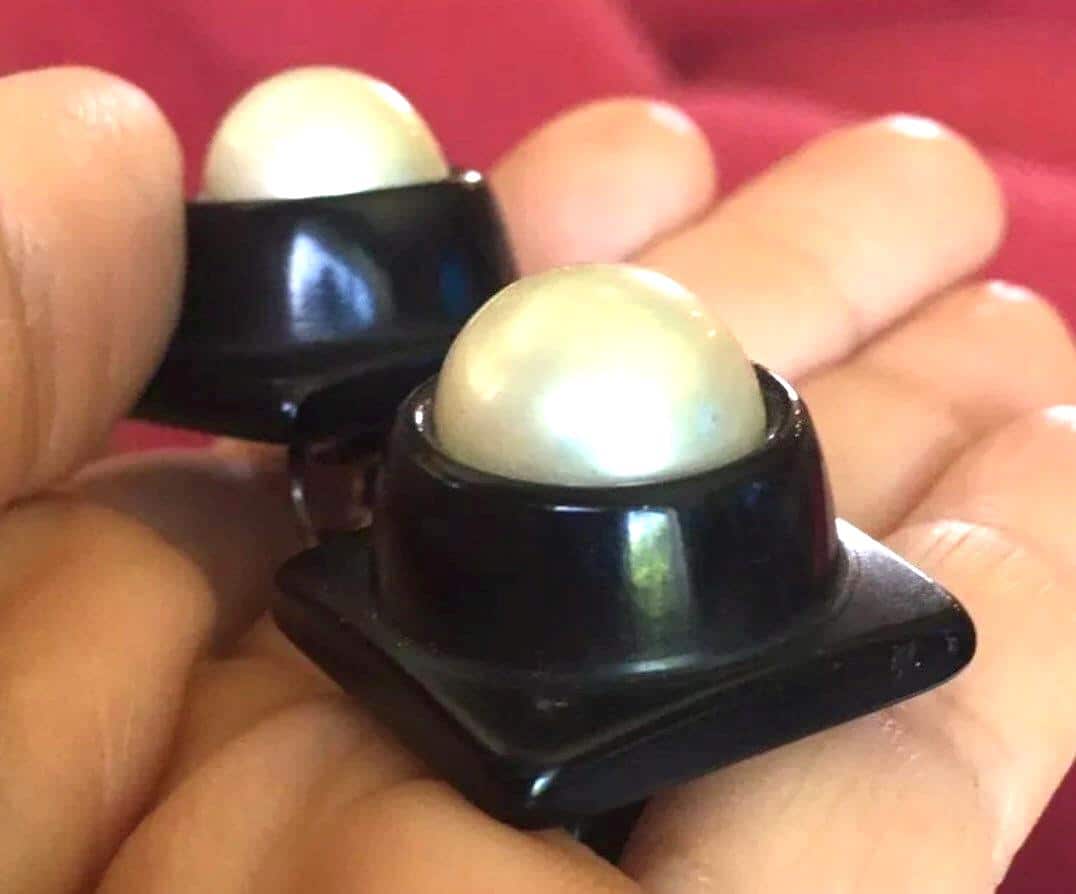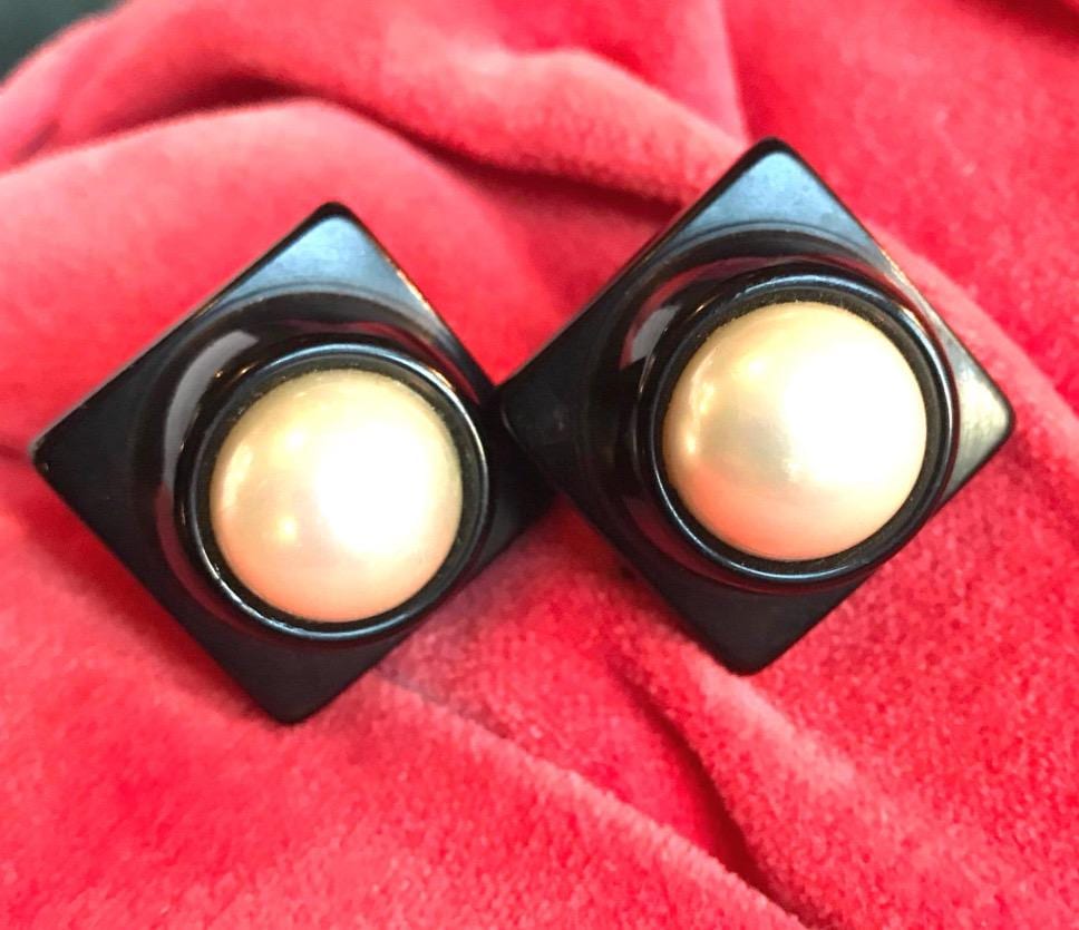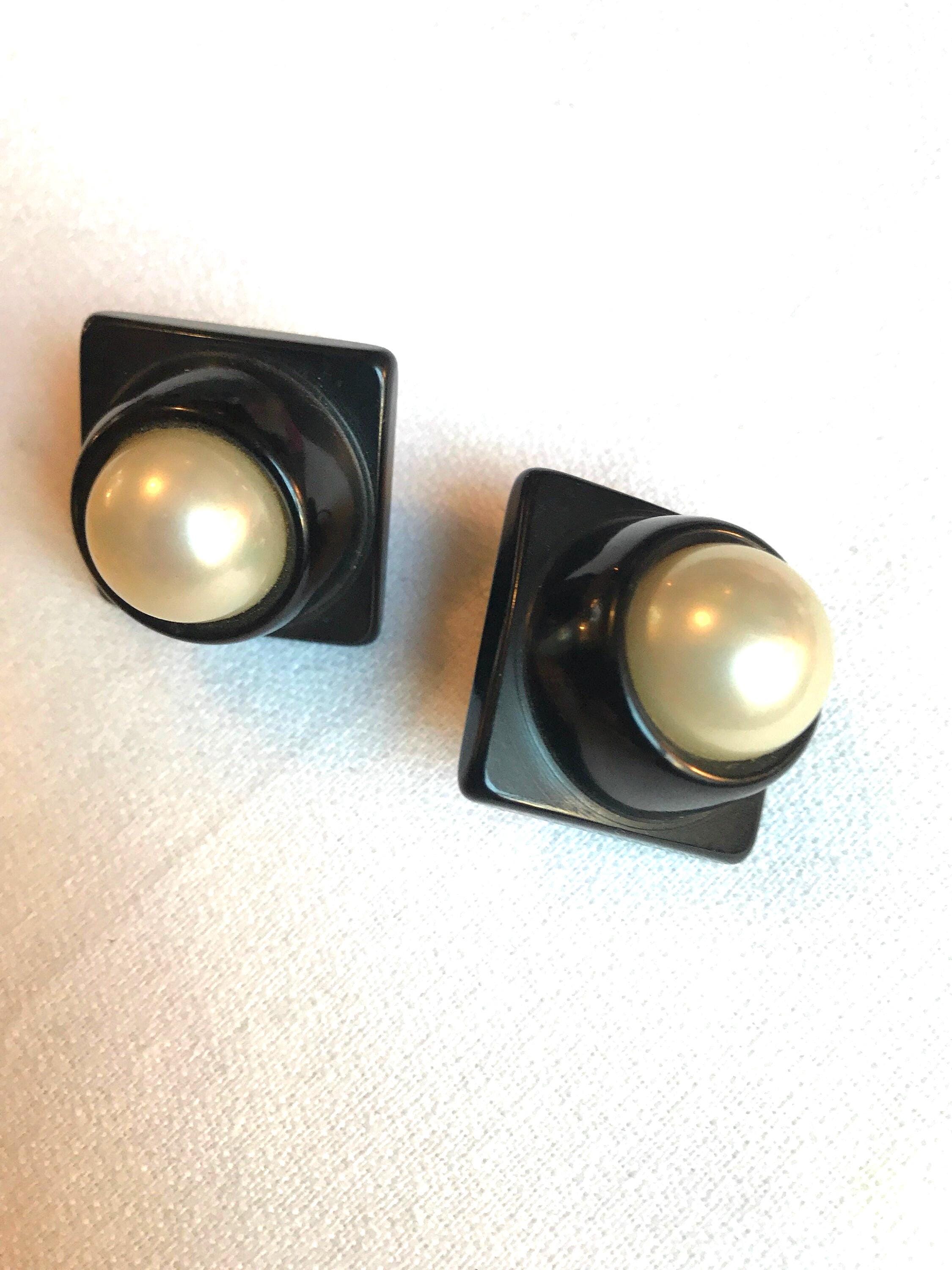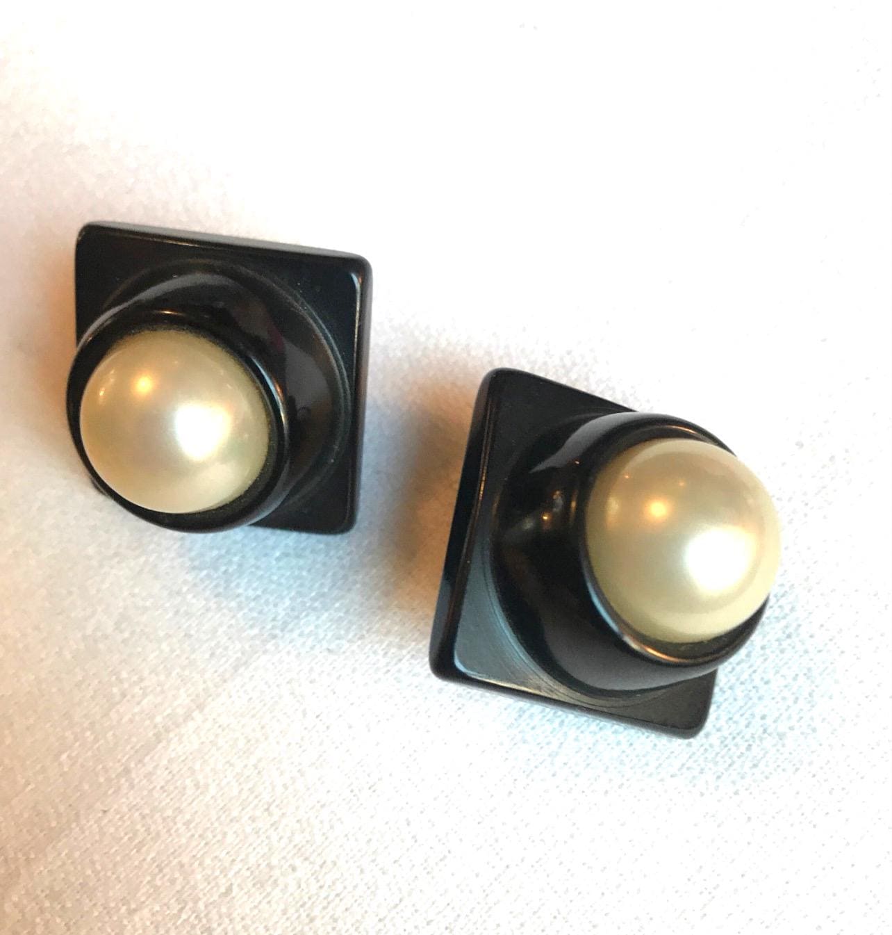 Awesome 80s Deco Modernist VINTAGE Black Lucite & Faux Pearl Square Dome Clip on Classic Wardrobe EARRINGS