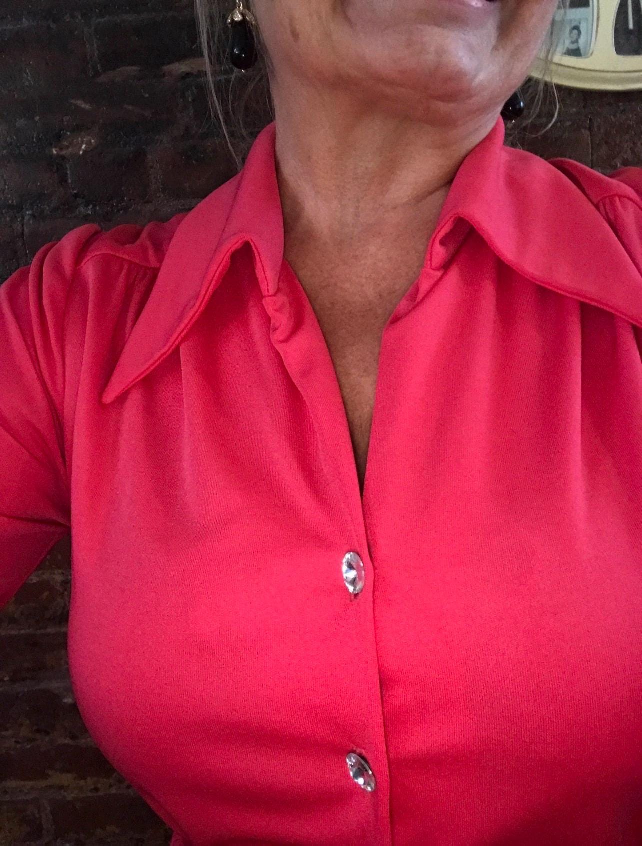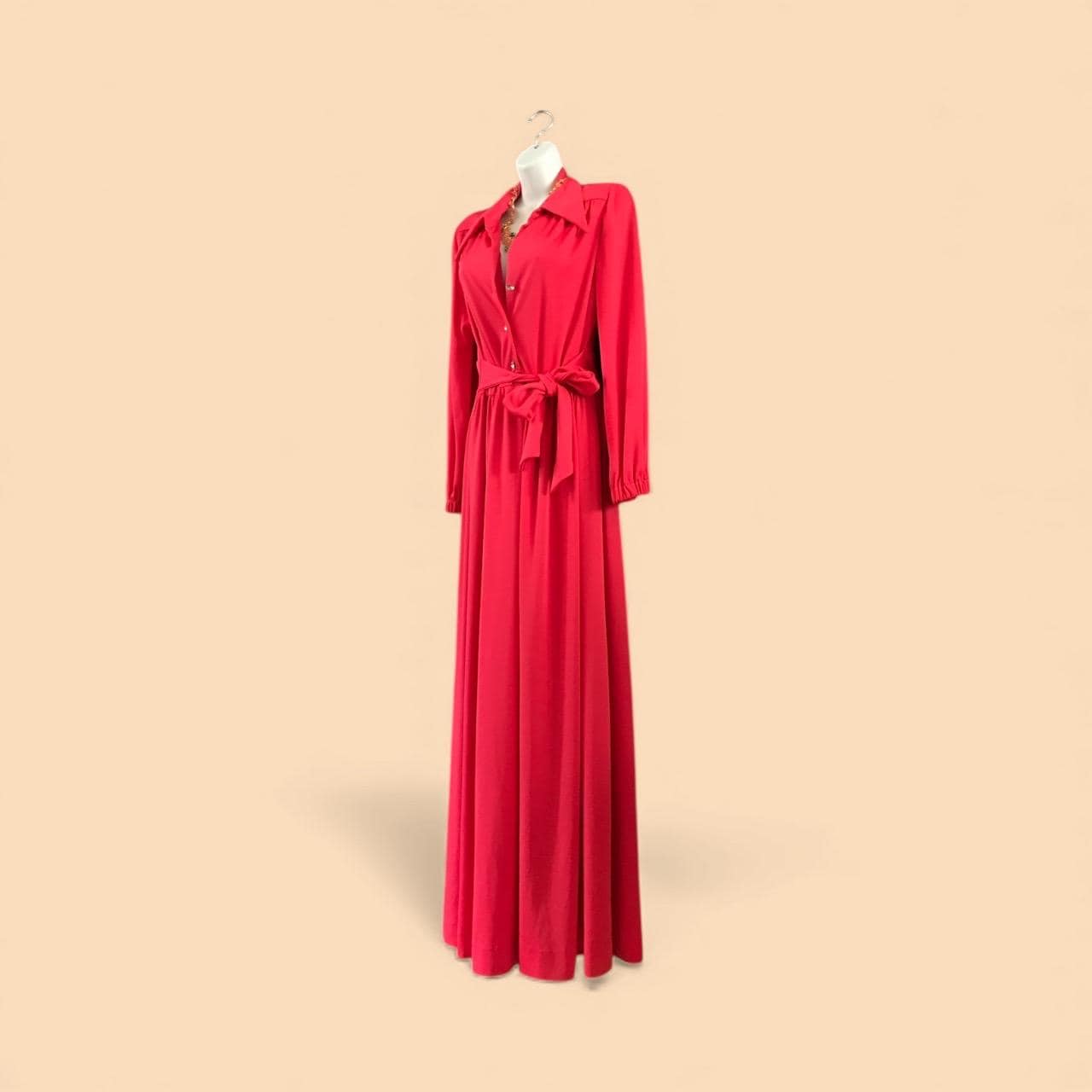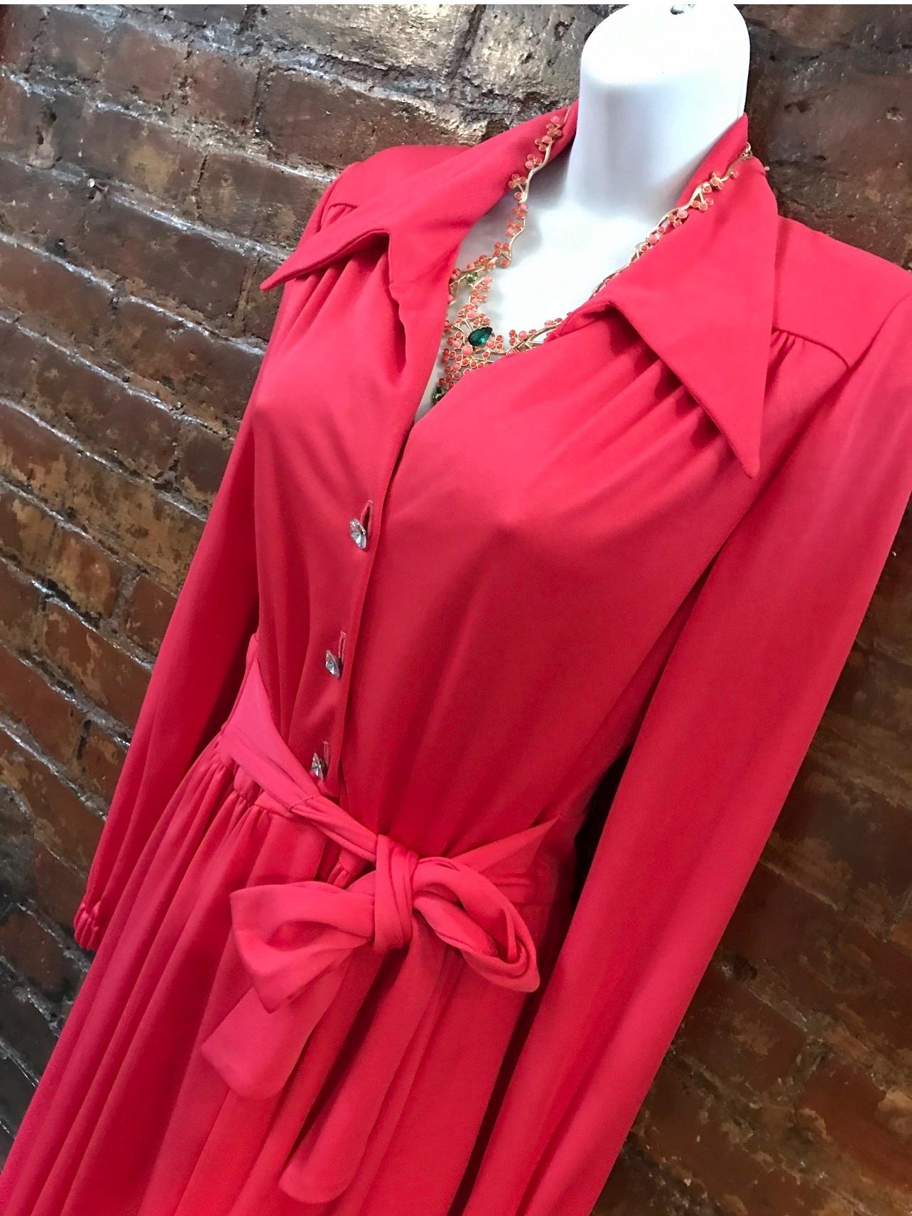 Glamorous Vintage Resort Deep Coral Double Knit Washable Lounge Poolside Maxi Dress with Ice Rhinestone Buttons size M