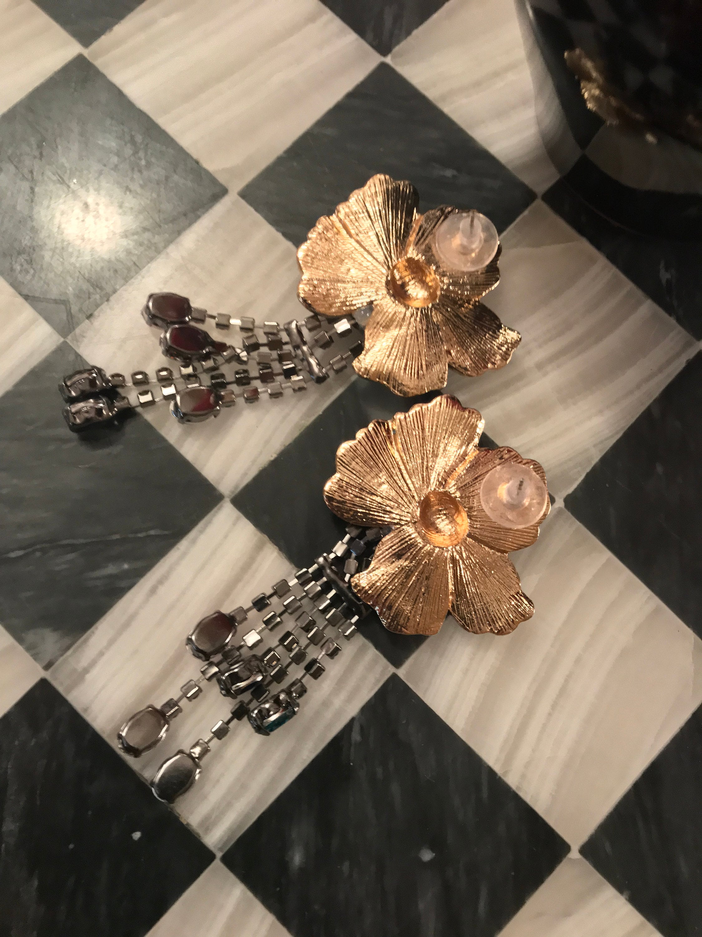 Y2K Black Floral Dangles, Rainbow Rhinestone Flower Tassel Earrings, Glamour Jewelry