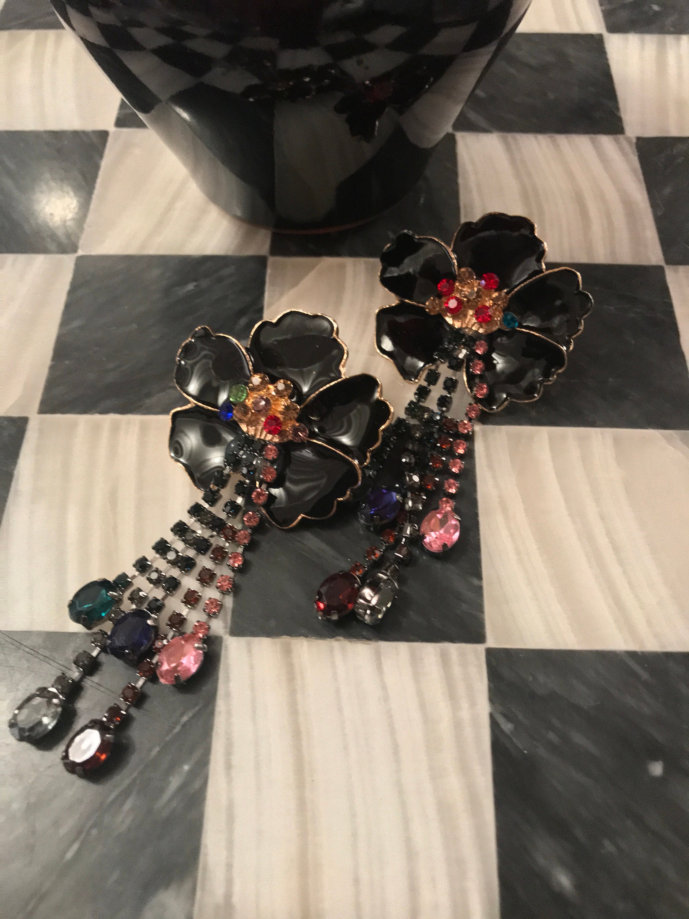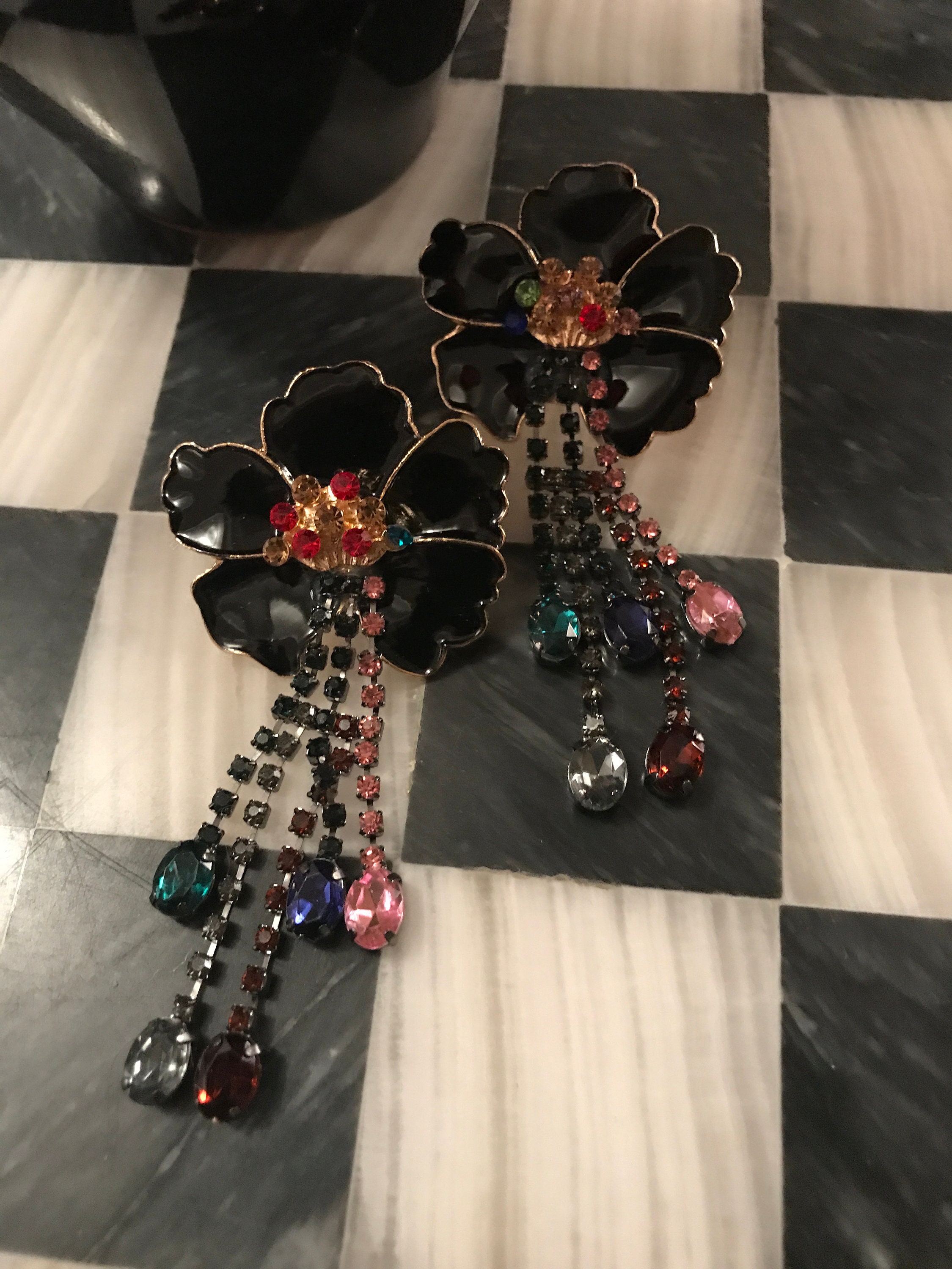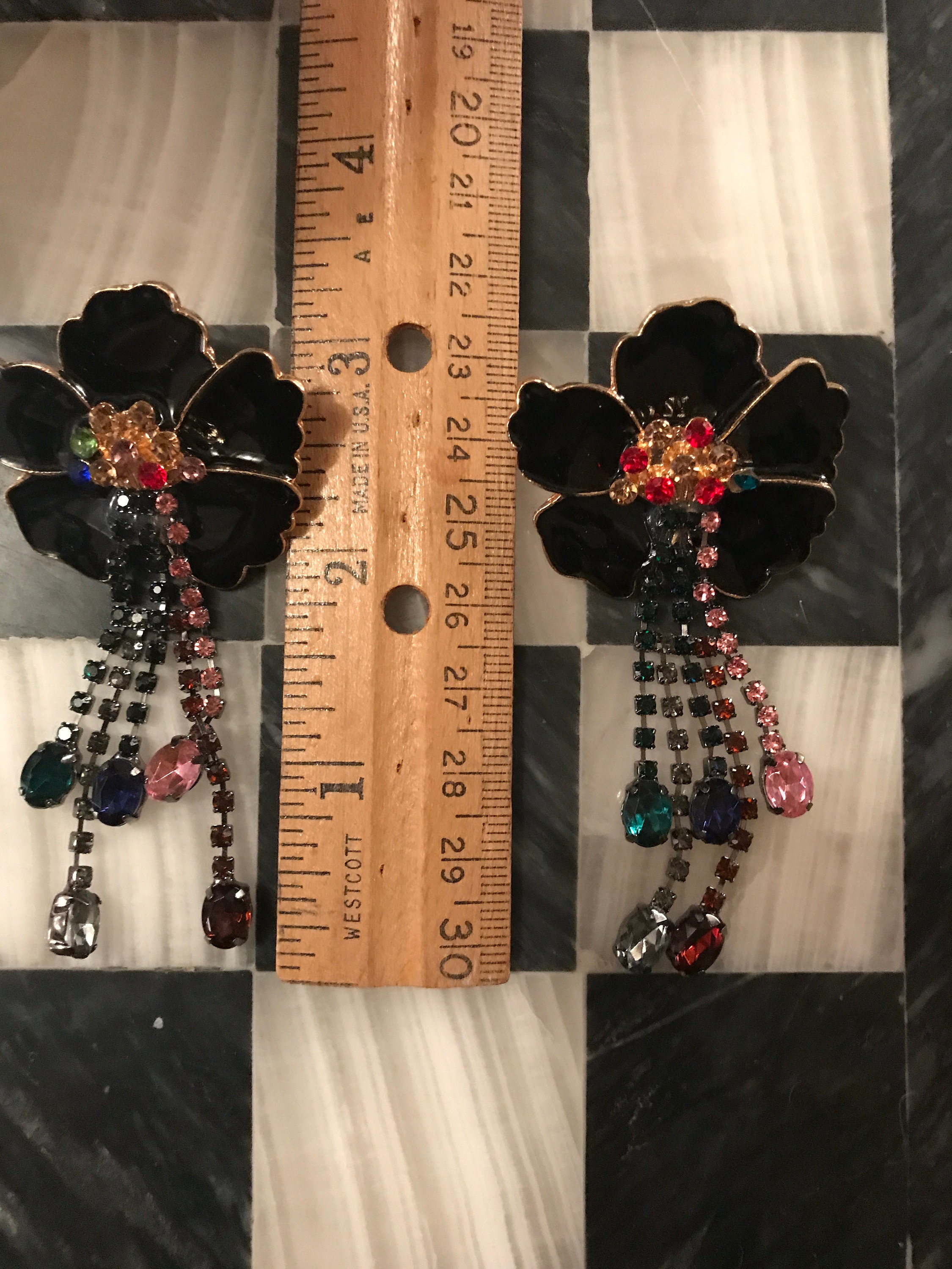 These stunningly beautiful pierced earrings are two toned with black enamel and colorful rhinestones. They are 3 1/4". Great earrings!