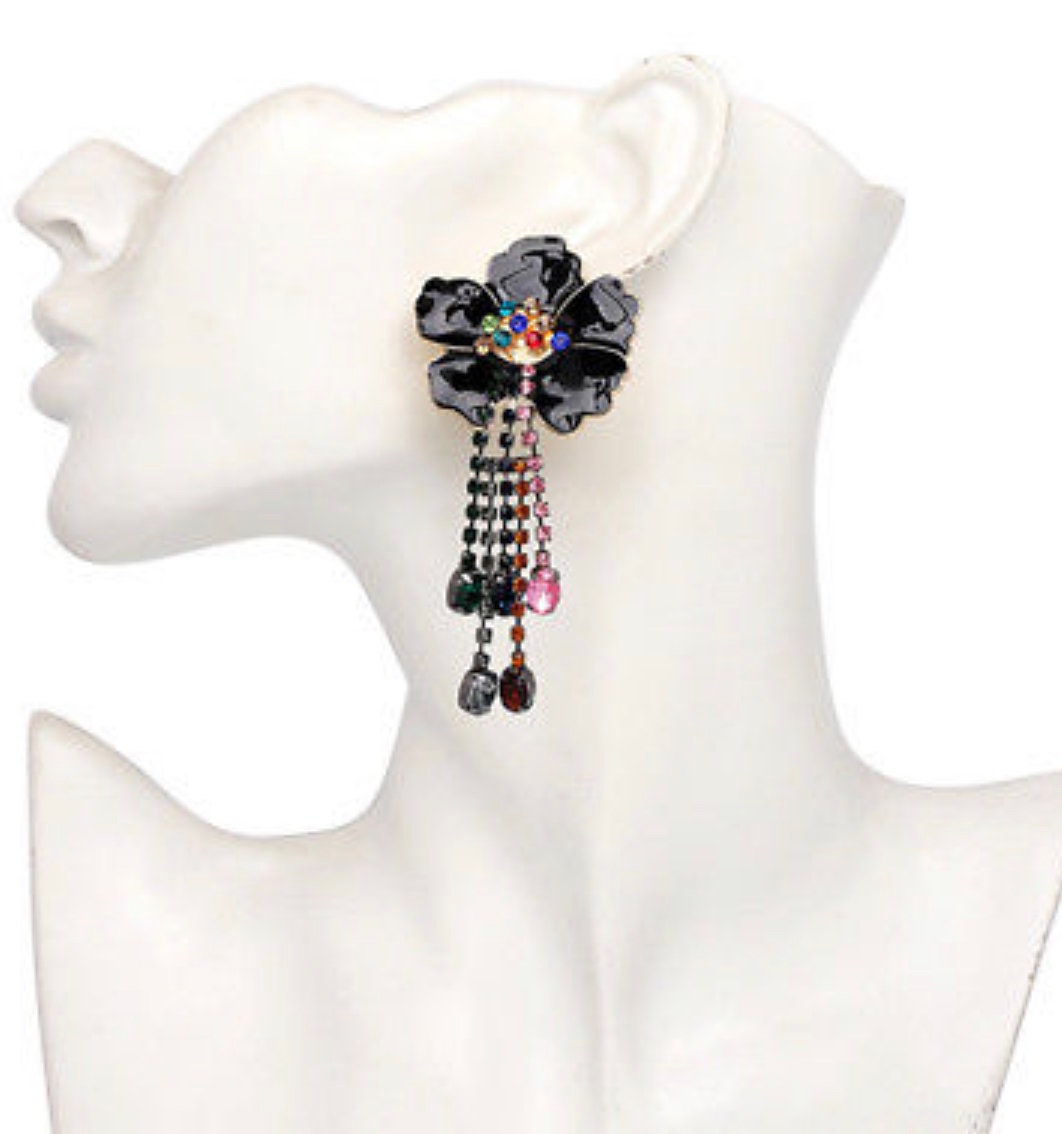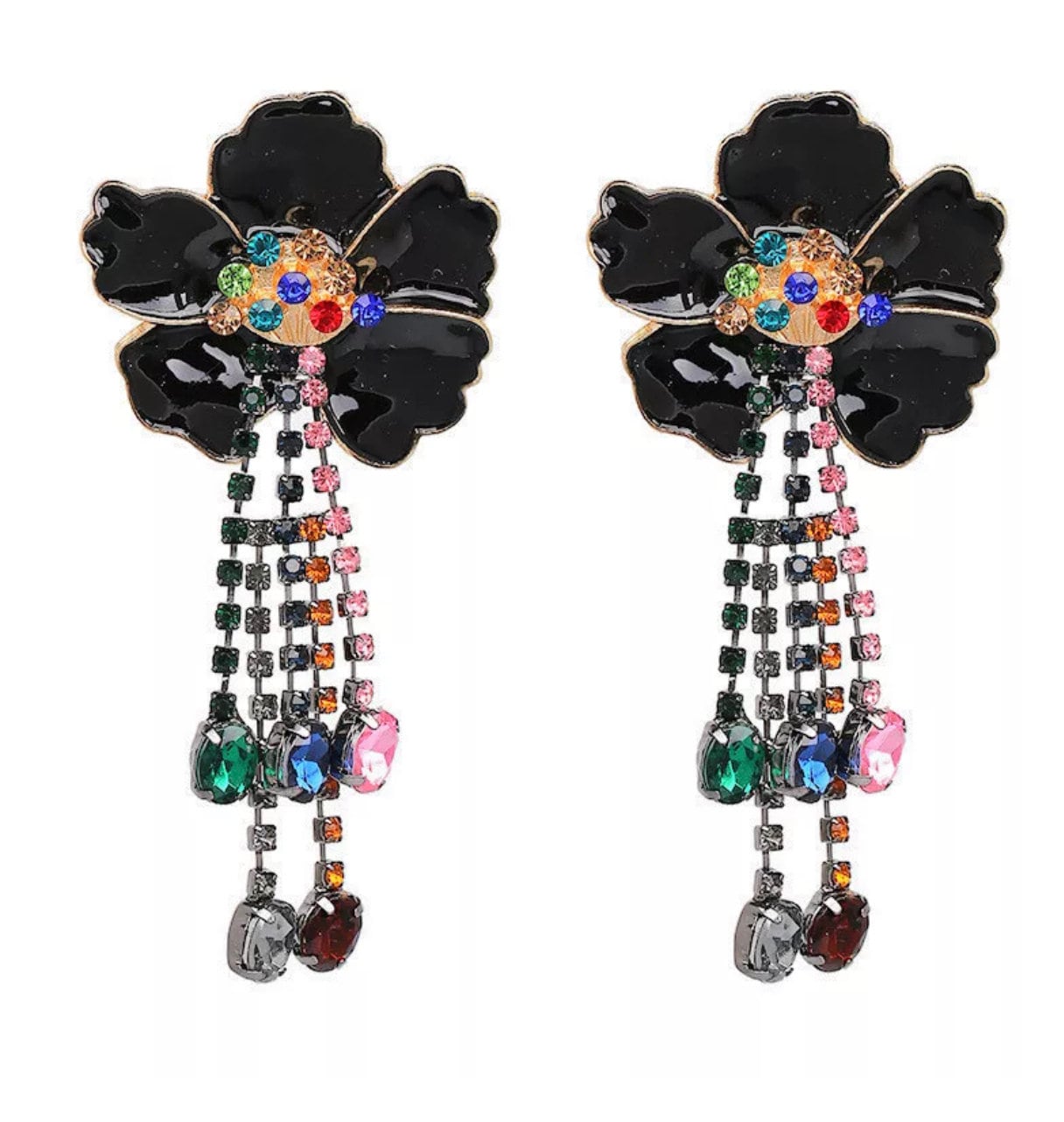 Y2K Black Enamel Colorful Rhinestone Flower Tassel Earrings