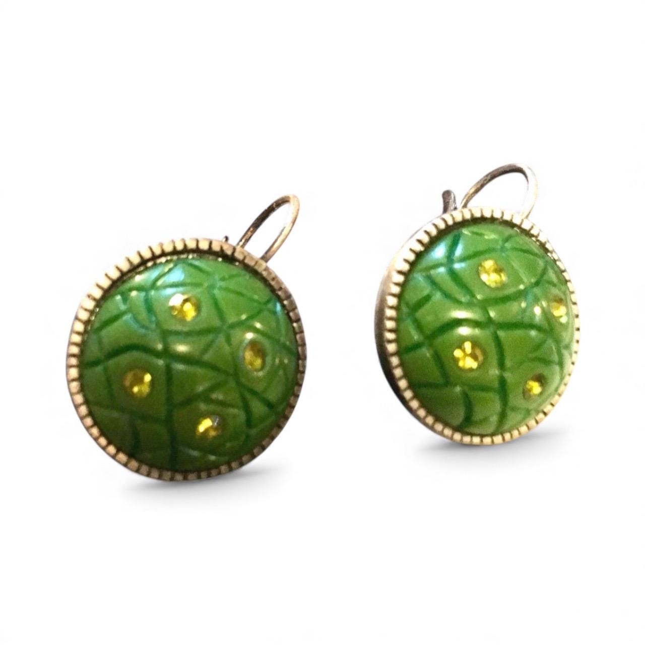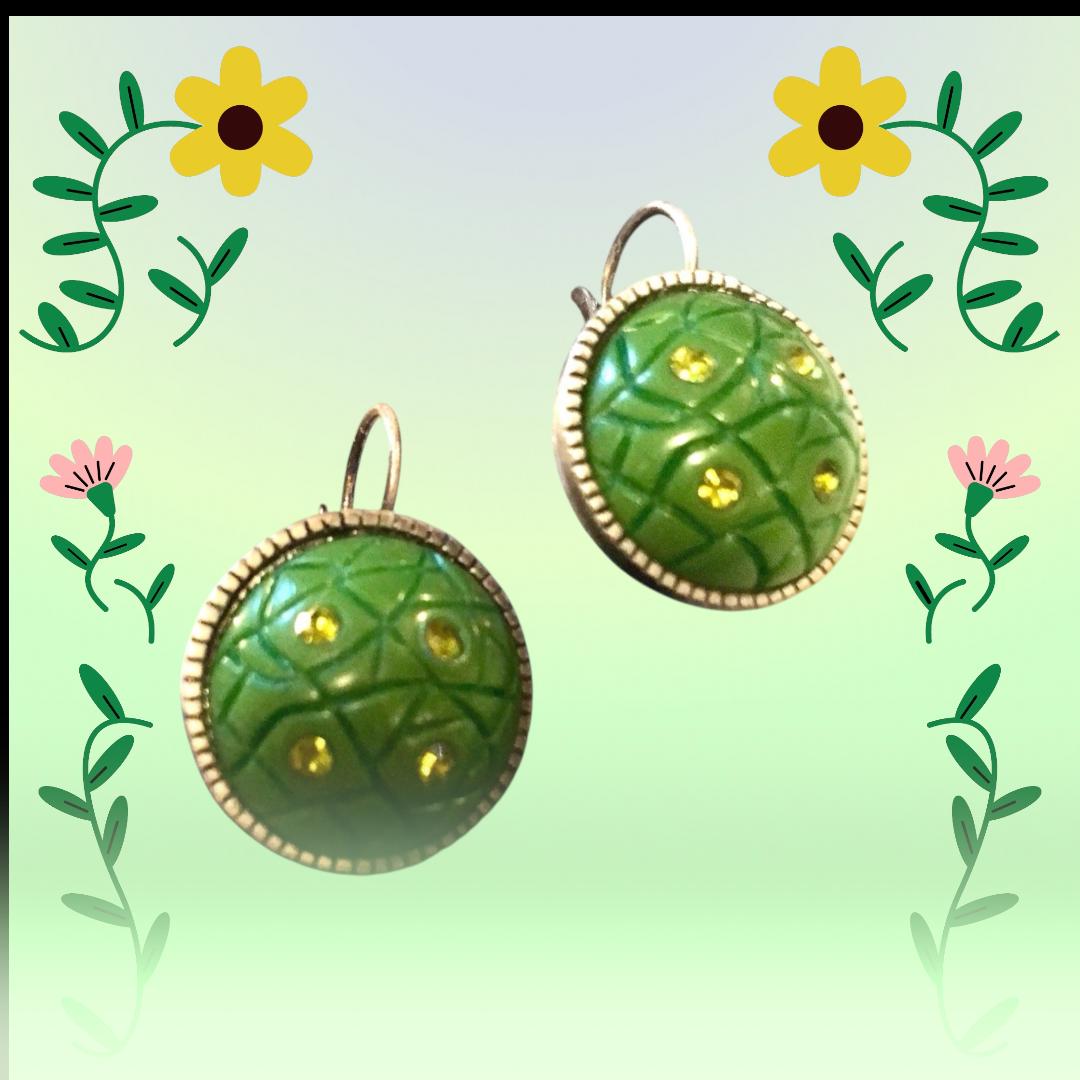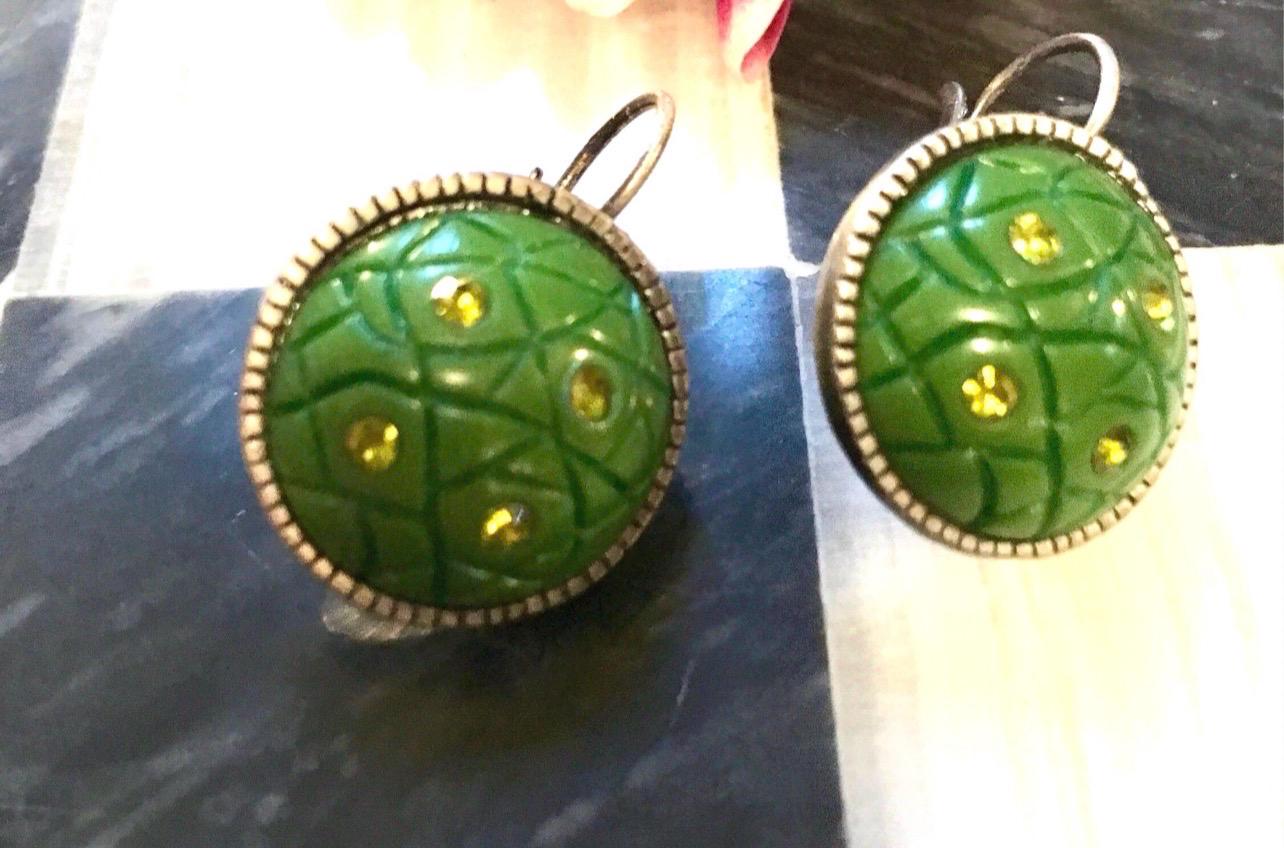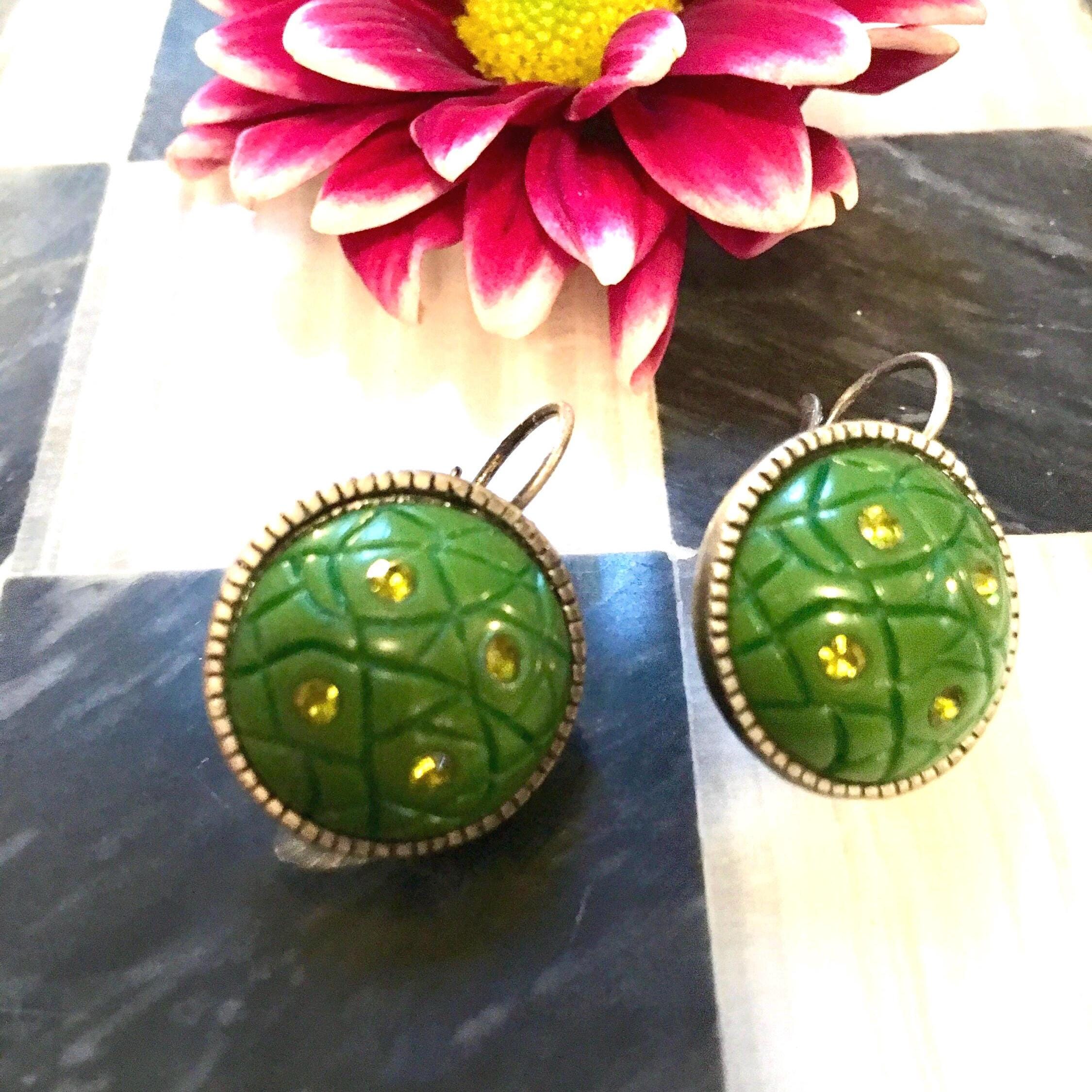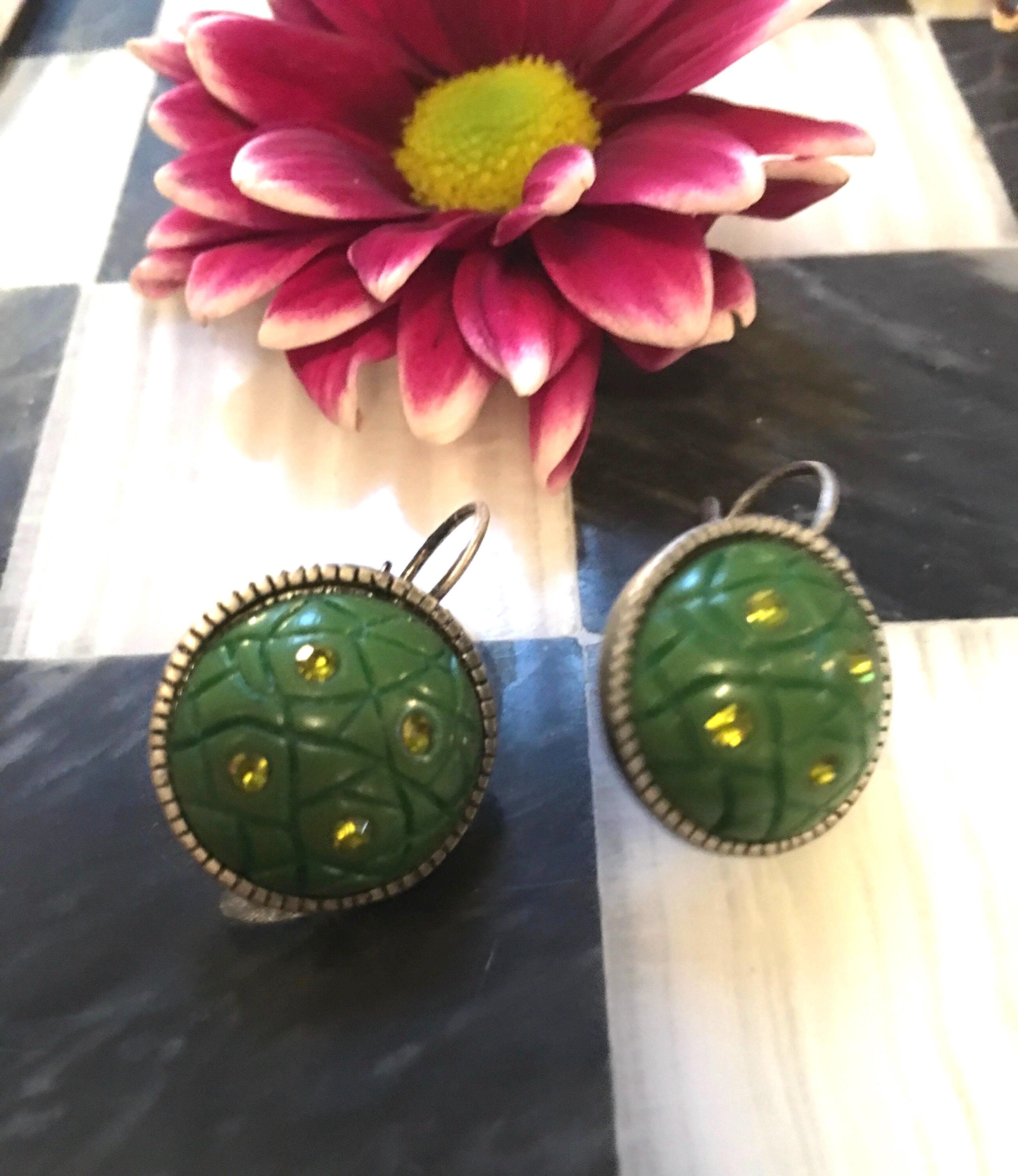 Vintage Art Deco Green Clip On Earrings: Silvertone Jewelry