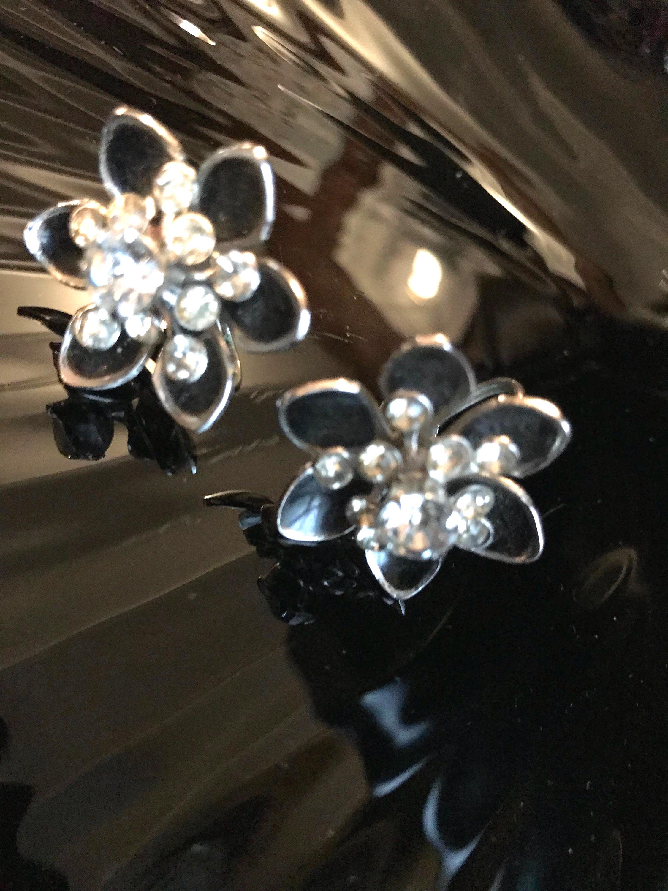 Beautiful CORO Black Enamel & Rhinestone Silver tone Flower Screwback Vintage Earrings, Signed Mid Century Rare Collectible Designer Jewelry