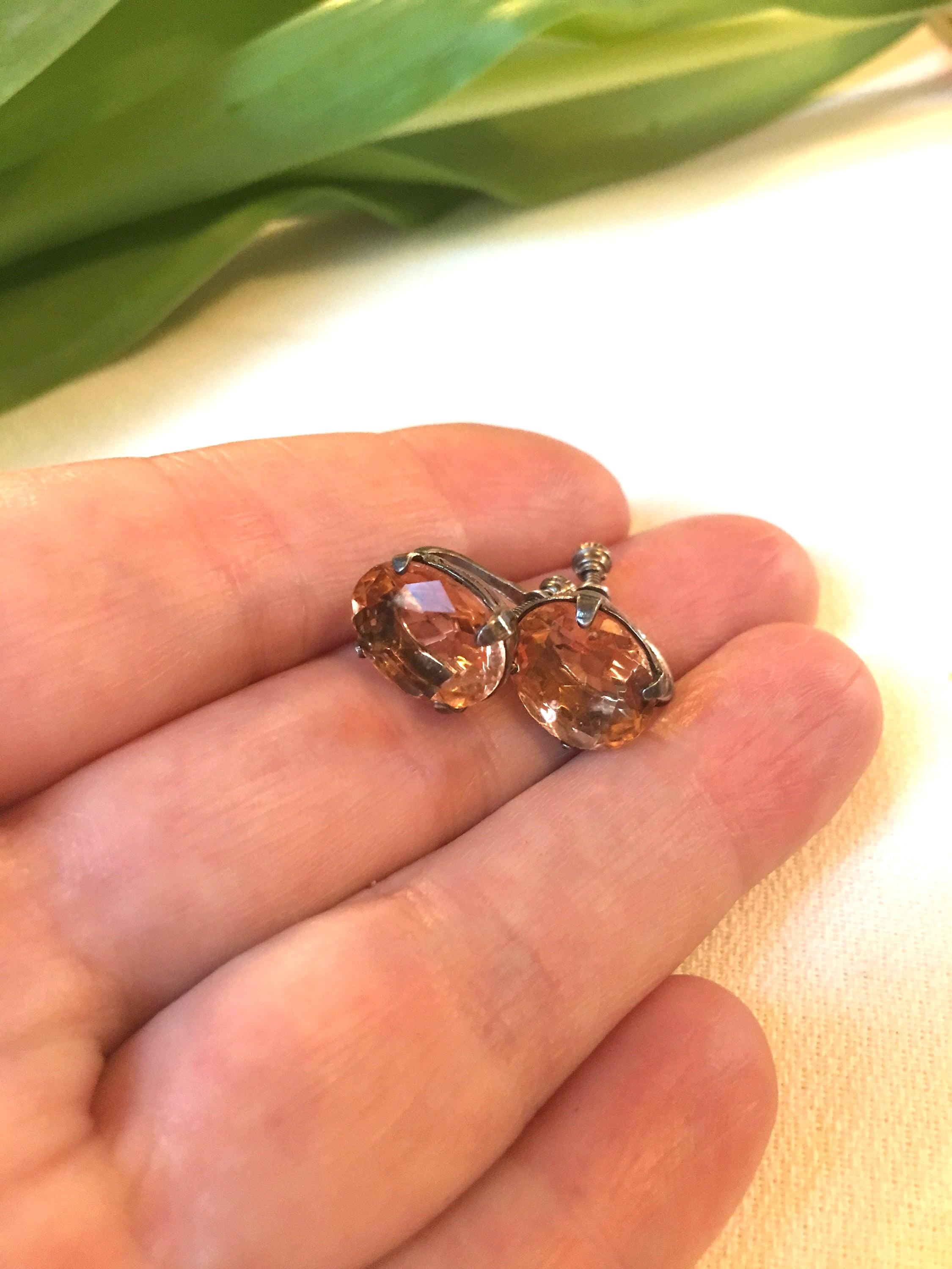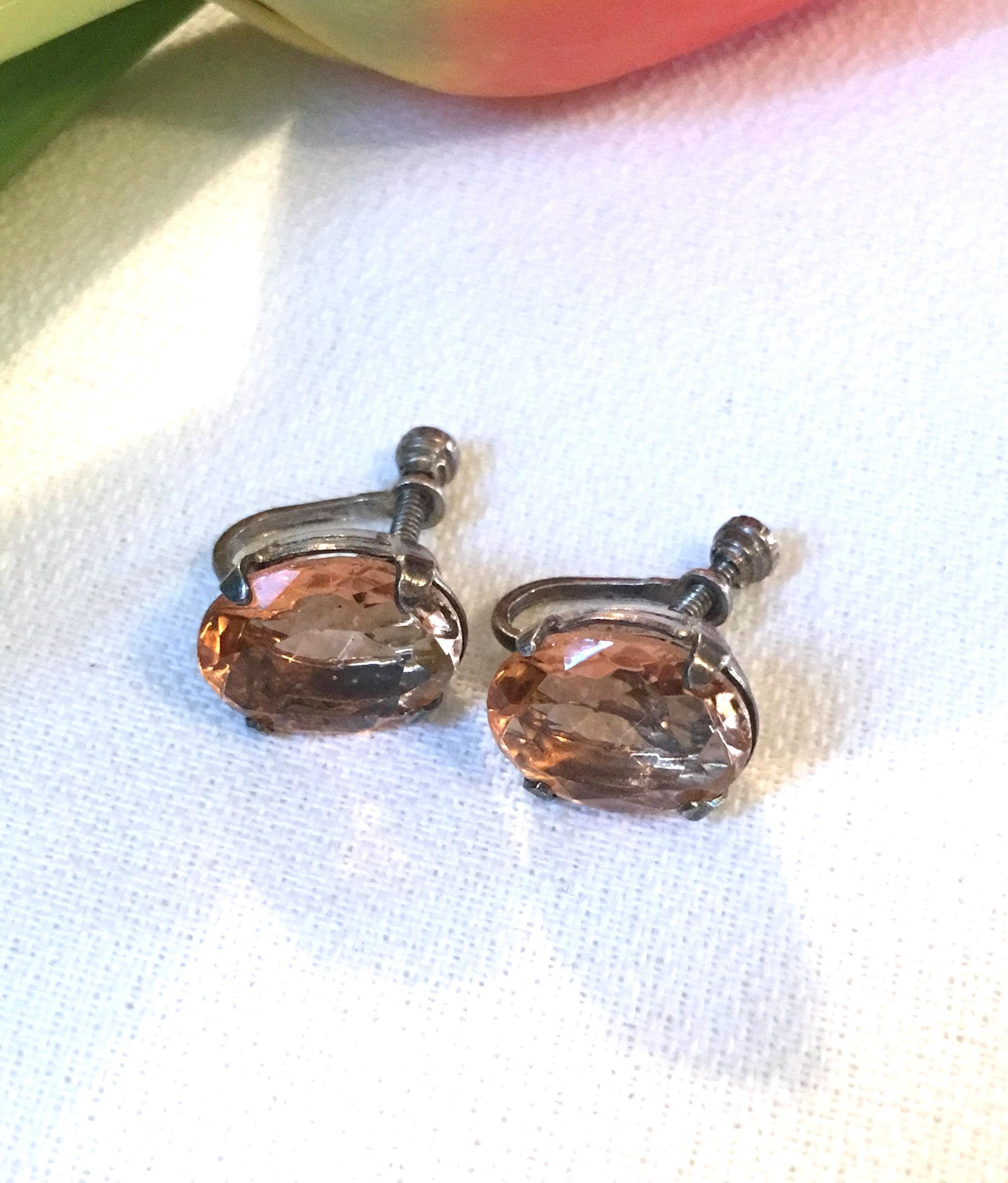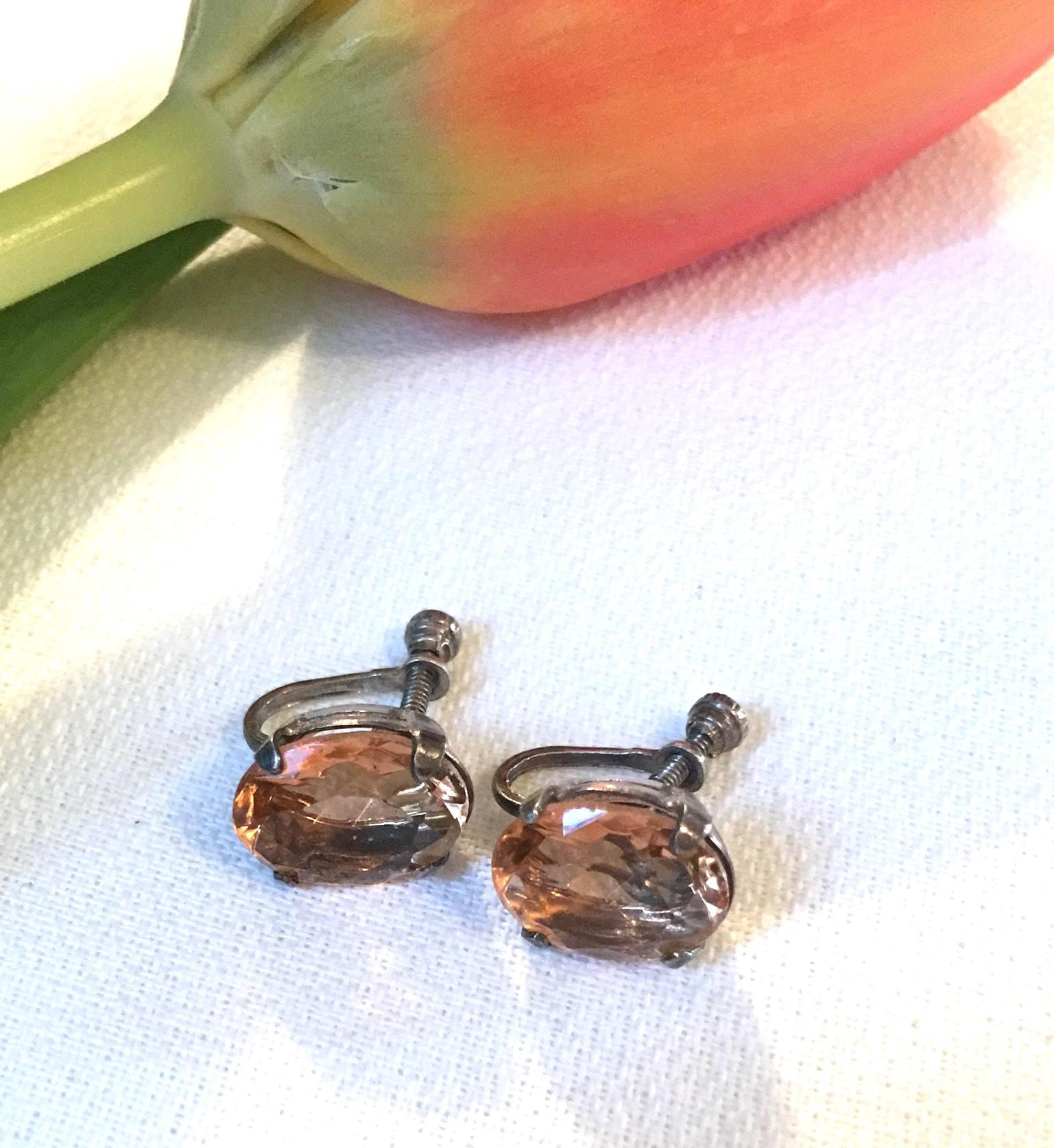 Pretty Peach Pinkish Crystal Gem Vintage Rhinestone Earrings, Elegant 40s-50s Date Night Prom Silver Screw Backs, destined to be cherished!