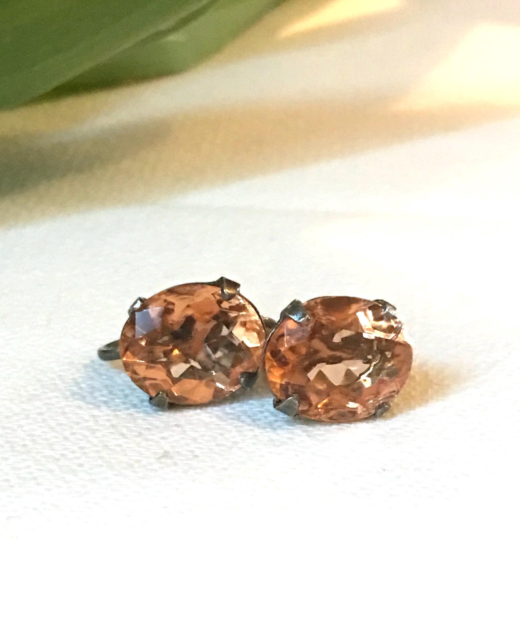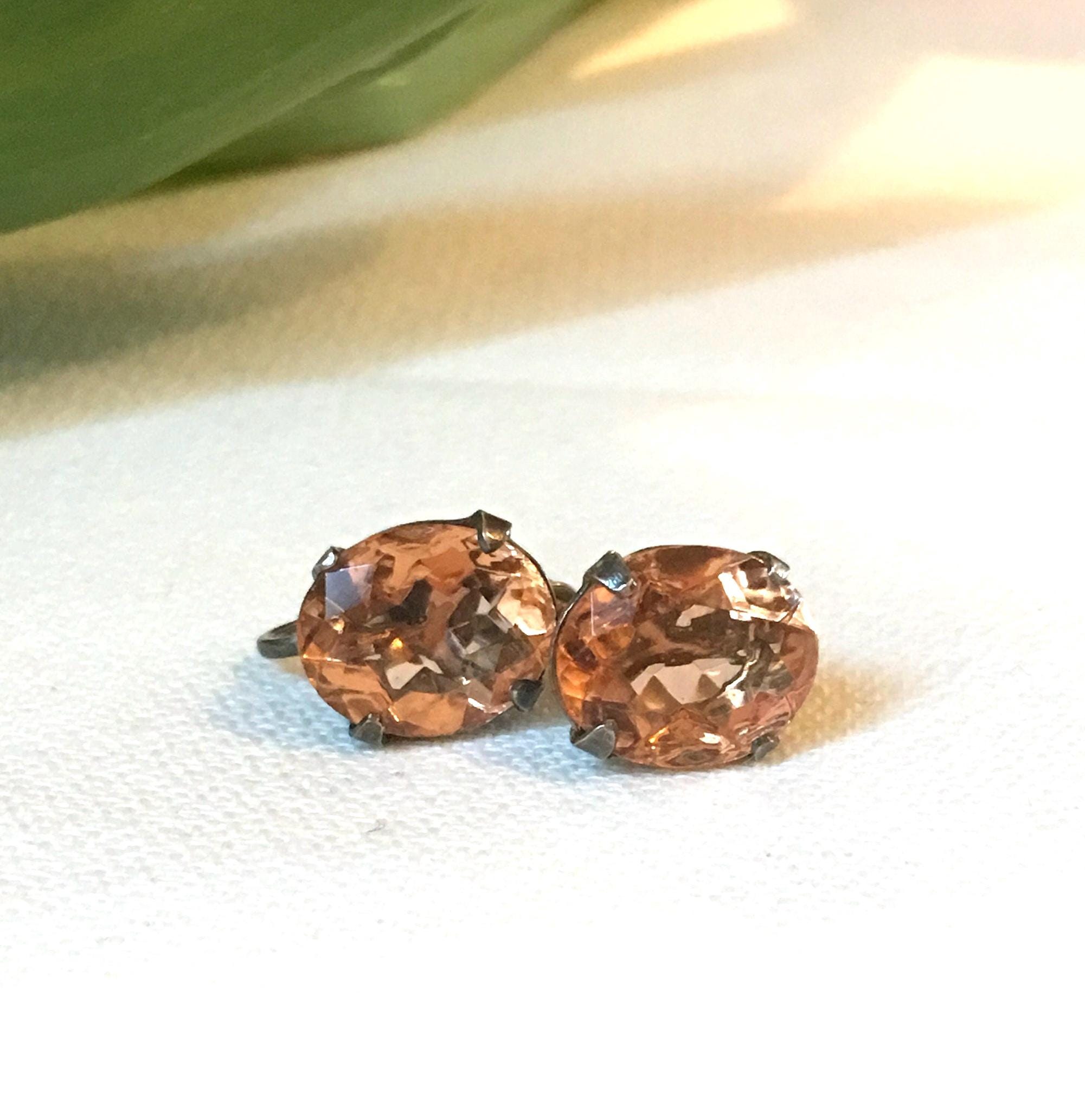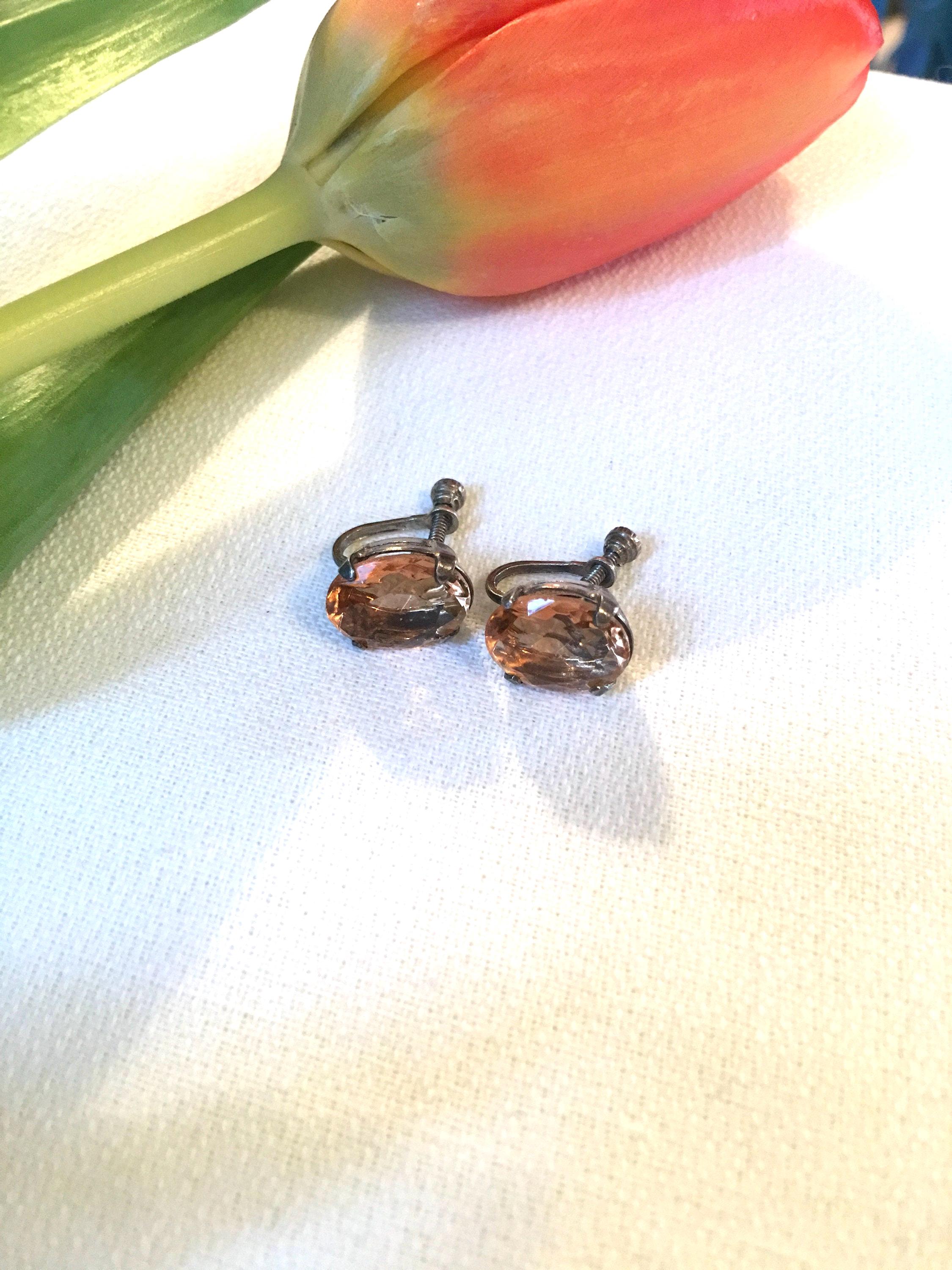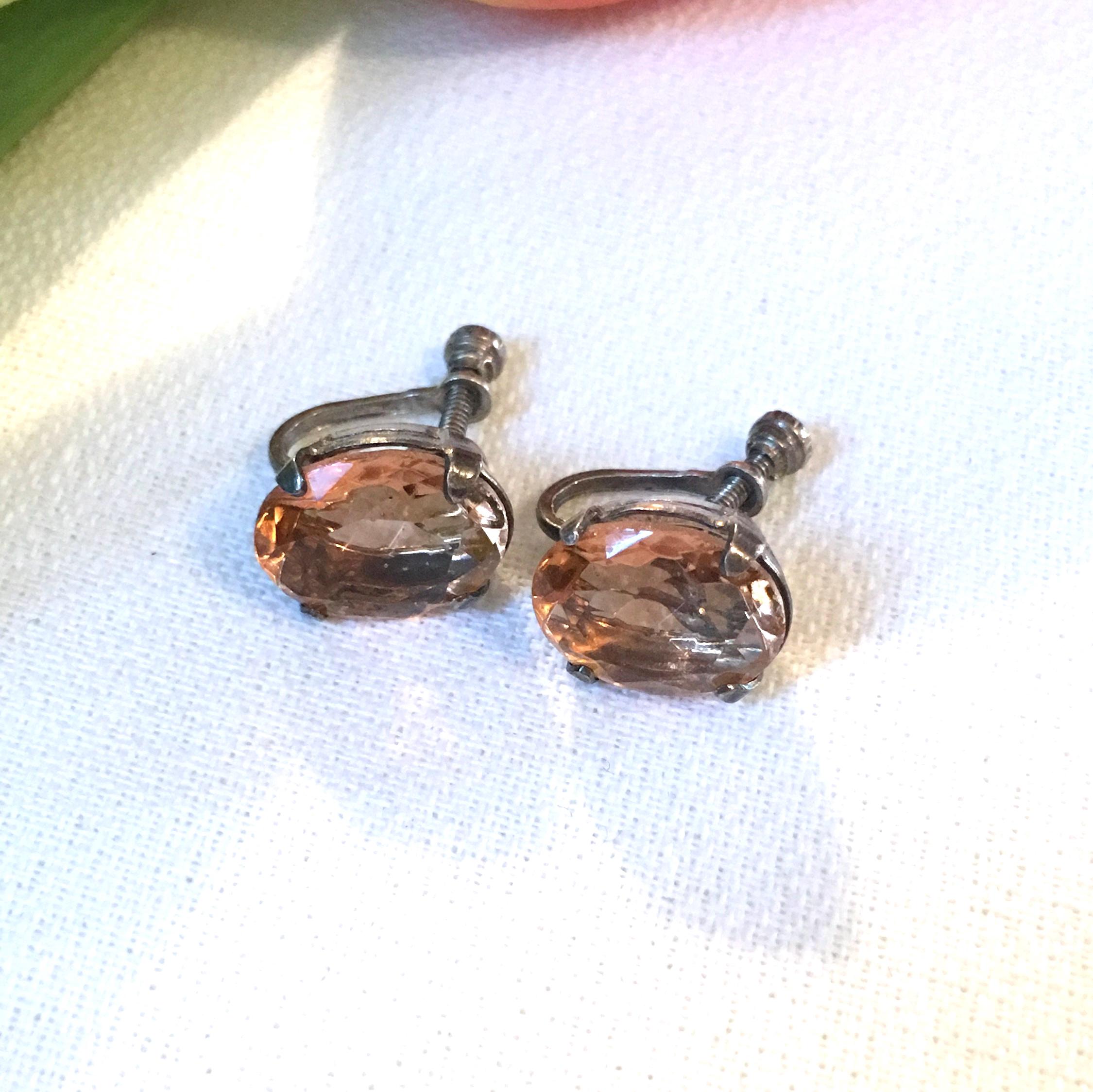 Pretty Peach Pinkish Crystal Gem Vintage Rhinestone Earrings, Elegant 40s-50s Date Night Prom Silver Screw Backs, destined to be cherished!