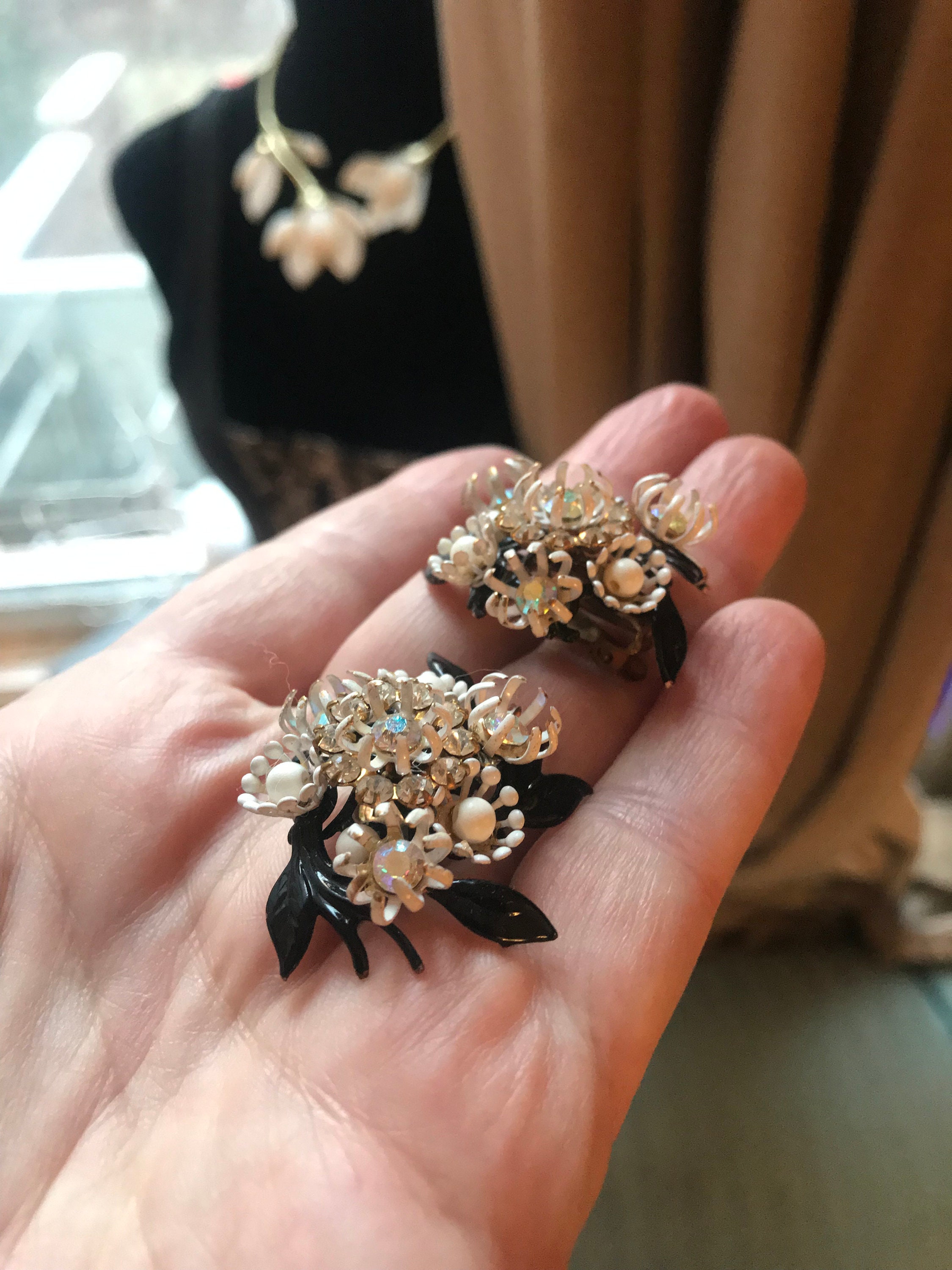 Elegant Hollywood Regency White on Black Floral Bouquet Clip on Vintage Earrings