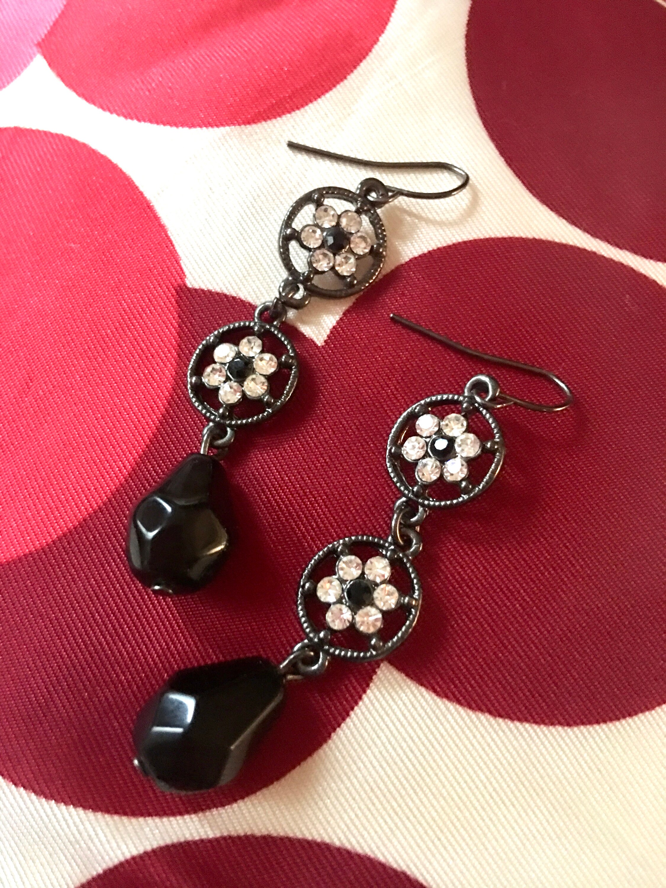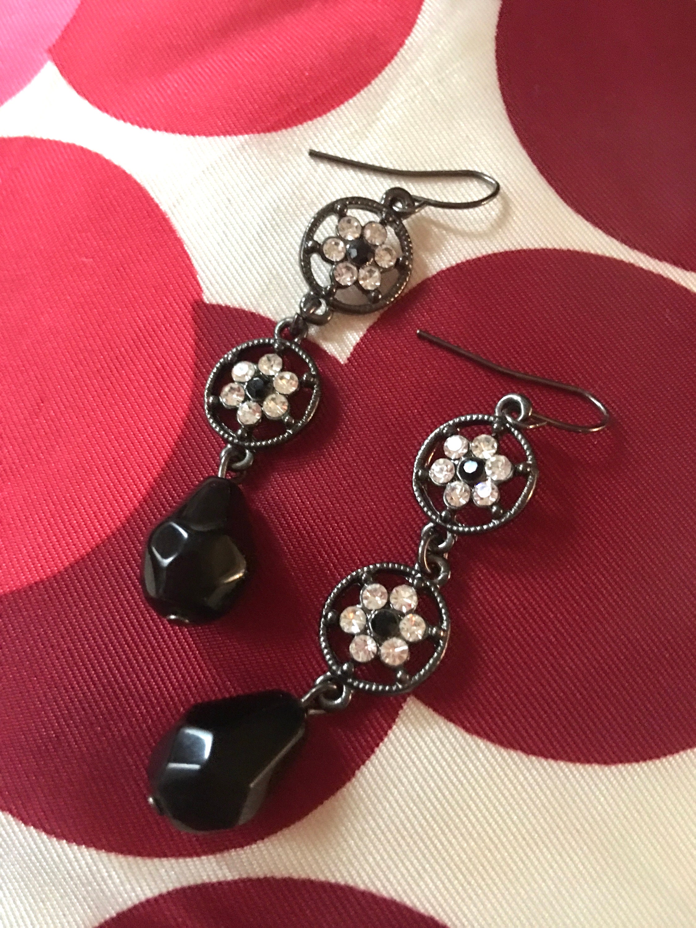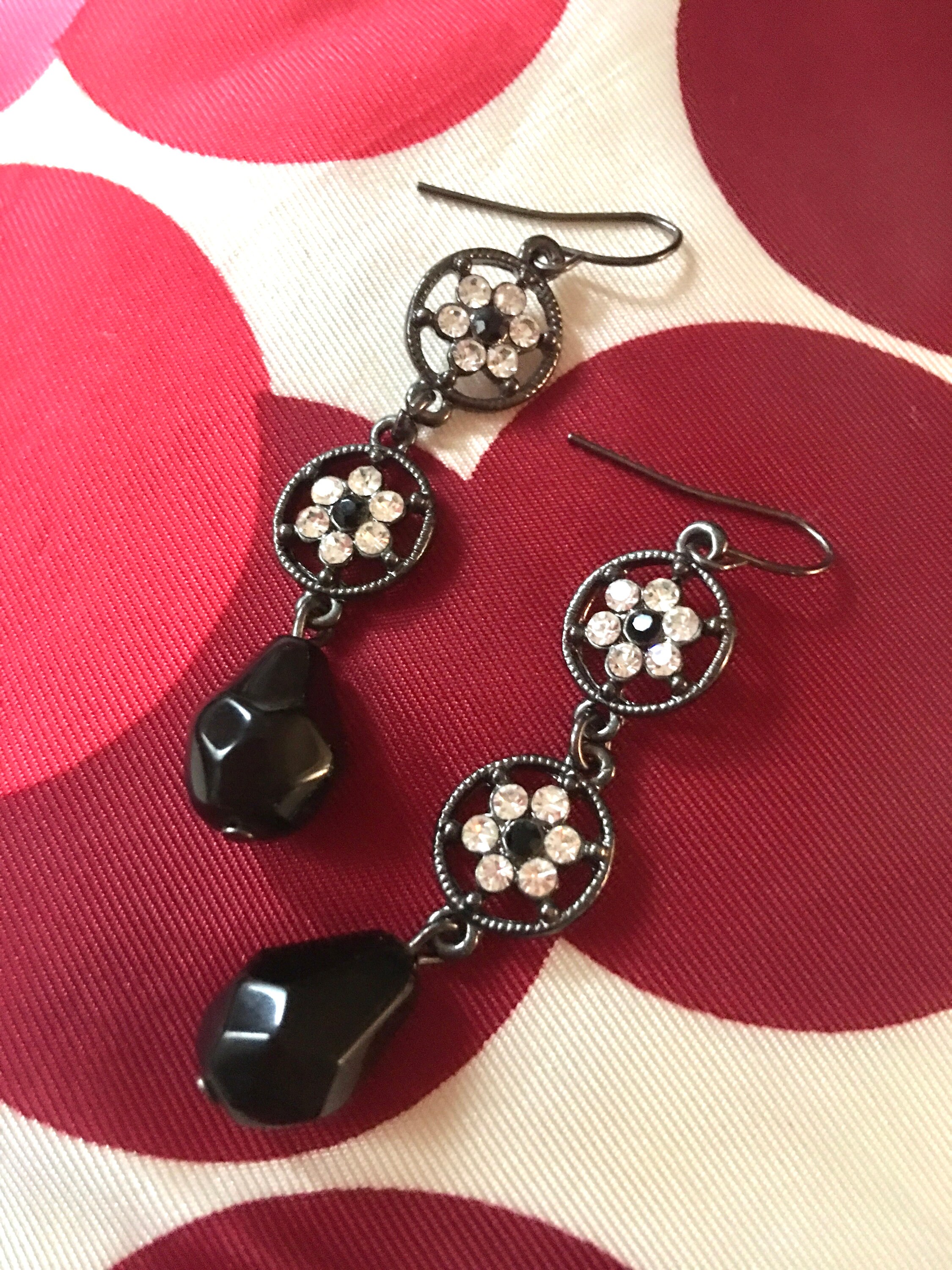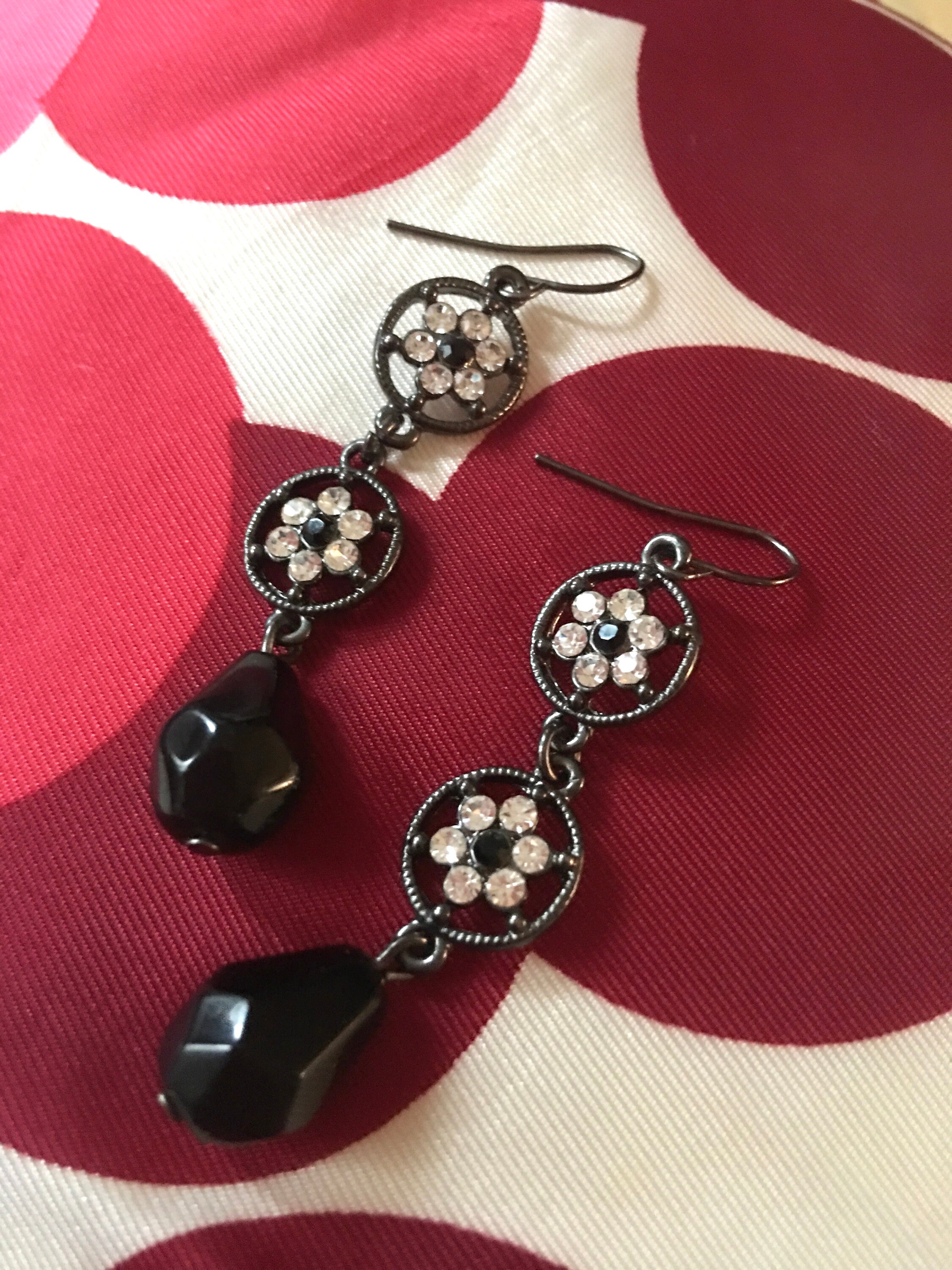 Openwork Gunmetal Earrings With Ice Rhinestone Flowers & Black Teardrop Art Glass Bead floral Dangles