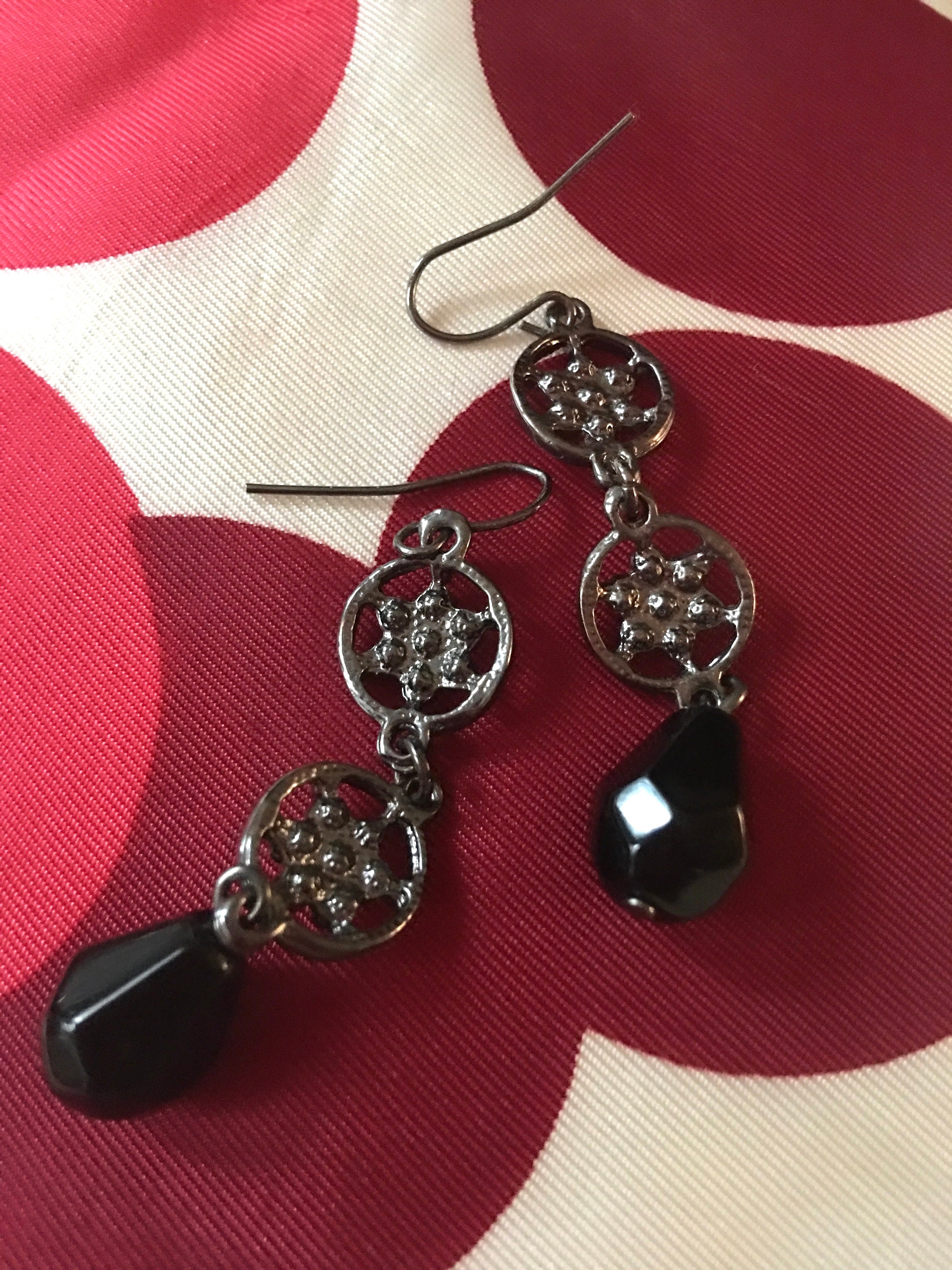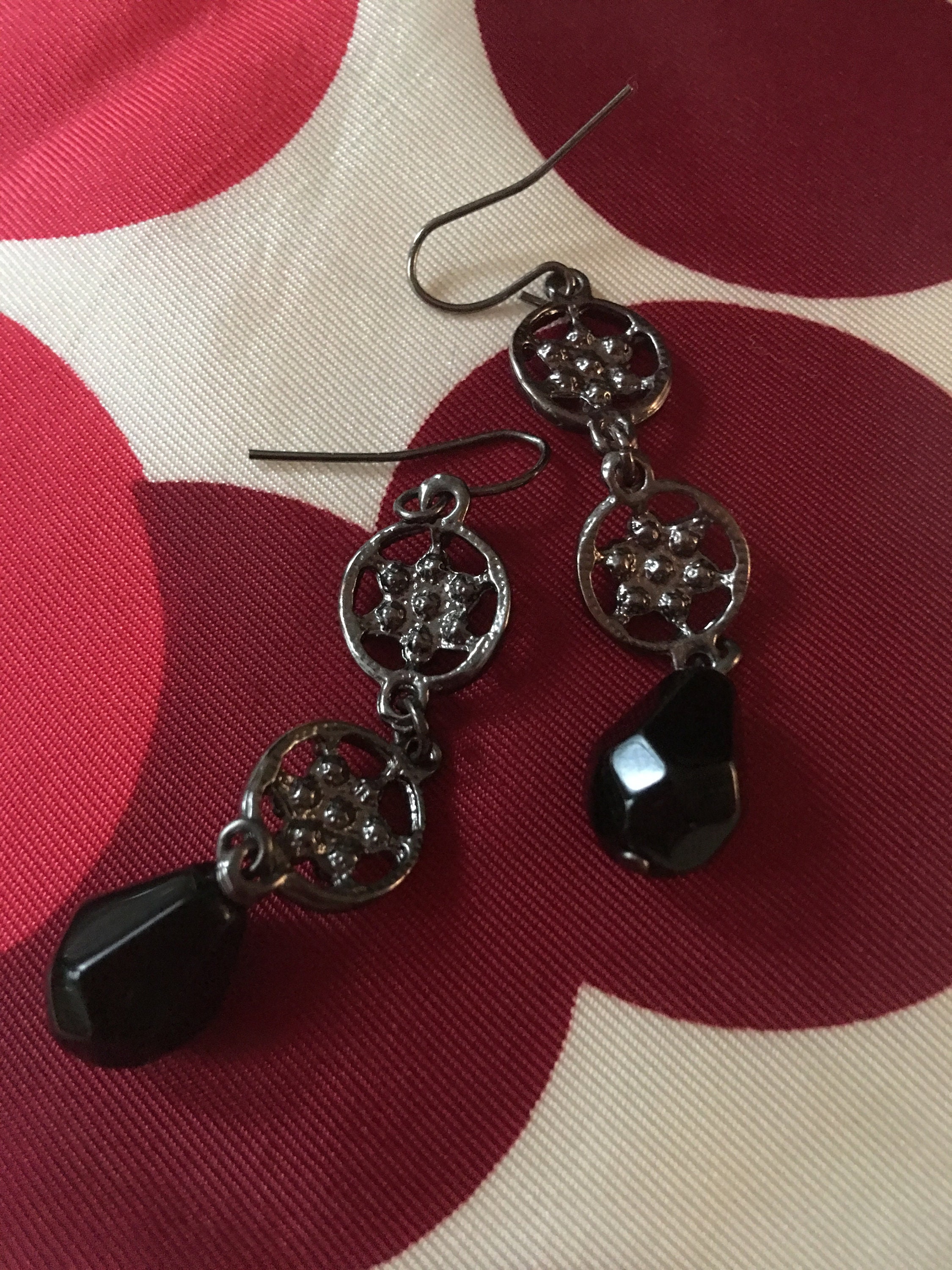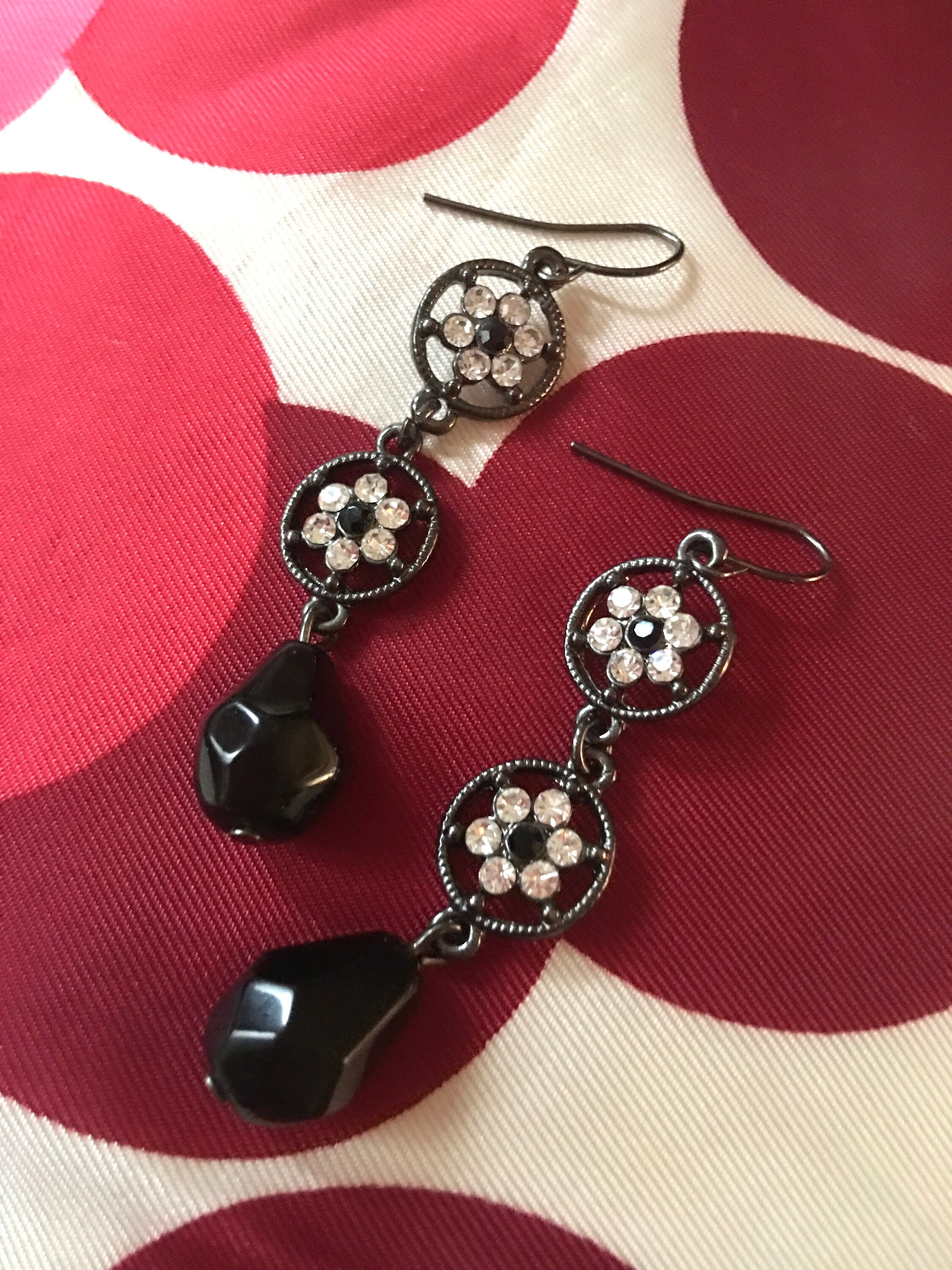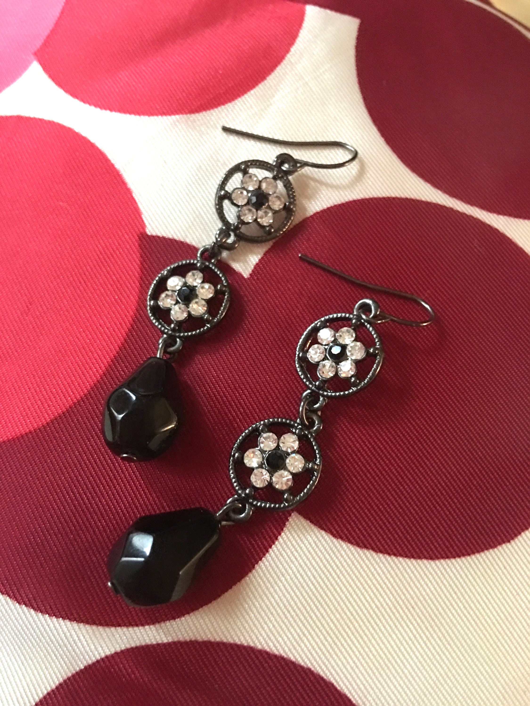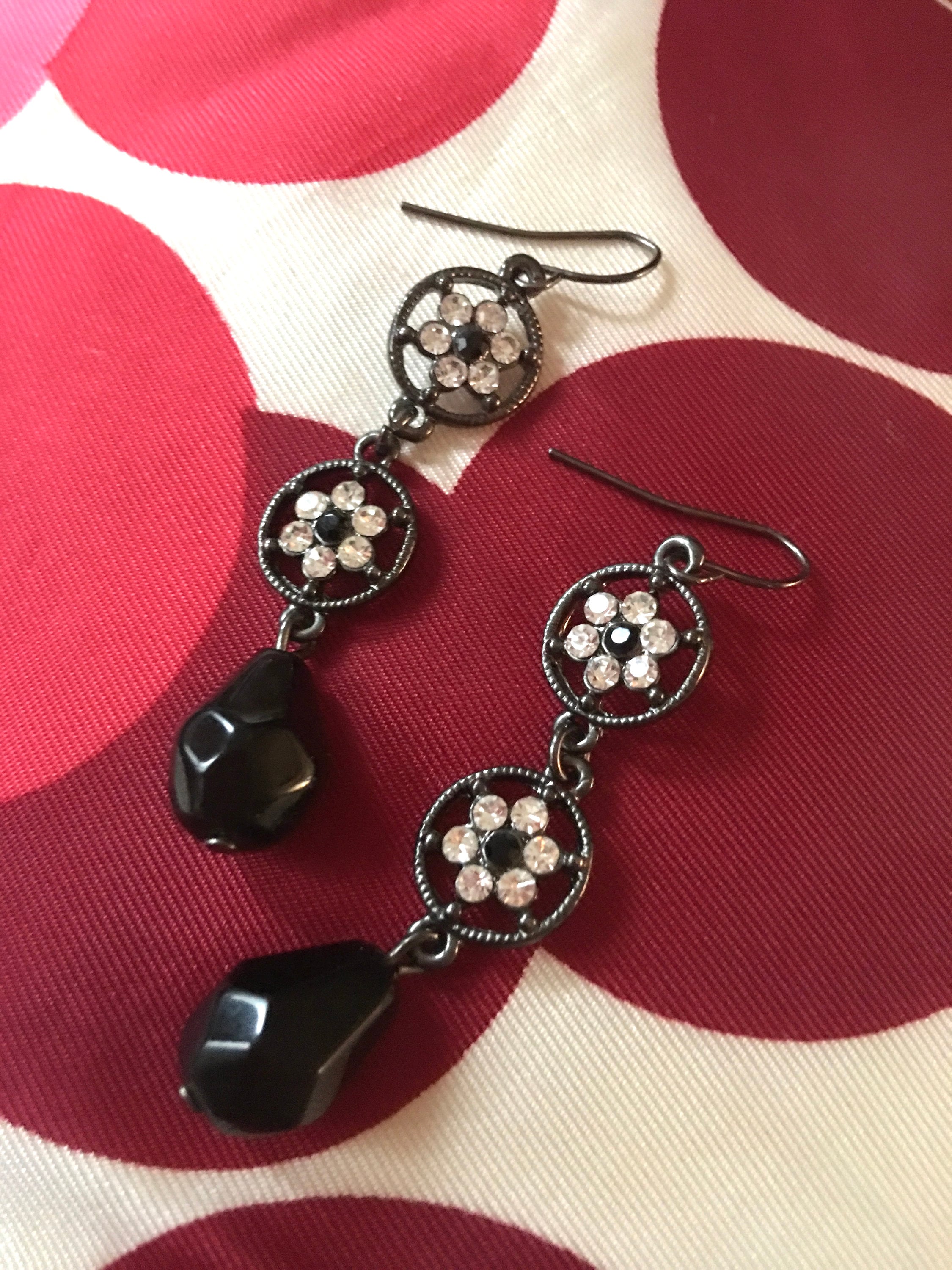 Openwork Gunmetal Earrings With Ice Rhinestone Flowers & Black Teardrop Art Glass Bead floral Dangles