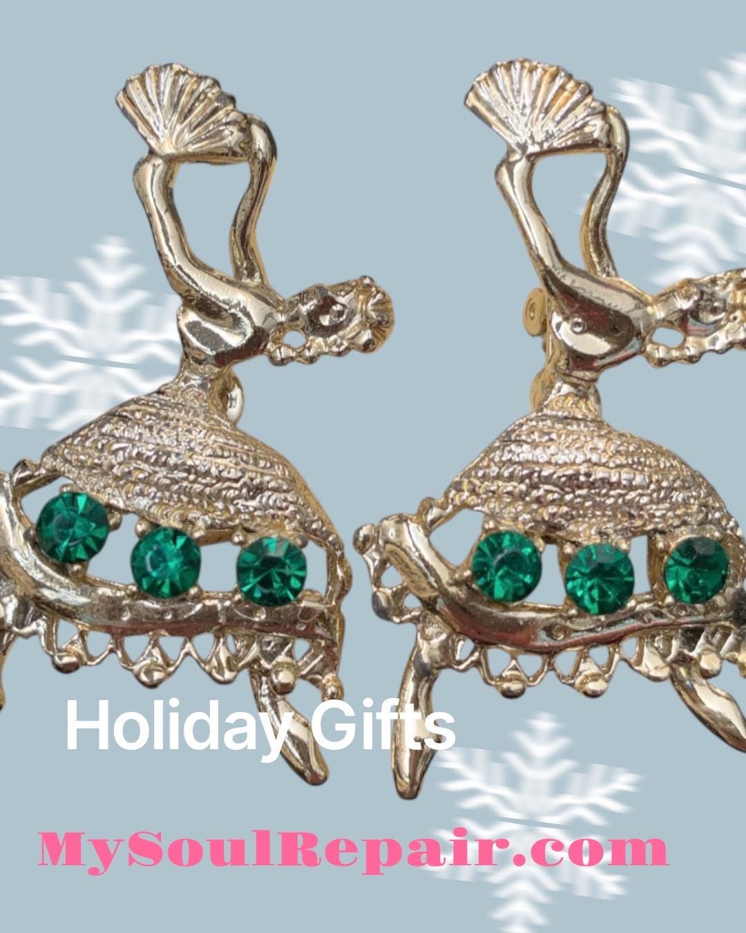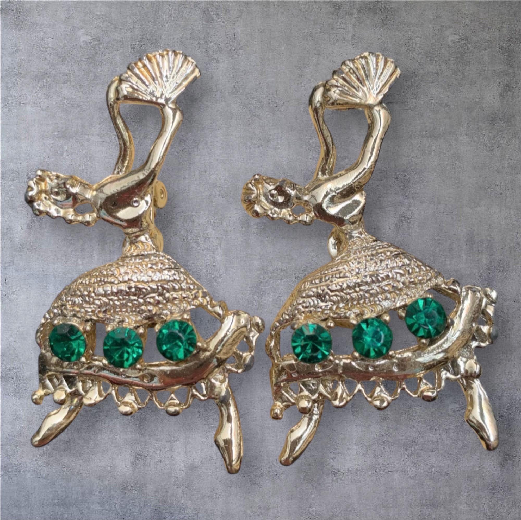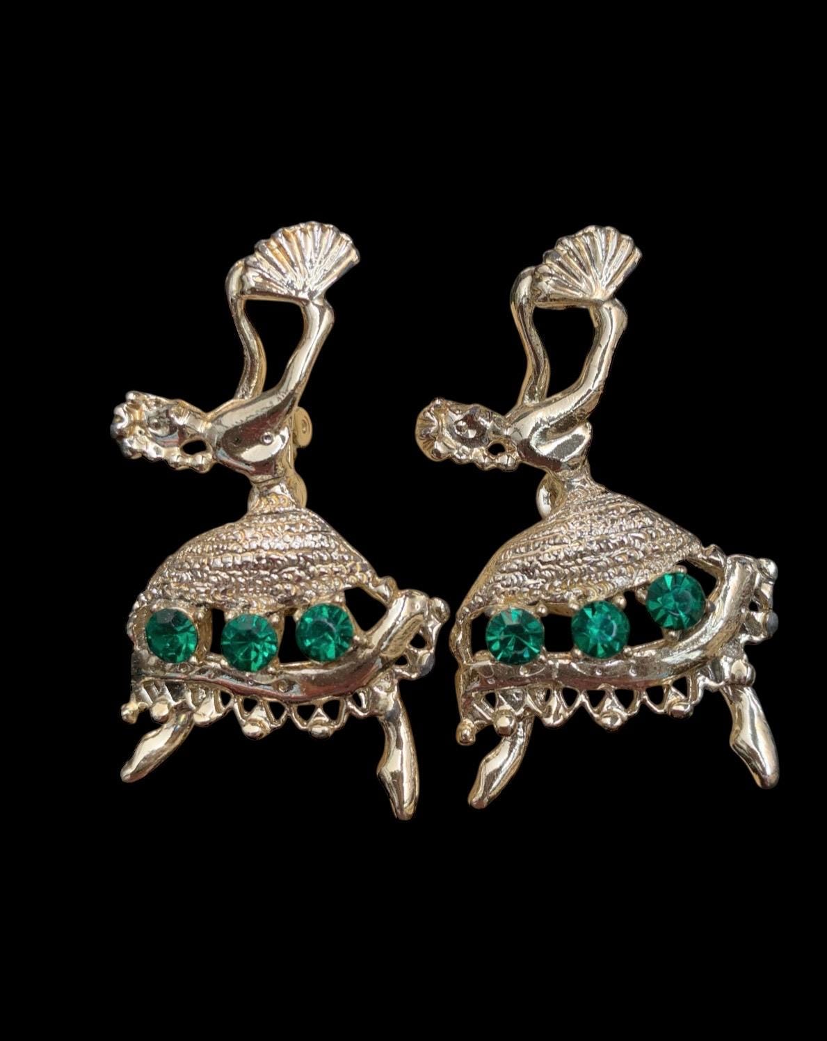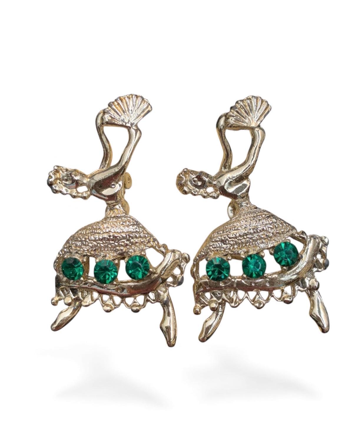 Green Rhinestone Fan Dancers pair of Scatter Pins, Silver tone & green Rhinestone Mid Century Spanish Dancing Lady Brooches, Festive Unisex Lapel Pins