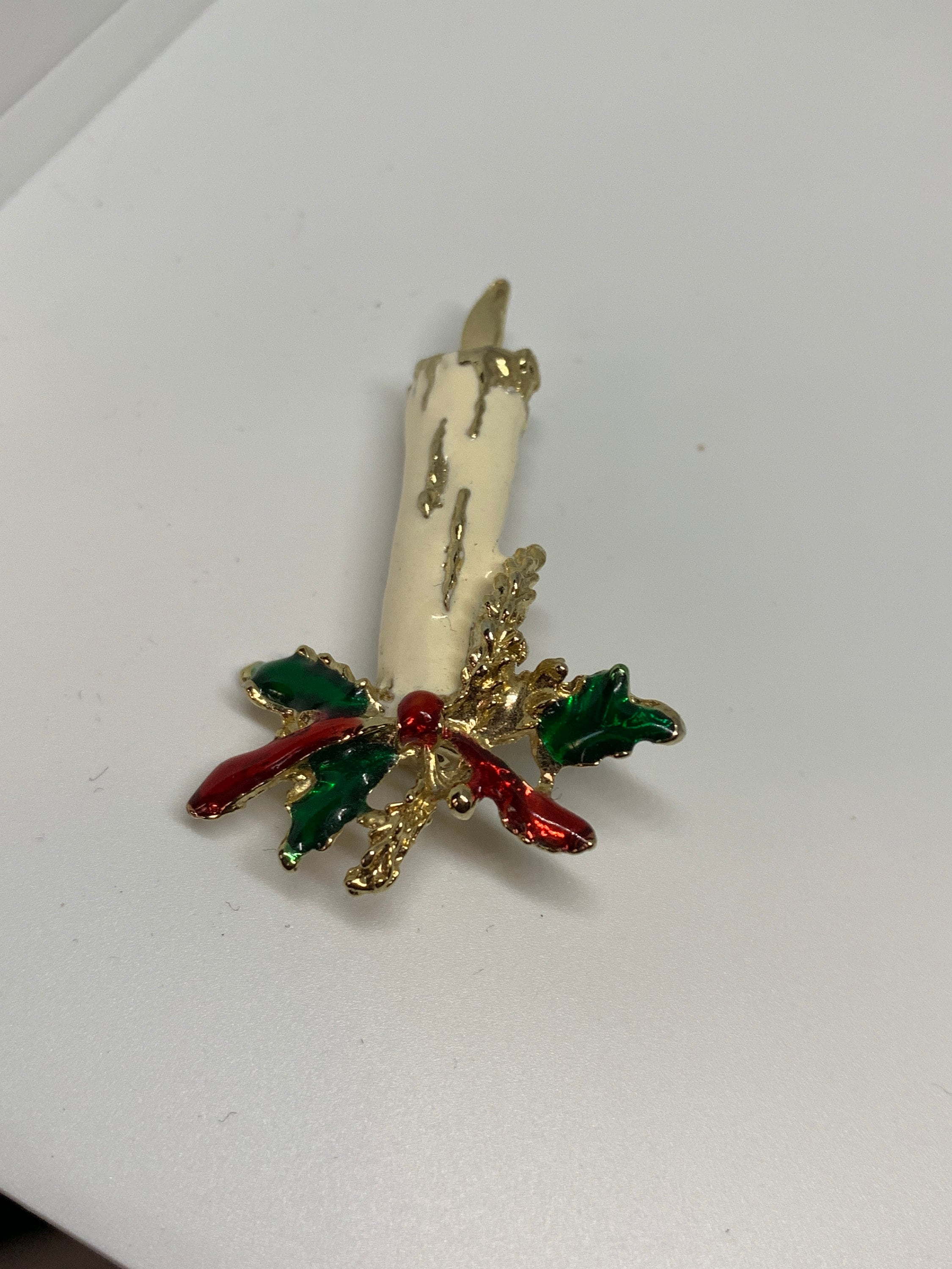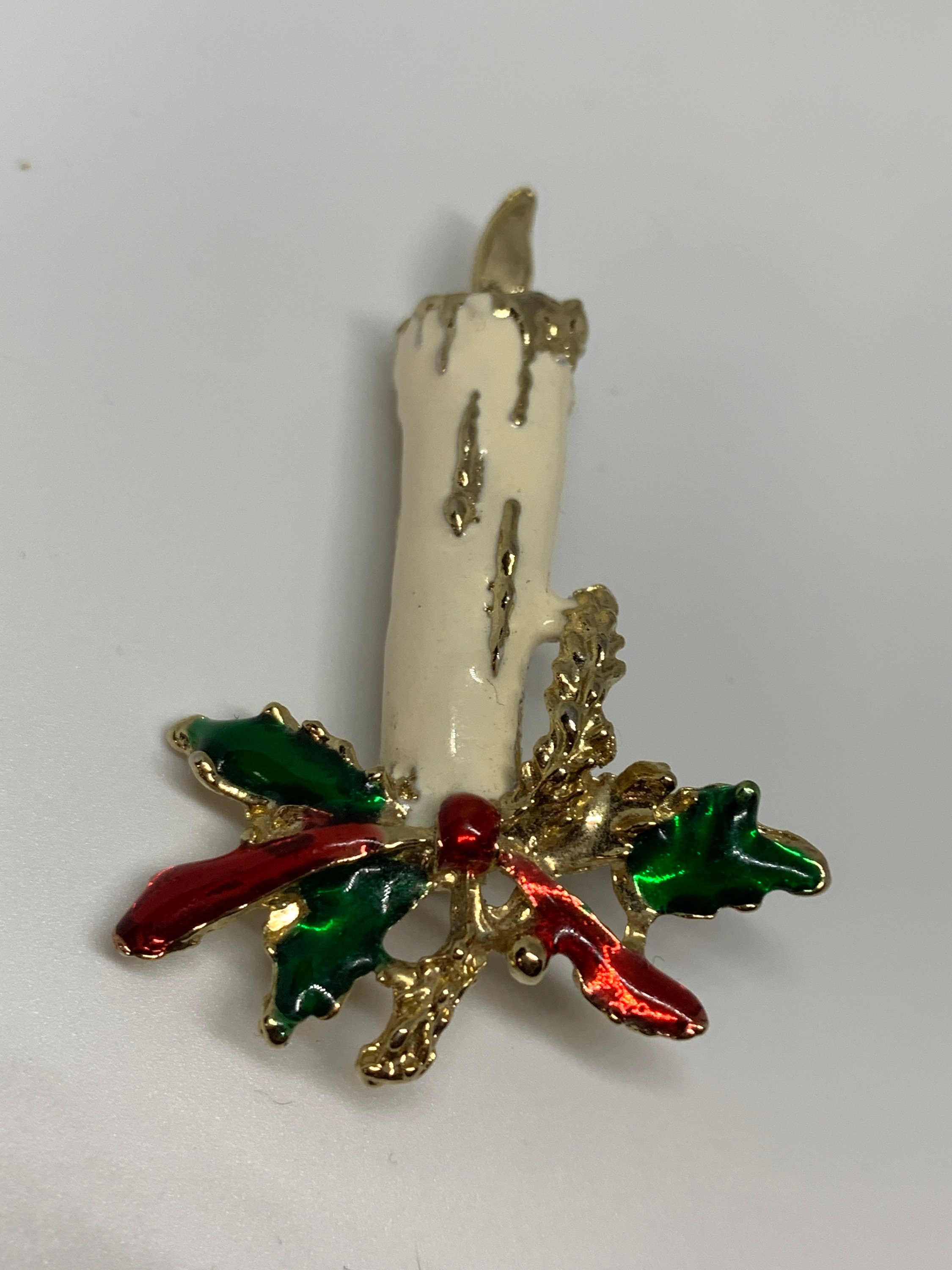 Vanilla Cream Christmas Candle Pin With Elegant Red and Green Holly, Nostalgic Vintage Brooch, Winter Holiday Unisex Lapel Pin