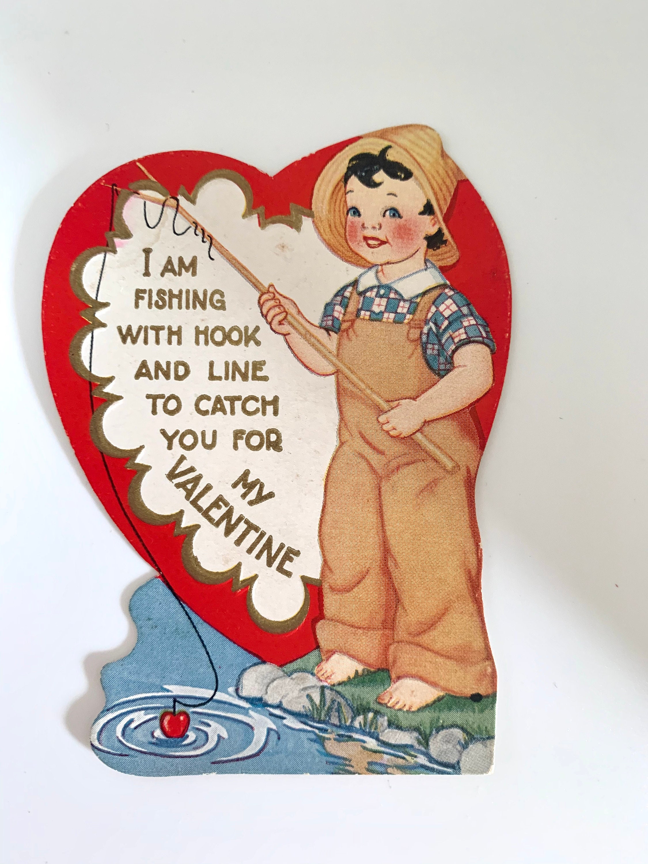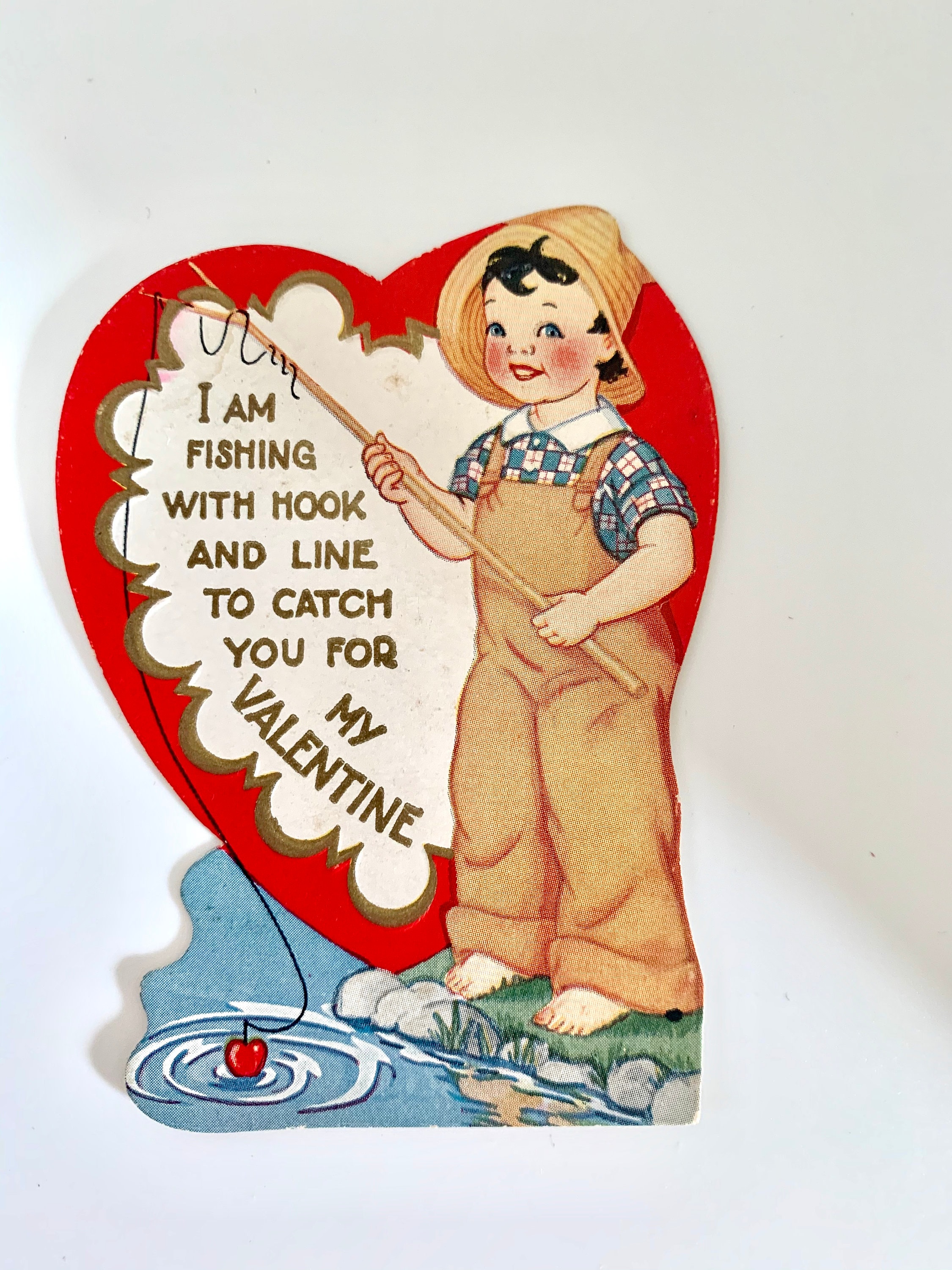 Antique 1930s Fishing to catch you Valentine, Vintage Valentines Day Card, adorable little boy fishing / pole, Holiday scrapbook